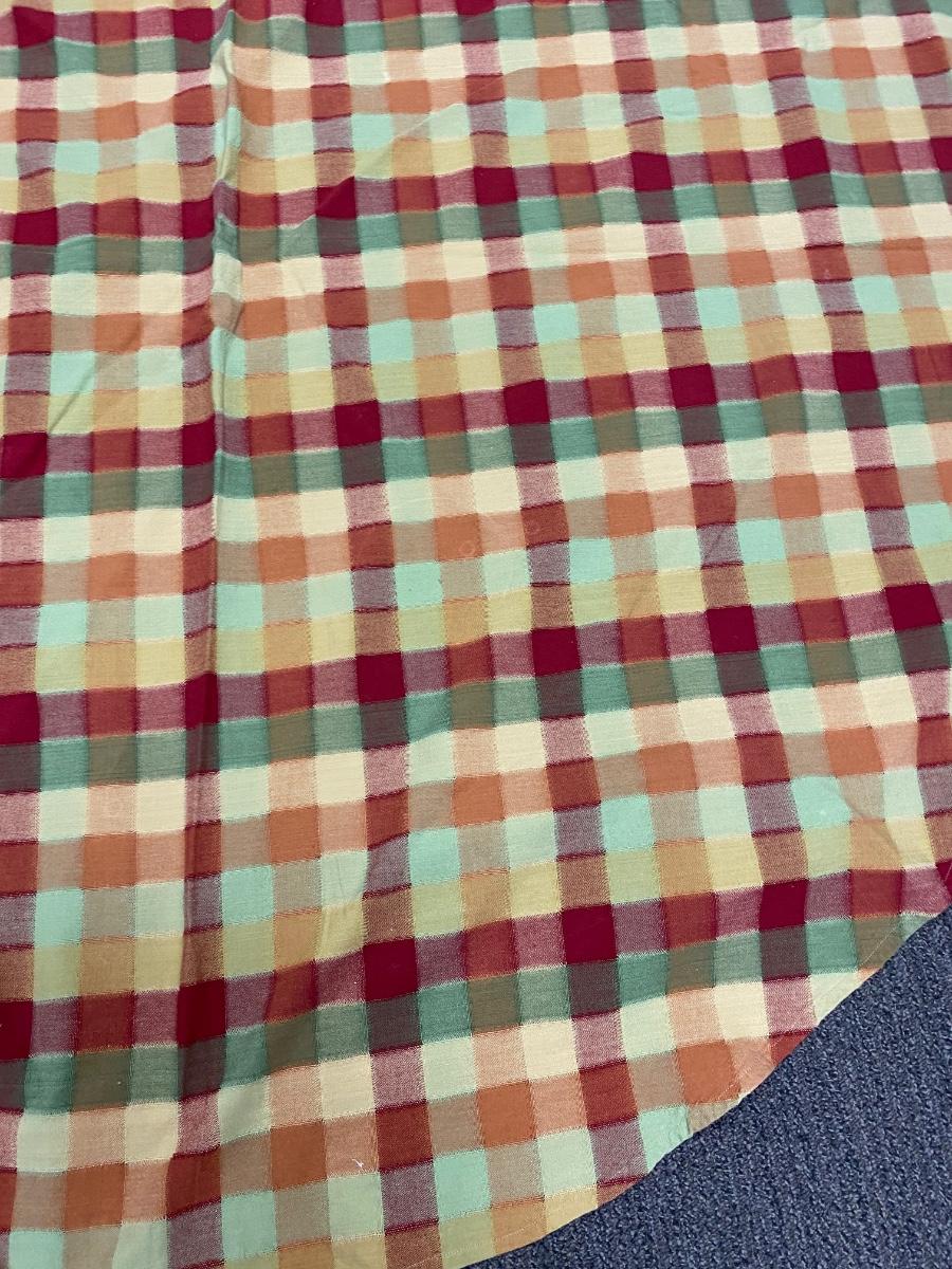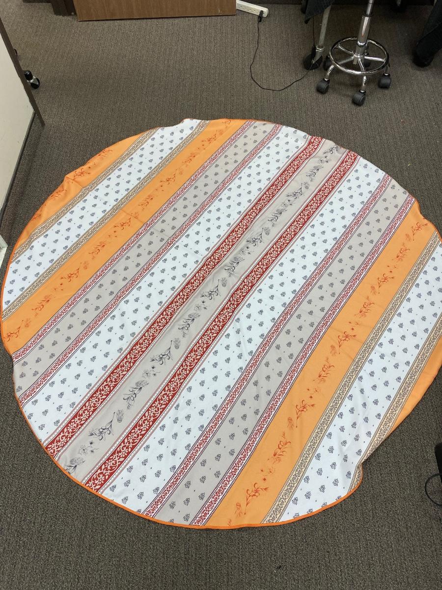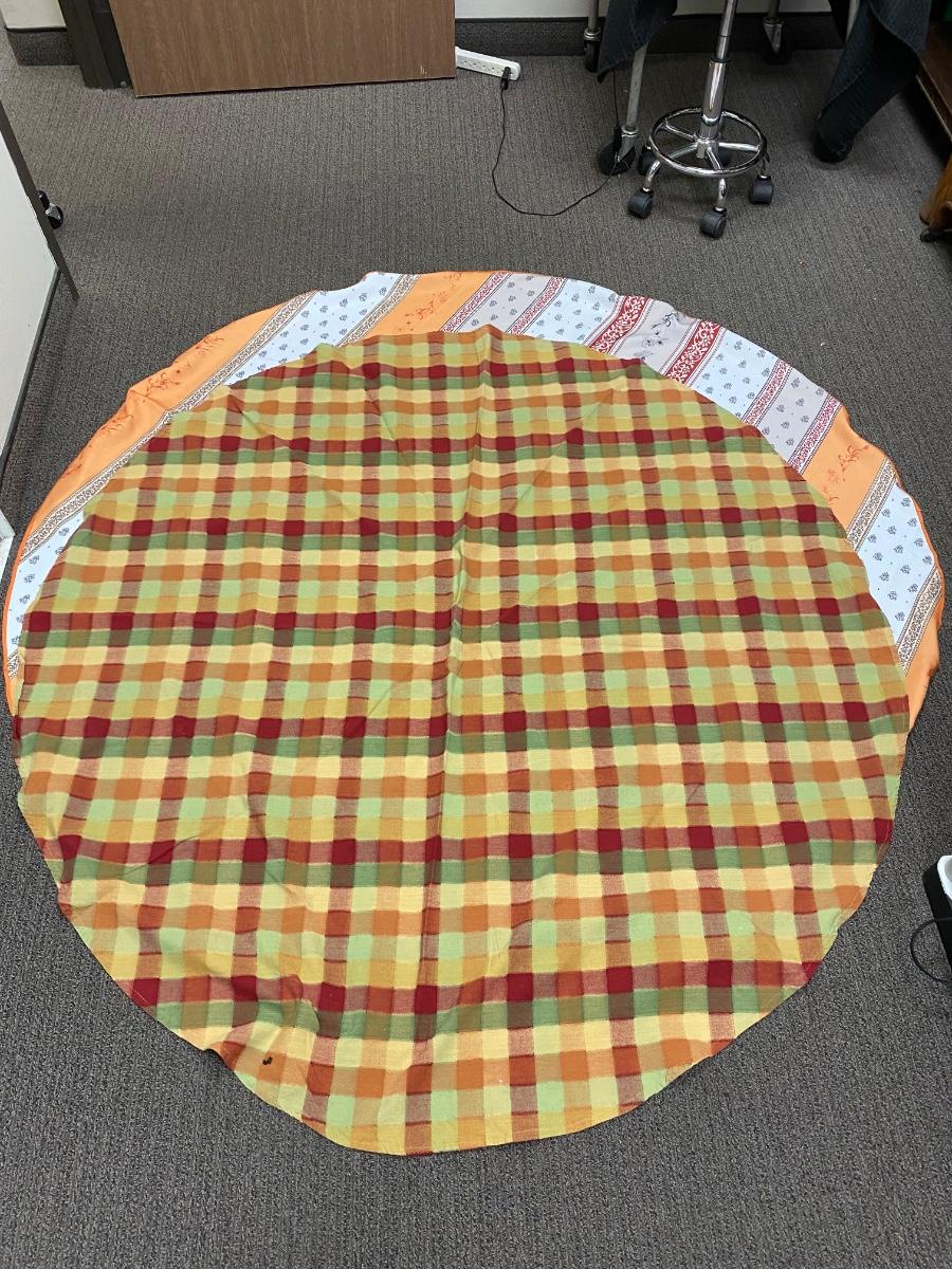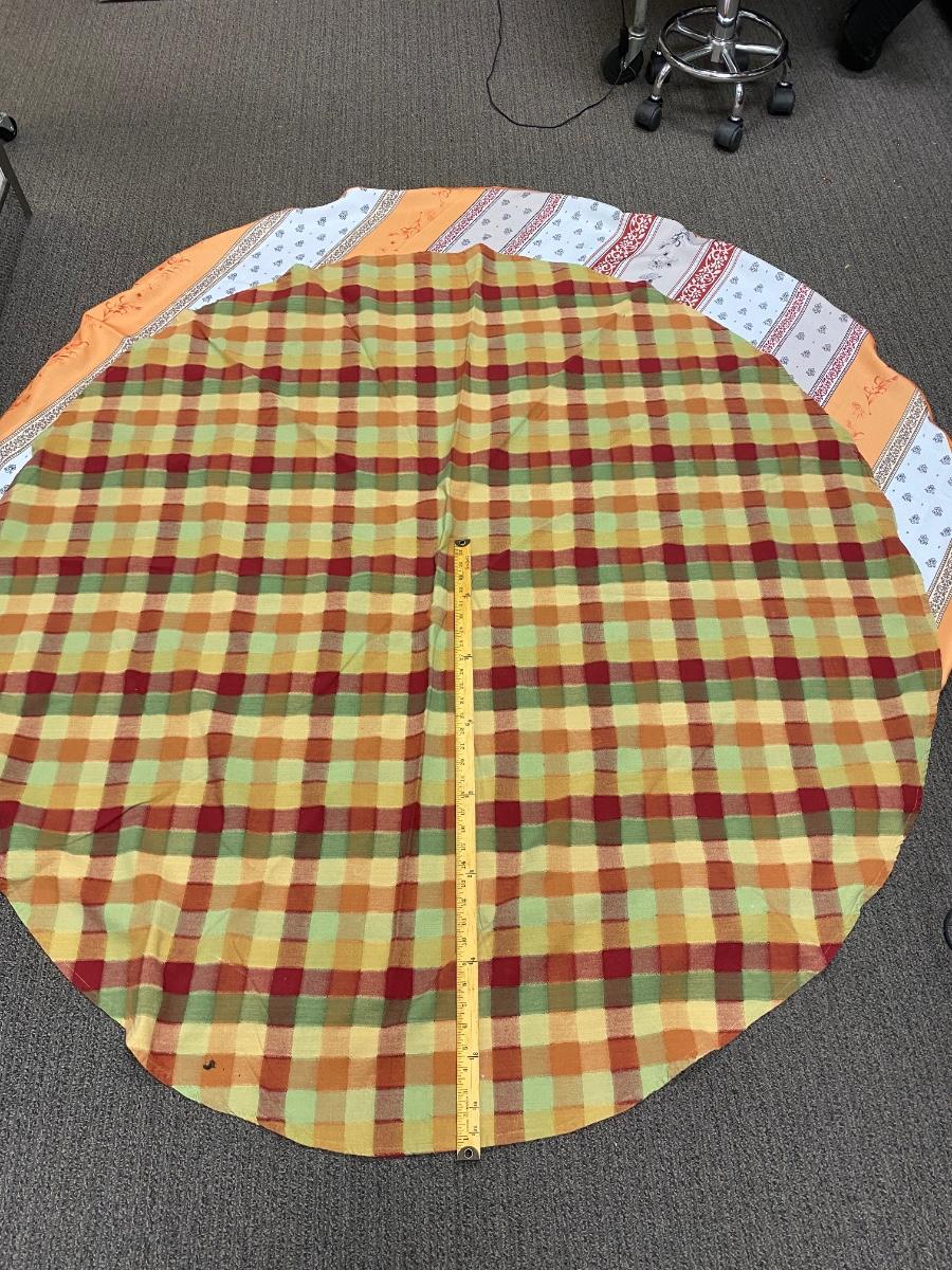 Pair of round tablecloths. One plaid, one decorative stripe. About 5' diameter. Both are in good condition, the plaid one has a spot but looks like it just needs to be washed out.