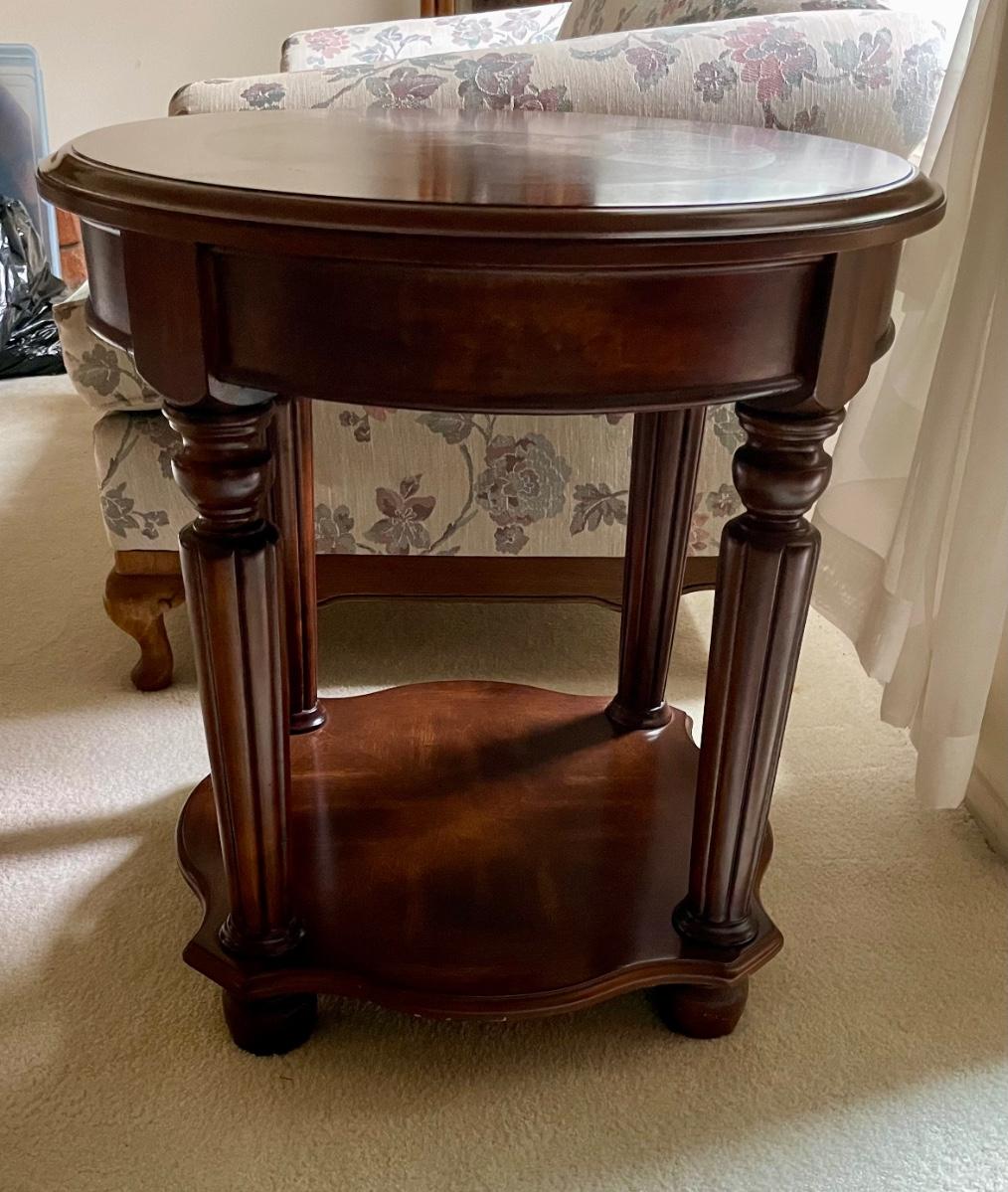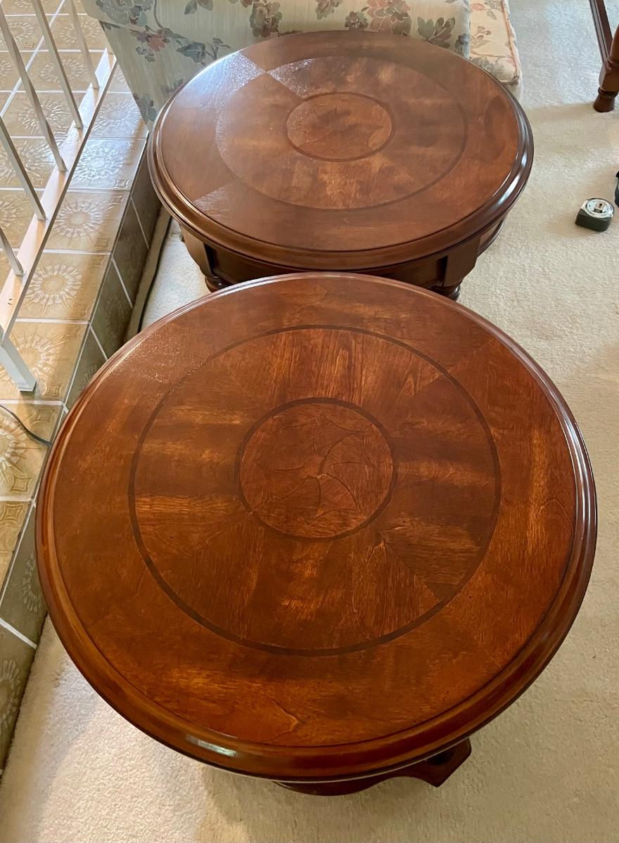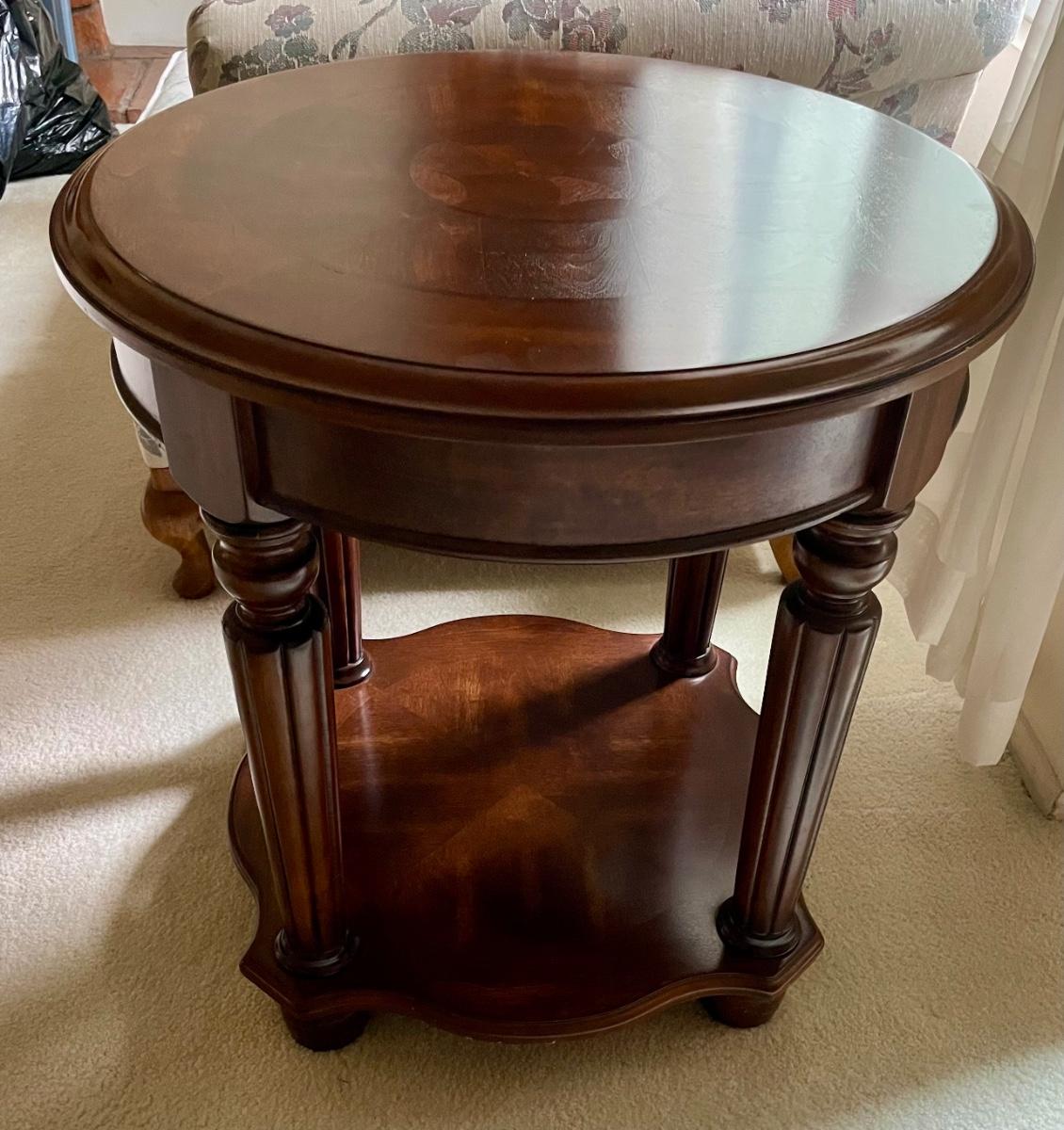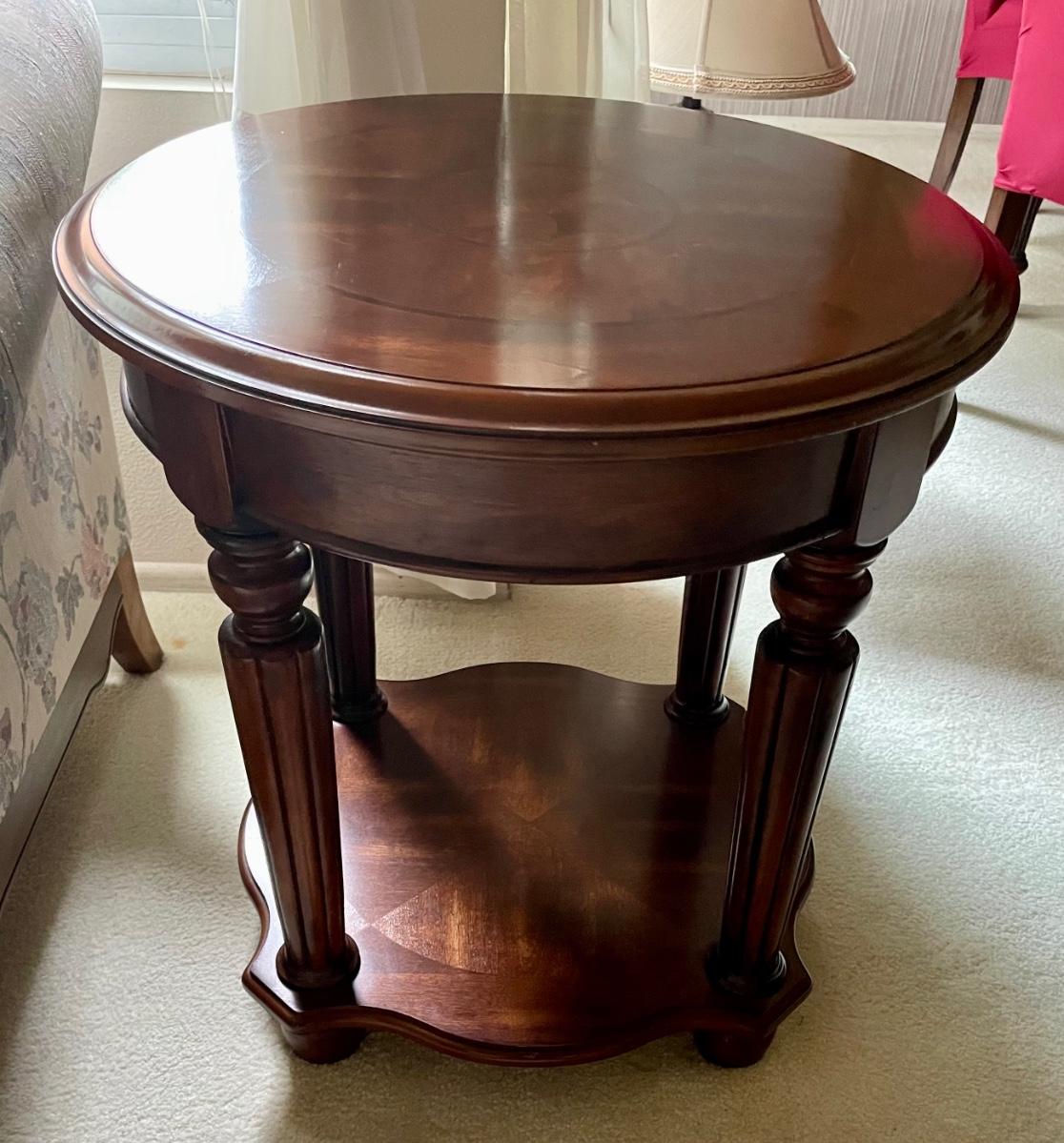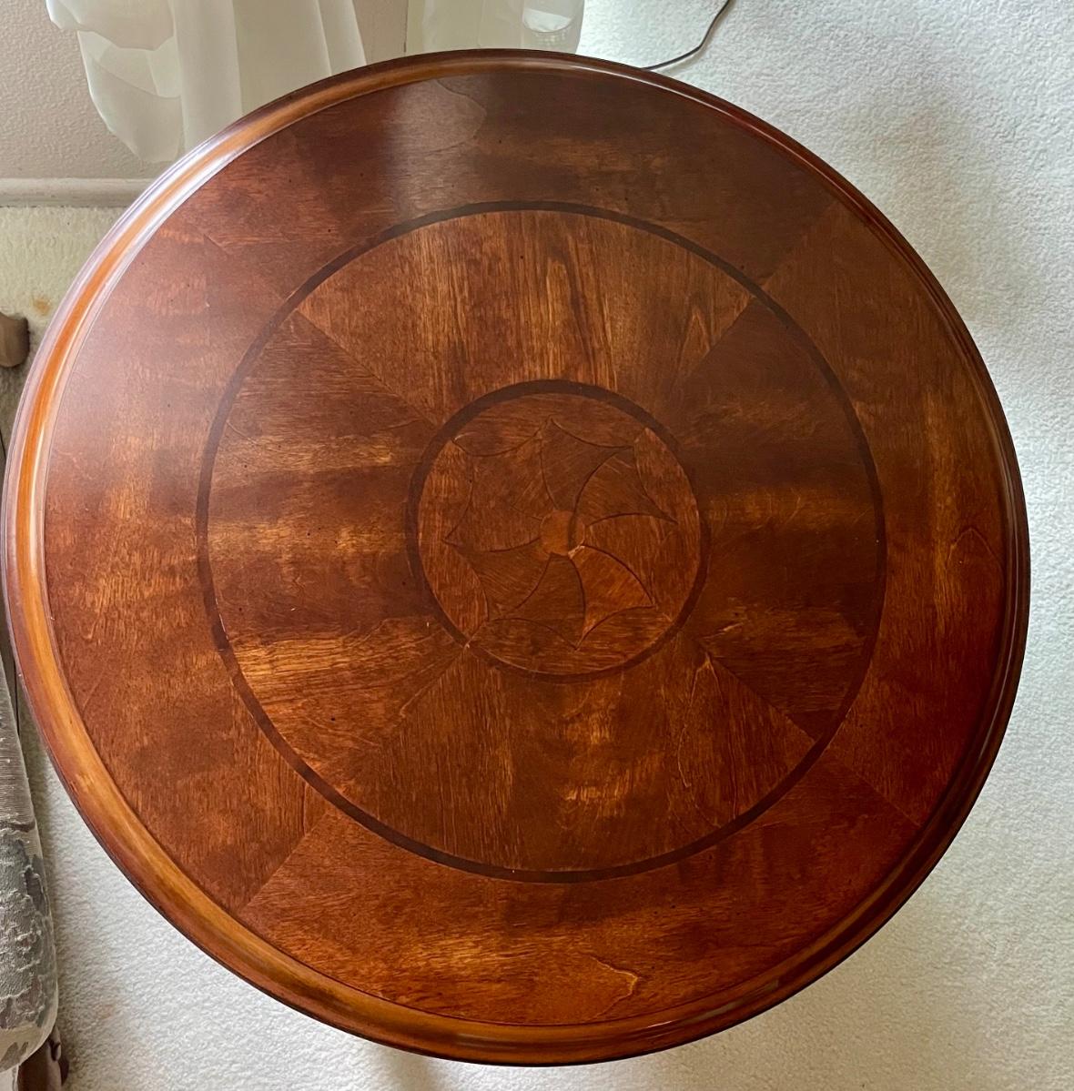 Particle board with wood veneer. Top has an inlaid series of concentric circles. Top is approx. 24” across. is 25” tall. Made in China. Another auction item in this sale is the matching coffee table.