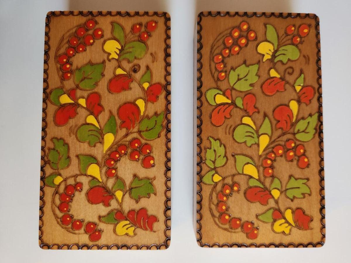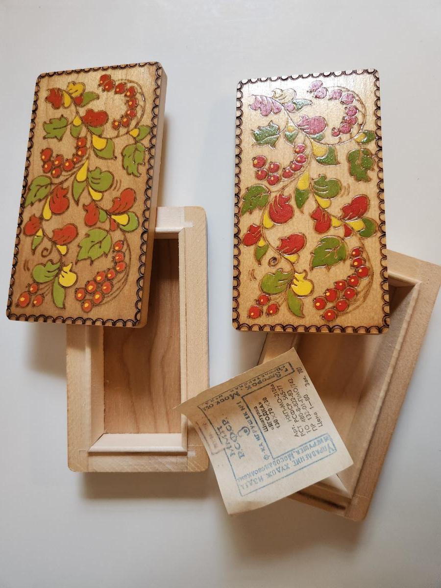 This auction lot is for a Pair of Russian Tourist Boxes. These identical wooden boxes have been hand decorated and adorned with a wood-burning technique. Perfect for household decor or most any use. See photos for sizing.