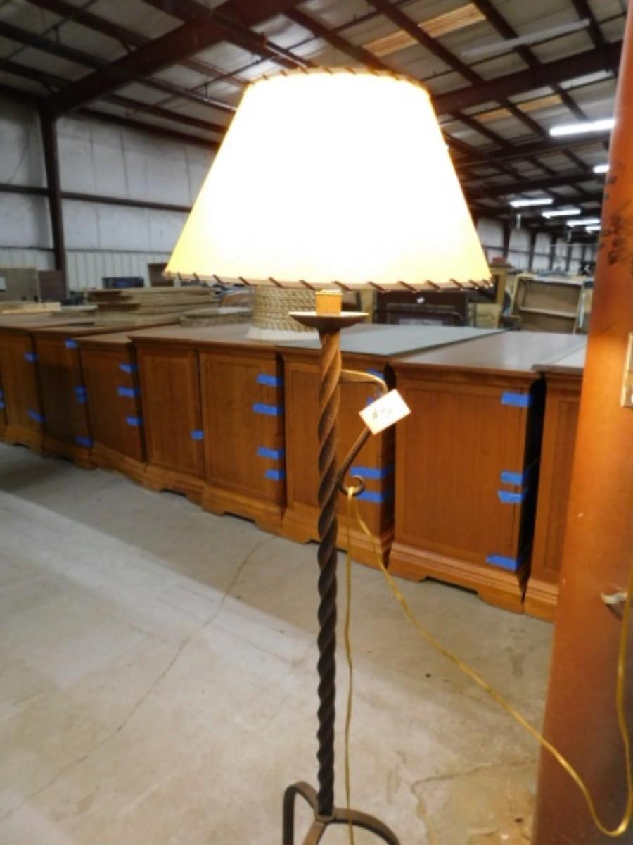 Pair of Rustic Wrought Iron Twist Post Tri-Ped Base Floor Lamp with Shade Bidder is buyer 2 units. Expect some wear or scratches to the finish. Shipping option available via freight or local mover at Buyer's expense. Buyer must have all shipping scheduled within the stated dates and times of pickup. Recommended local mover is Beaty Bros. Moving 828-201-2982