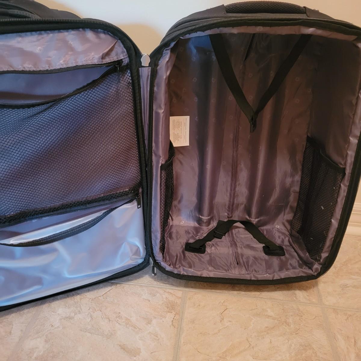 A matching pair of Samsonite luggage that has a woven linen exterior. Each piece comes with two accessory zip pockets and one large packing space. They have wheels and an extendable handle for easy transport. They measure approximately 16" x 12" x 23"H. Local pickup only