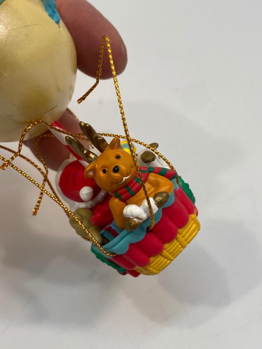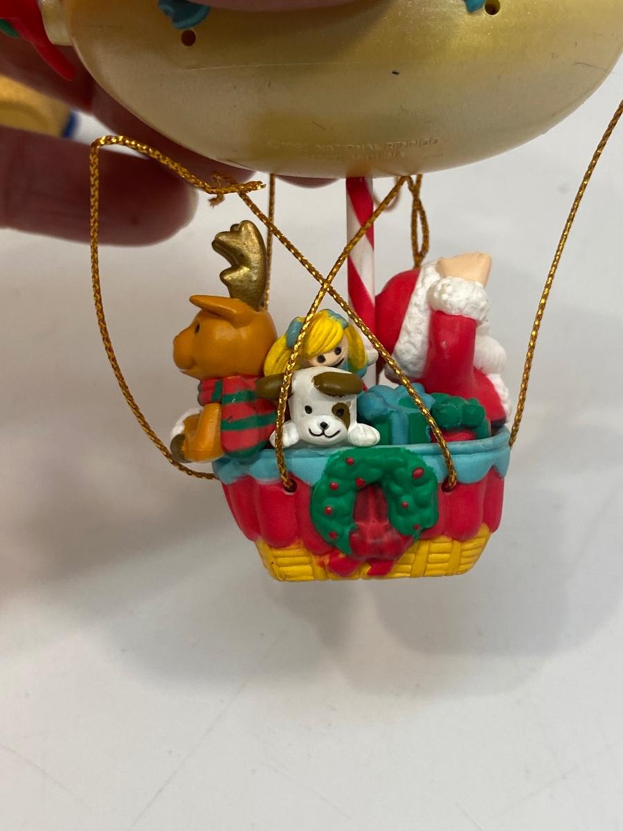 Pair of Santa Claus Hot Air Balloon Christmas Holiday Tree Ornaments. Both are in useable condition. The one on the right needs some of the strings repaired, see photos.
