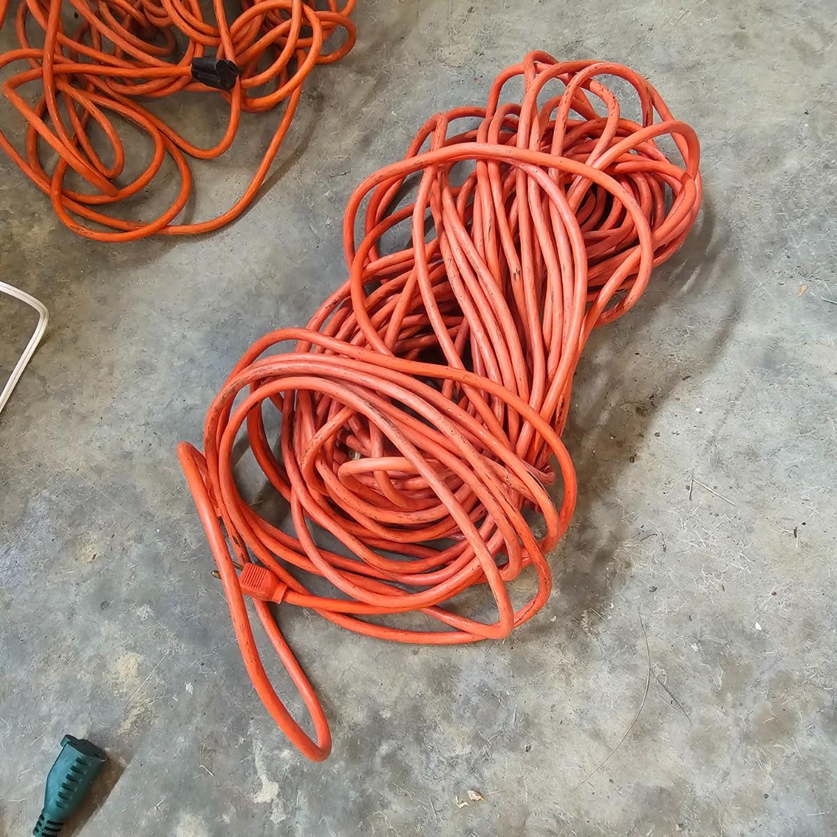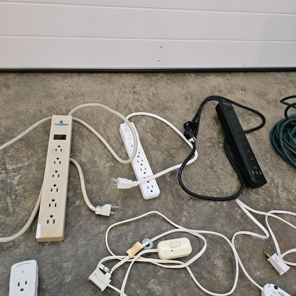 Assorted power strips, connectors, extension cords, from 9' to 100'. All items used. See photos for details. Shipping available