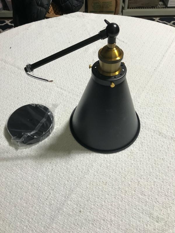 These sconces have a black metal shade and articulating arm with a brass base and black wall plate. This one of the 4 is missing the black back plate.