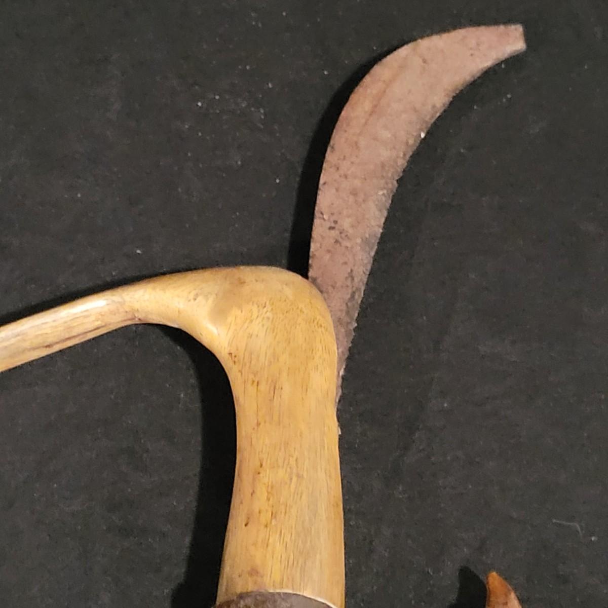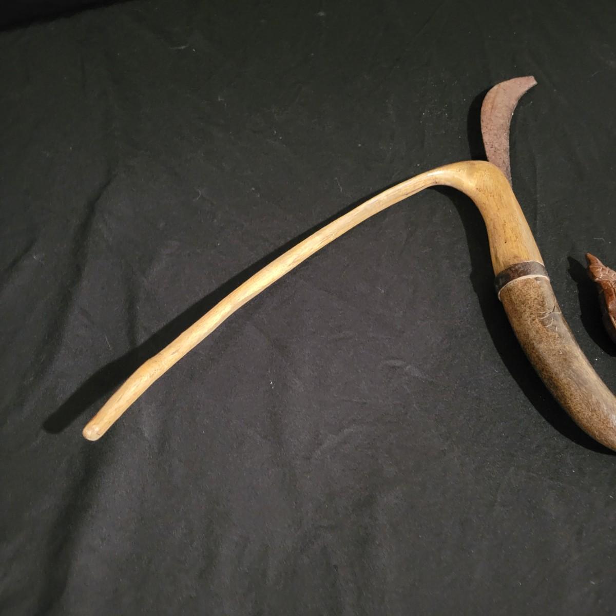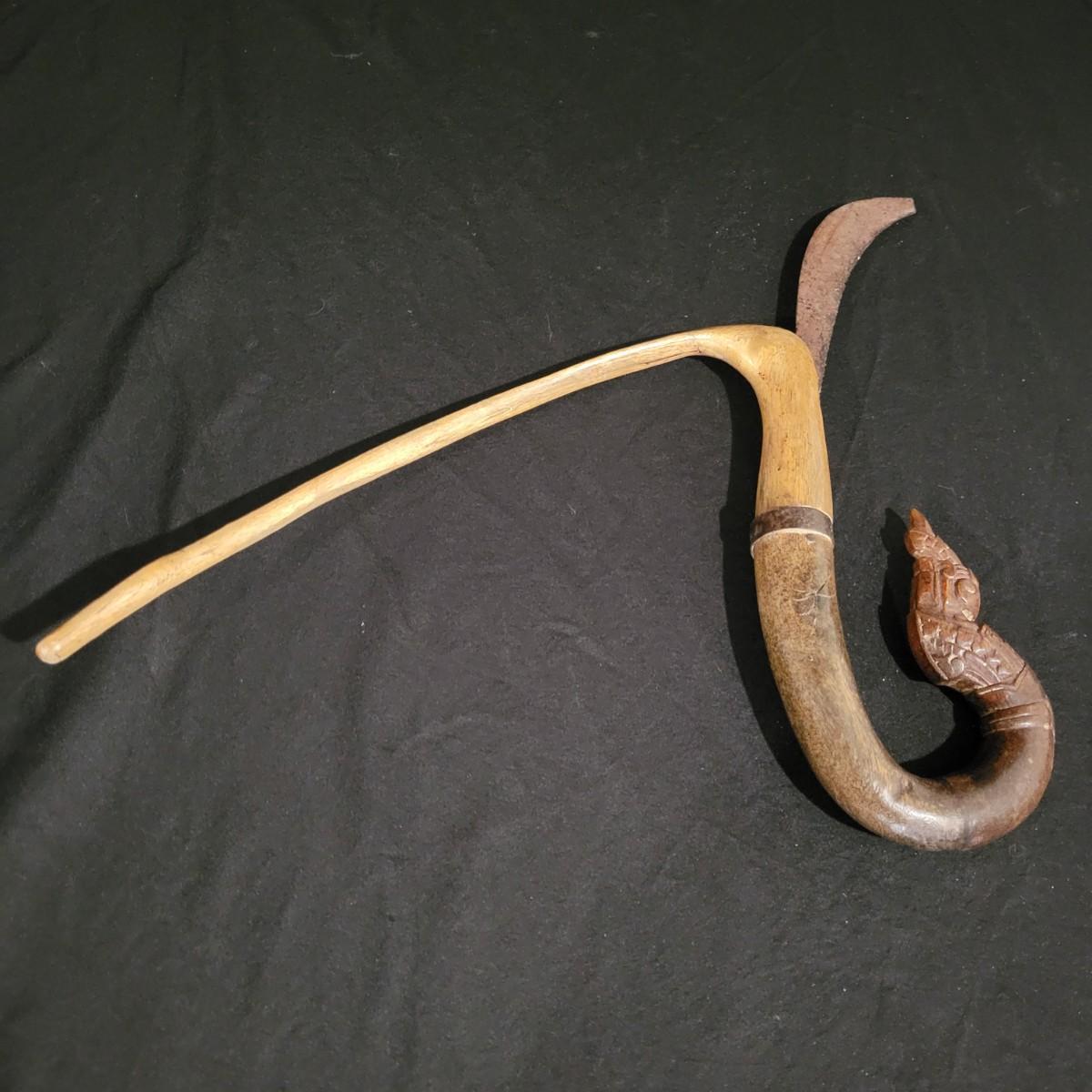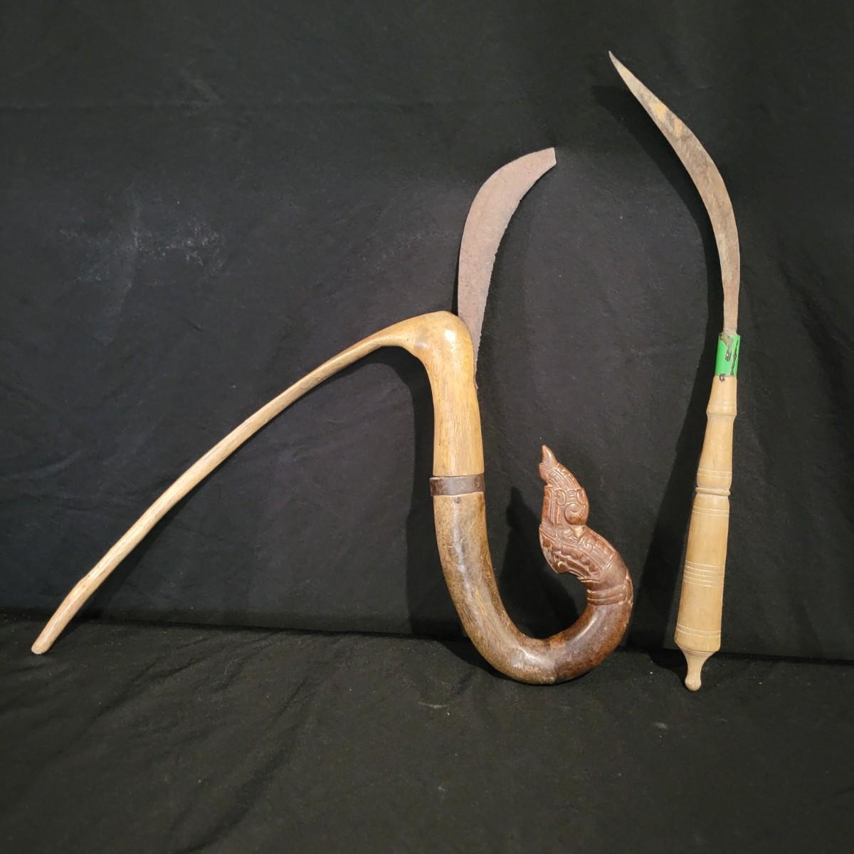 A pair of scythes. The larger piece appears to be a Cambodian rice scythe with a decorative Naga head. It measures approximately 18" x 14"H and has a broken tip. The other scythe has the appearance of a Thai scythe. Shipping available