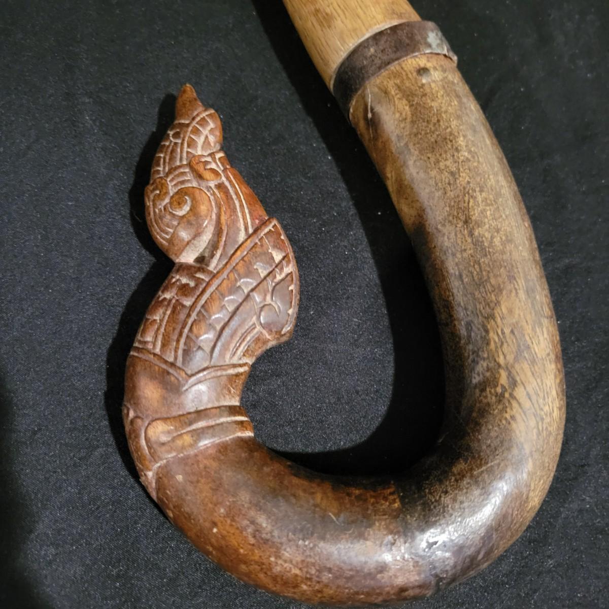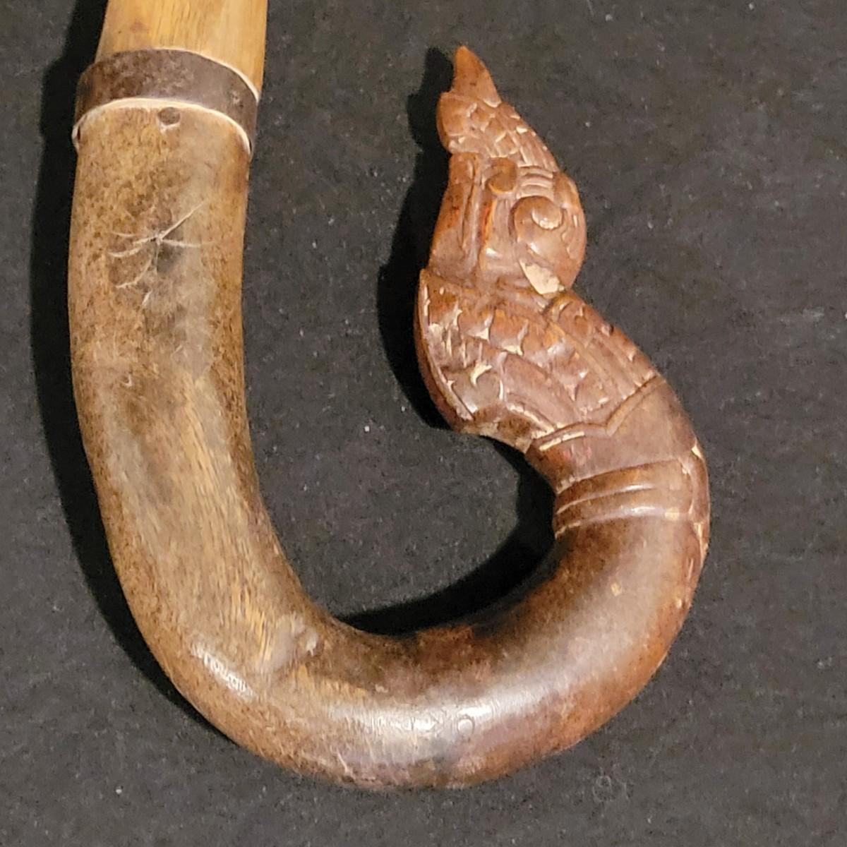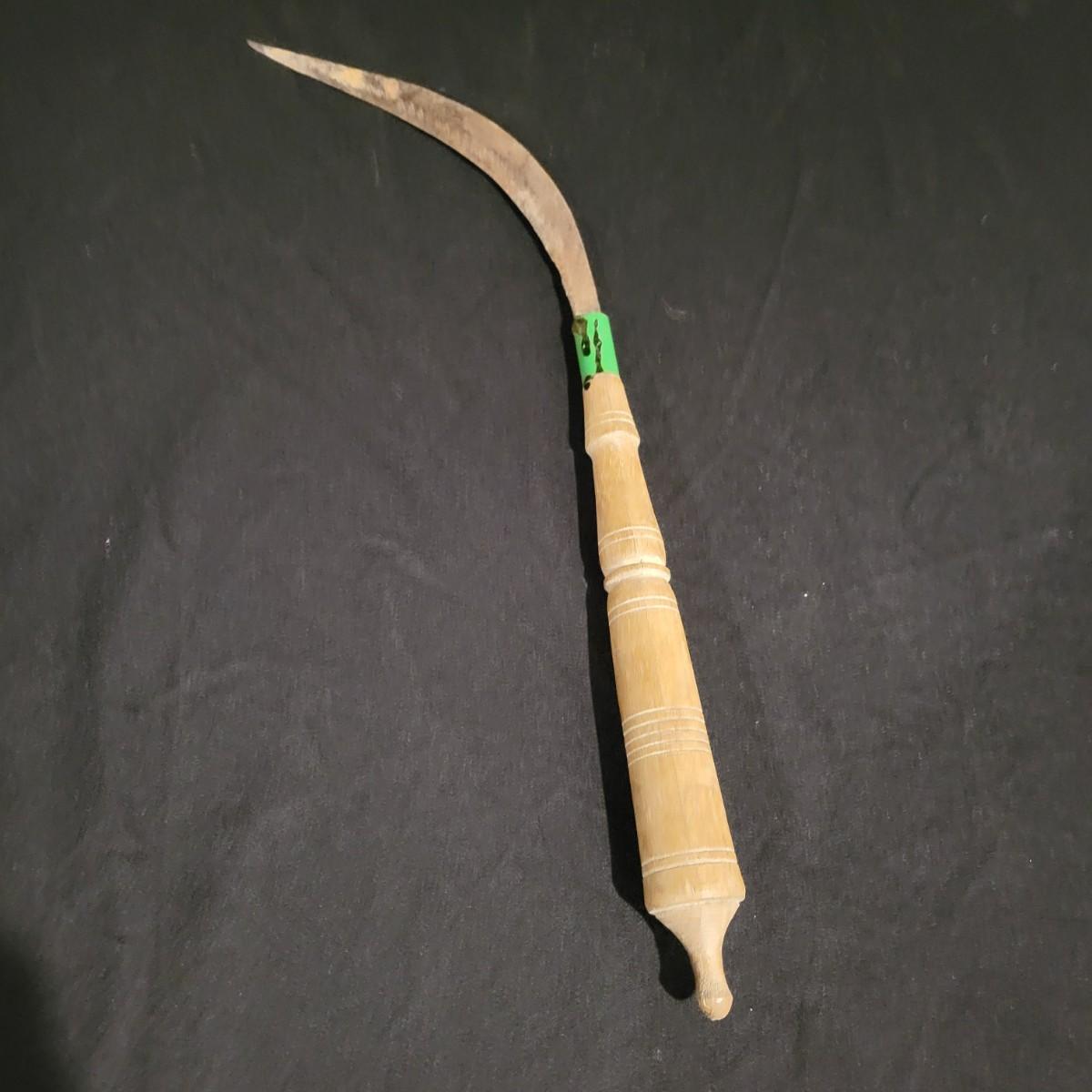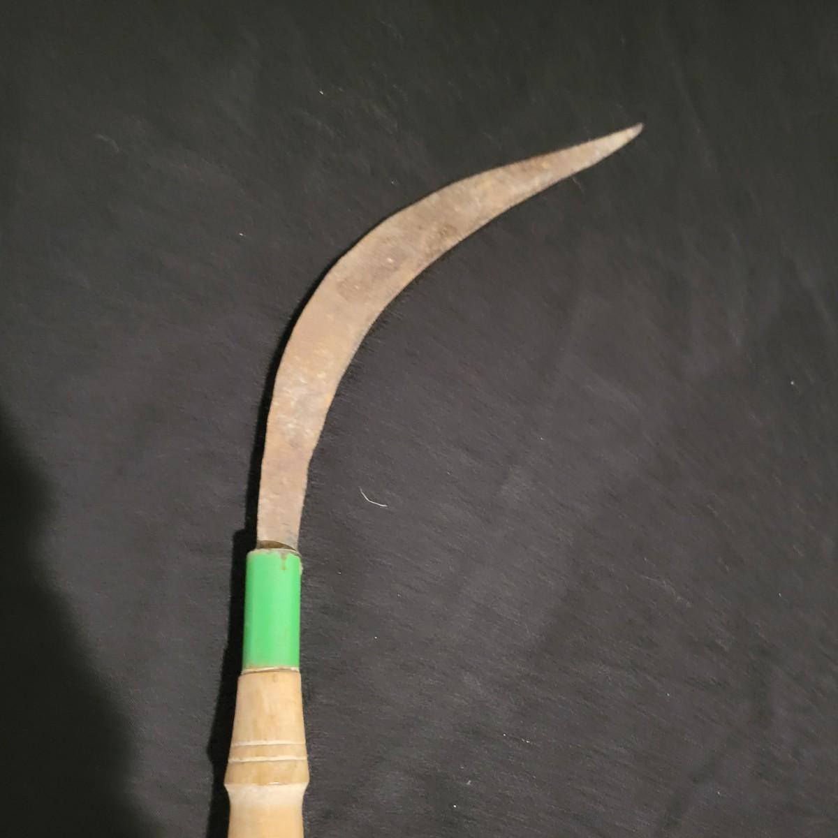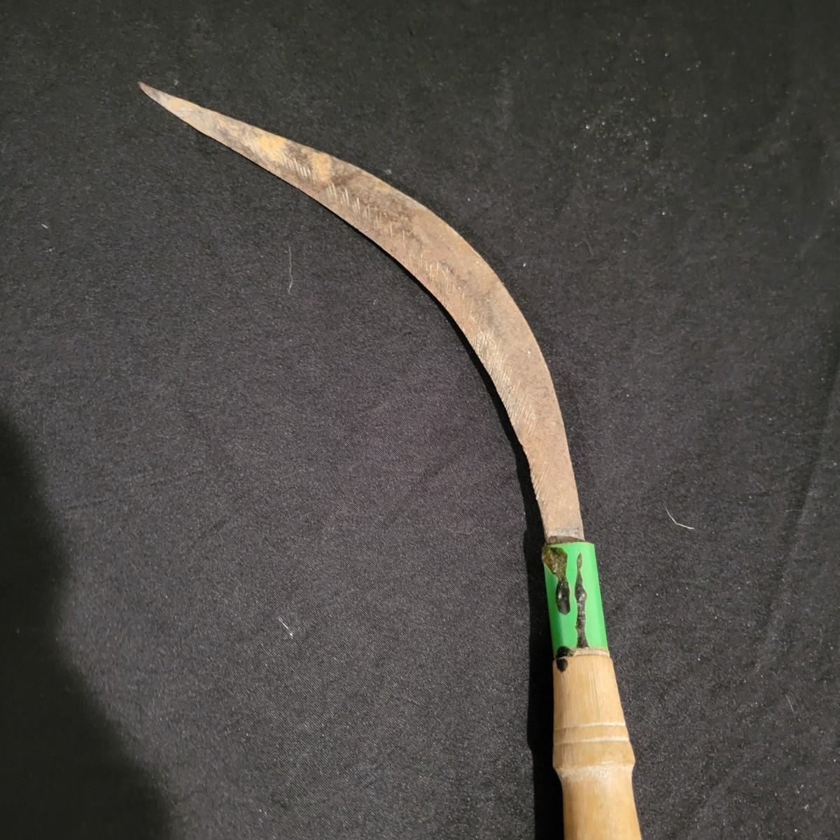 A pair of scythes. The larger piece appears to be a Cambodian rice scythe with a decorative Naga head. It measures approximately 18" x 14"H and has a broken tip. The other scythe has the appearance of a Thai scythe. Shipping available