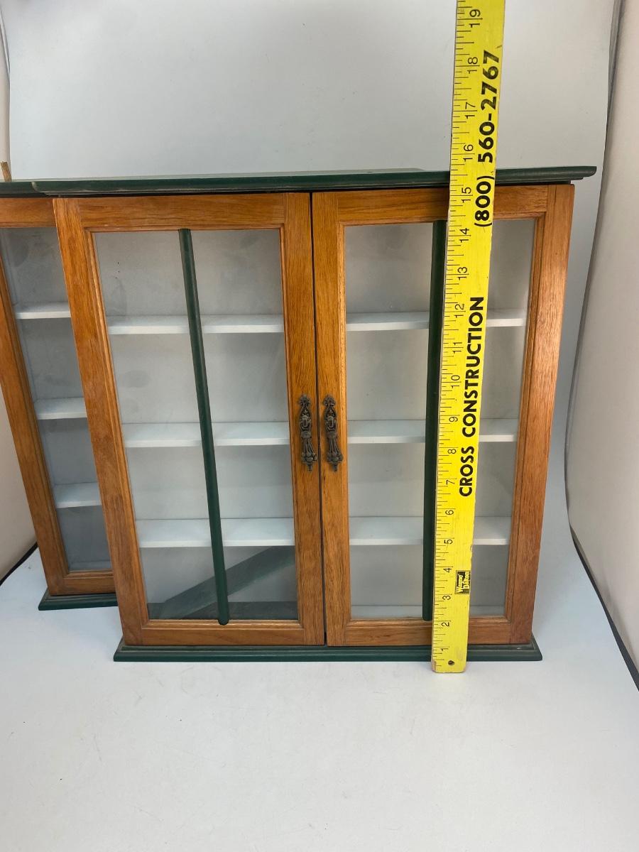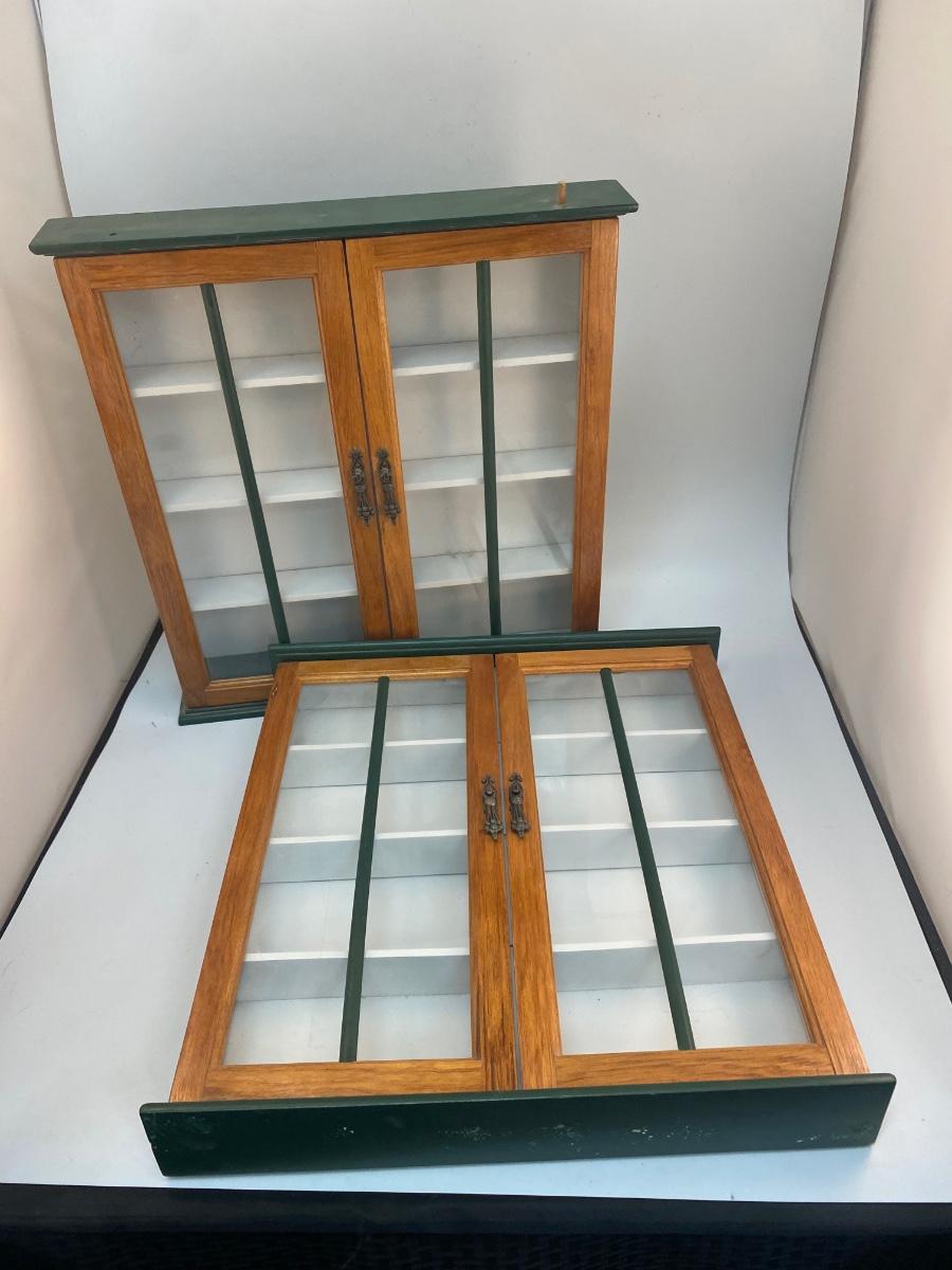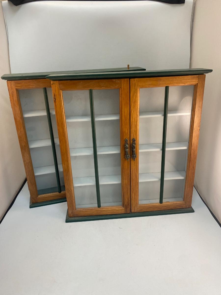Pair of Shallow Glass Door Display Cabinets for Miniatures. A bit dusty but good condition. Holes drilled in tops, one with wood dowel in it, looks like they may have inverted one to make it one piece. Easy to fill and repaint if desired.