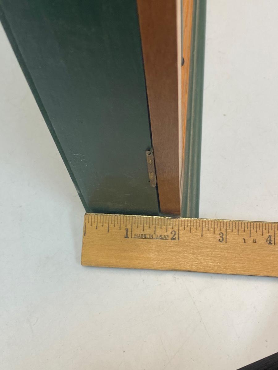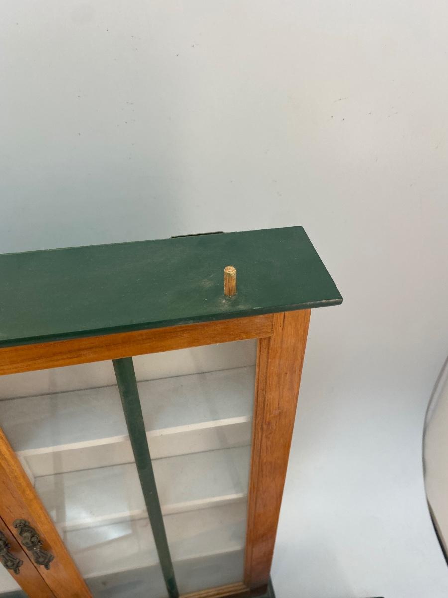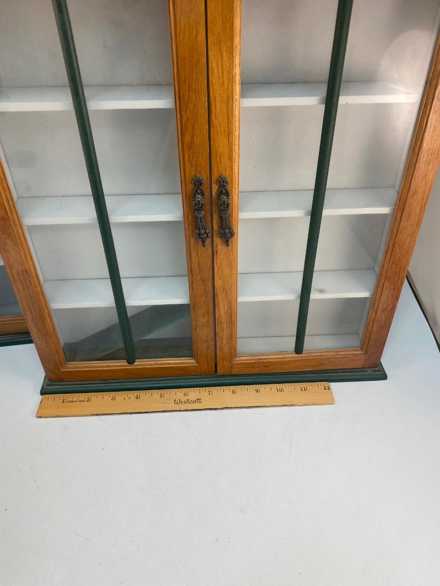 Pair of Shallow Glass Door Display Cabinets for Miniatures. A bit dusty but good condition. Holes drilled in tops, one with wood dowel in it, looks like they may have inverted one to make it one piece. Easy to fill and repaint if desired.