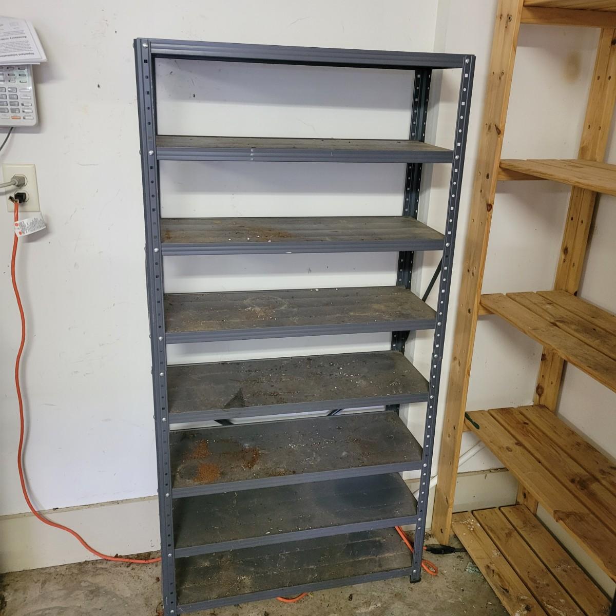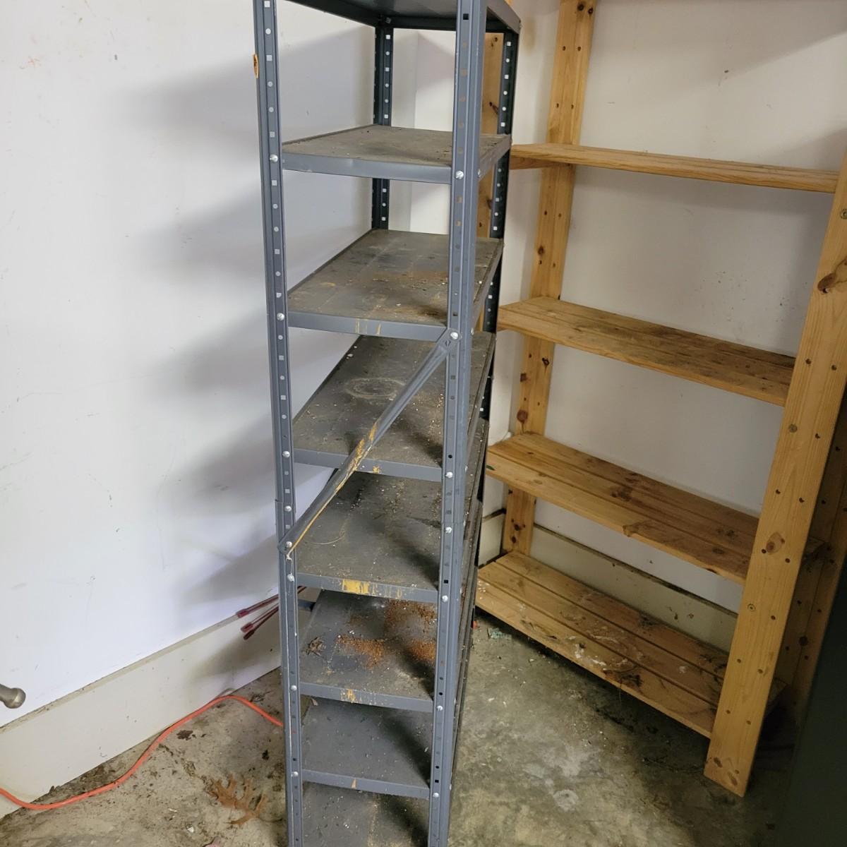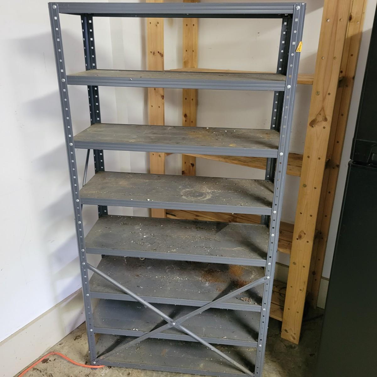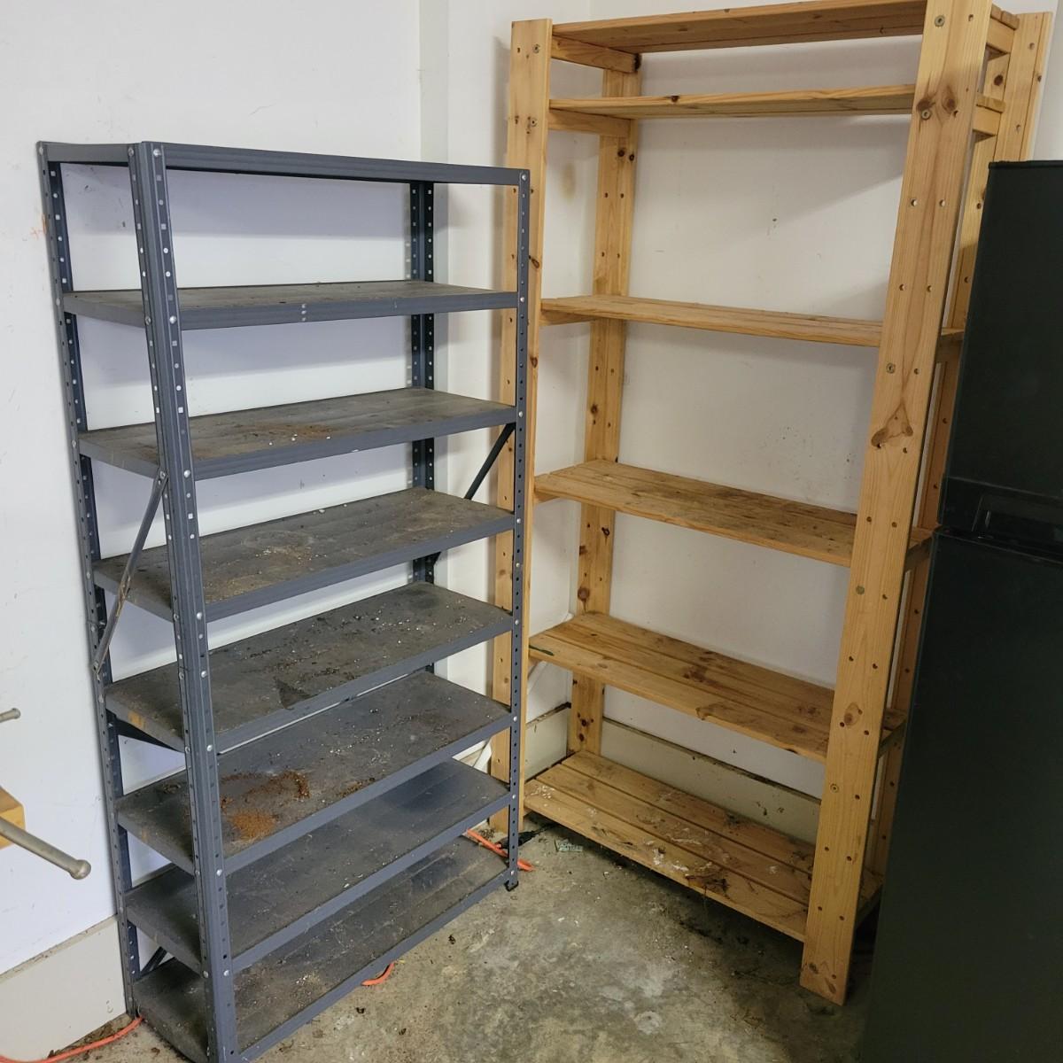 A pair of shelves, one that is made of metal and one is wood. Both units have adjustable shelf heights and show minimal damage, although the metal shelf does appear to have some rust. The larger metal shelf measures approximately 35" x 13" x 69.5"H. Local pickup only