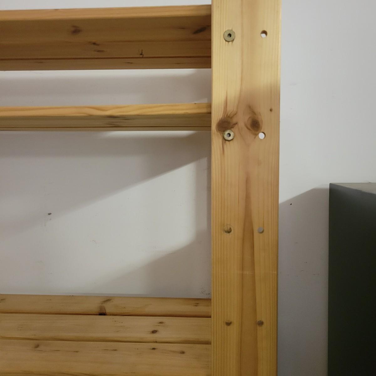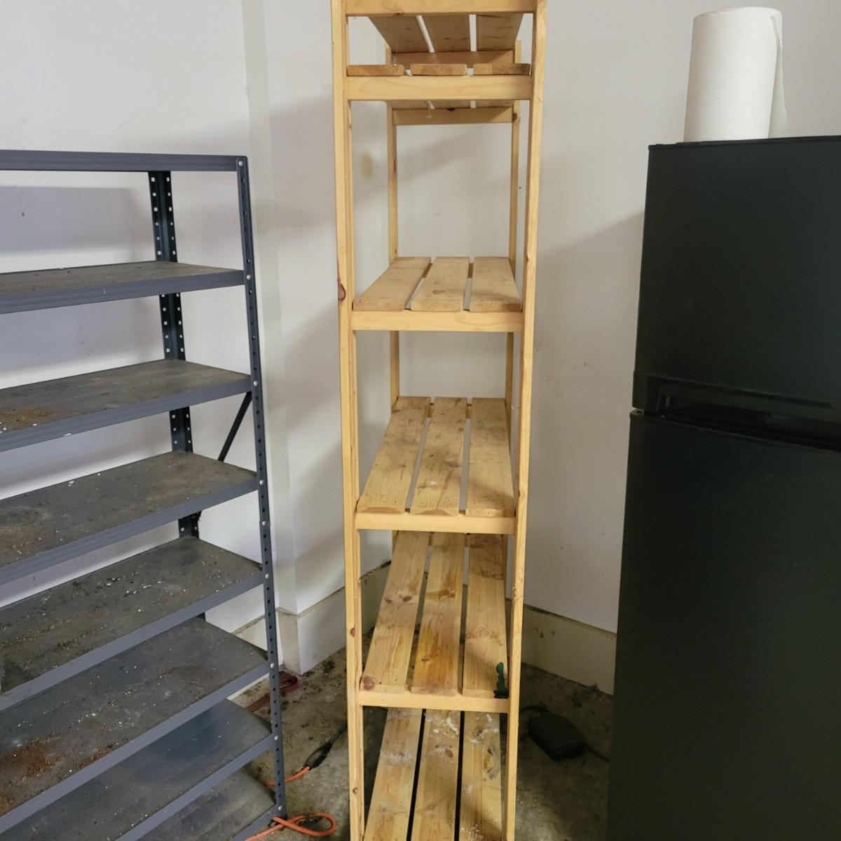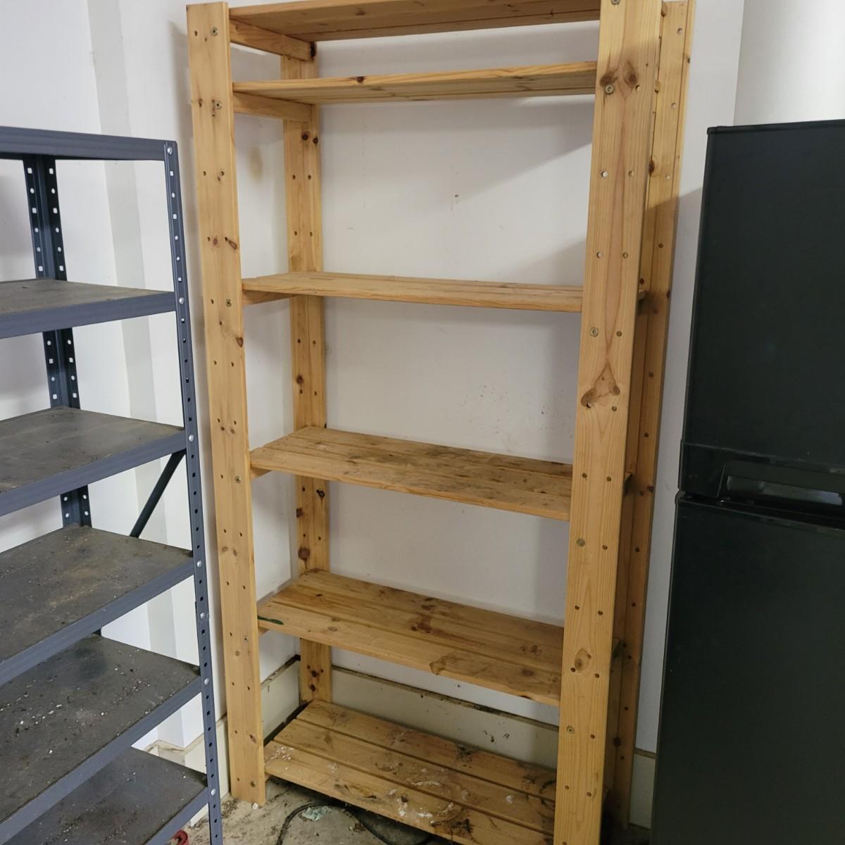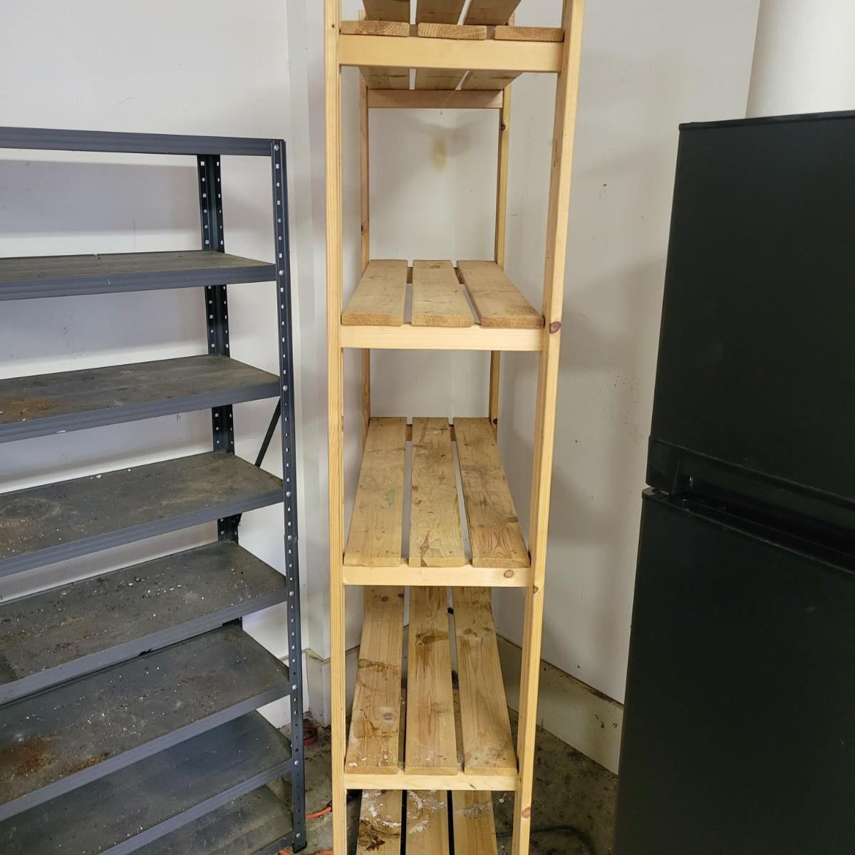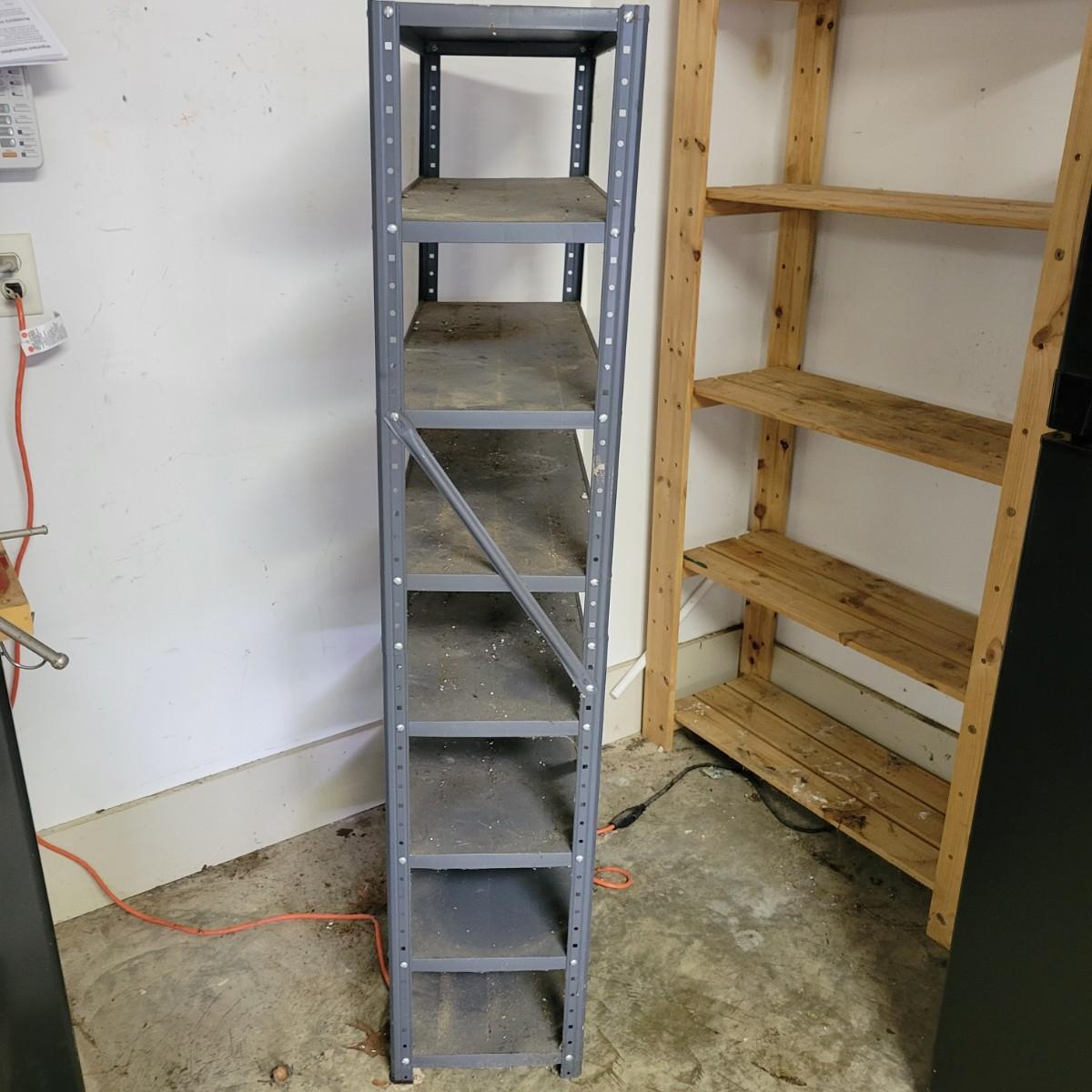 A pair of shelves, one that is made of metal and one is wood. Both units have adjustable shelf heights and show minimal damage, although the metal shelf does appear to have some rust. The larger metal shelf measures approximately 35" x 13" x 69.5"H. Local pickup only