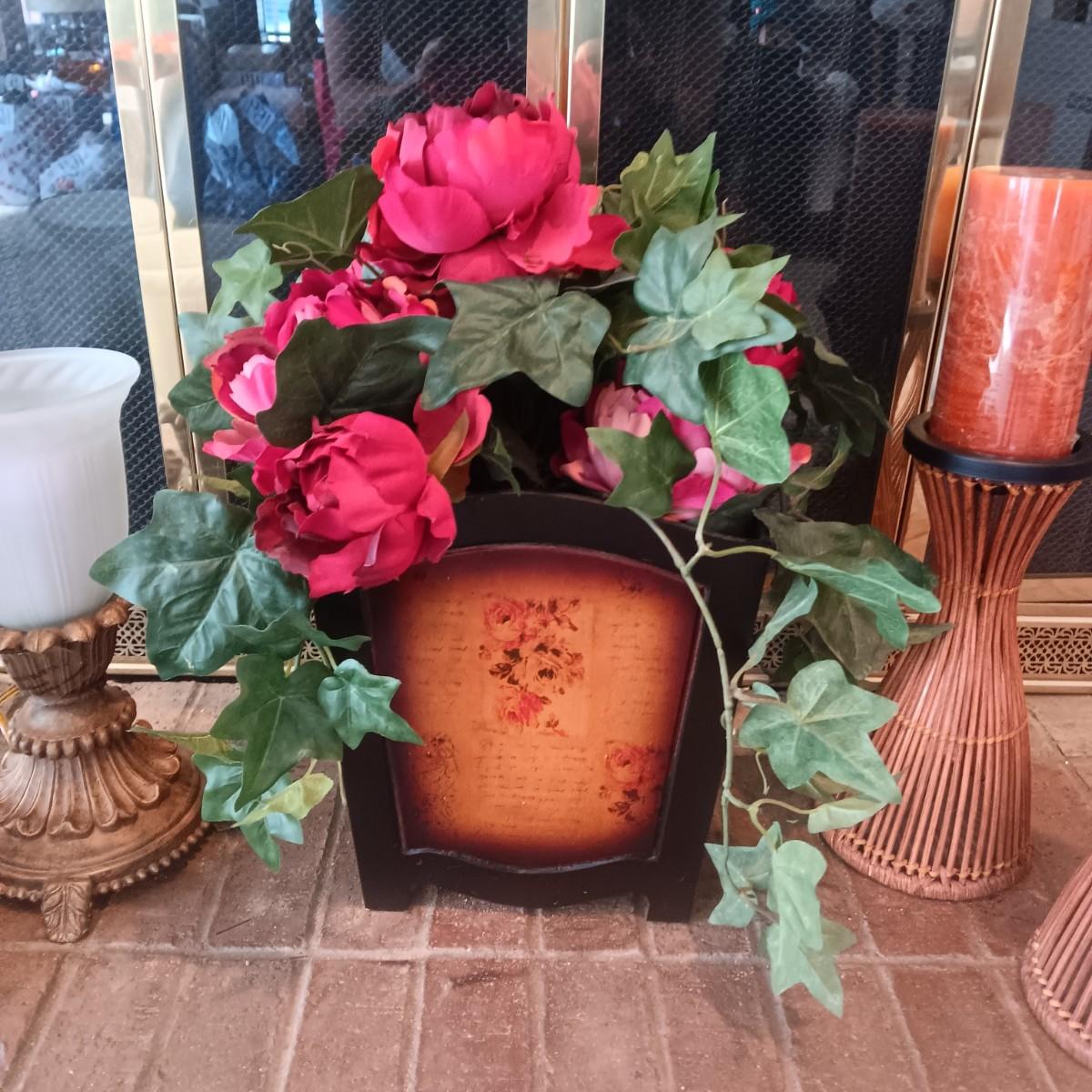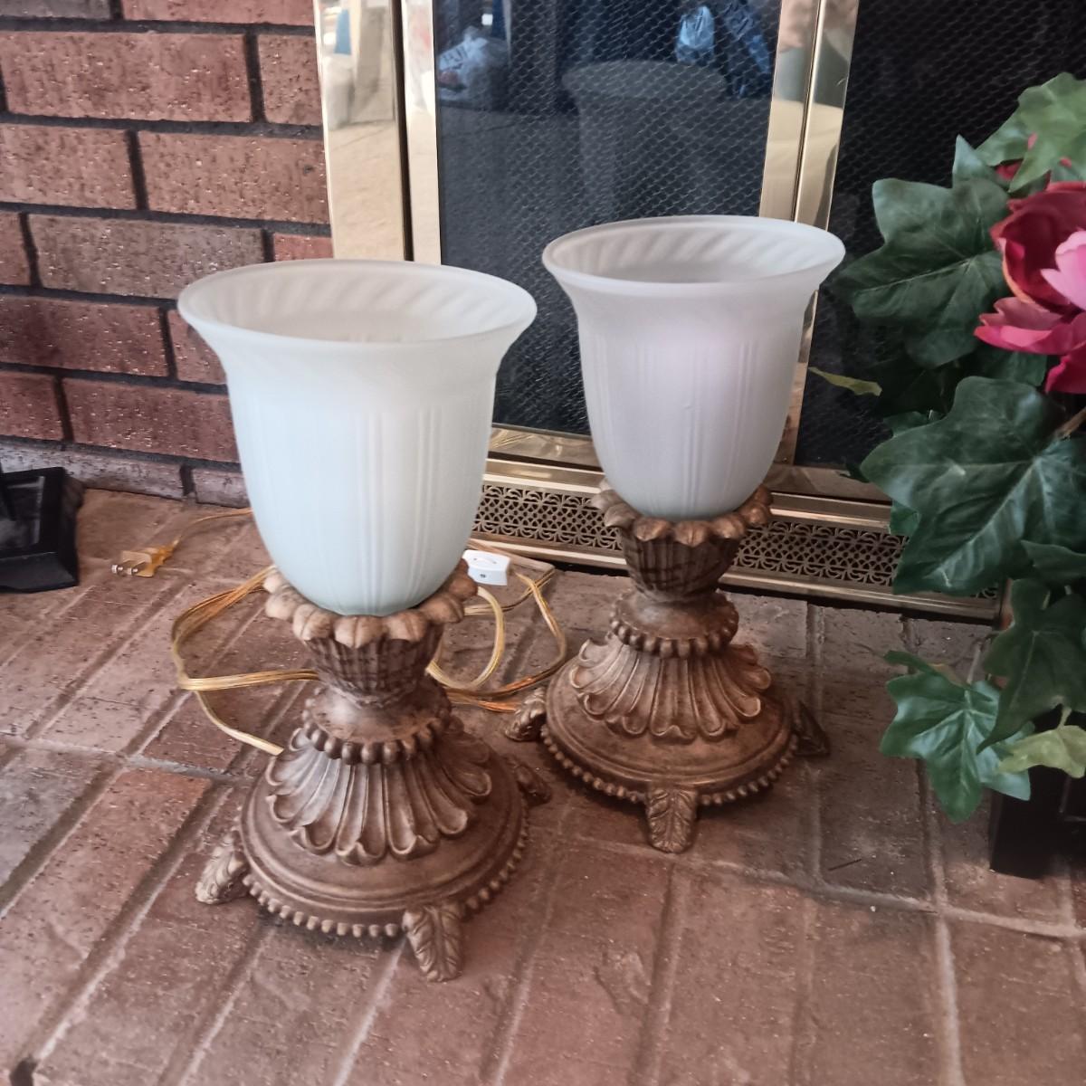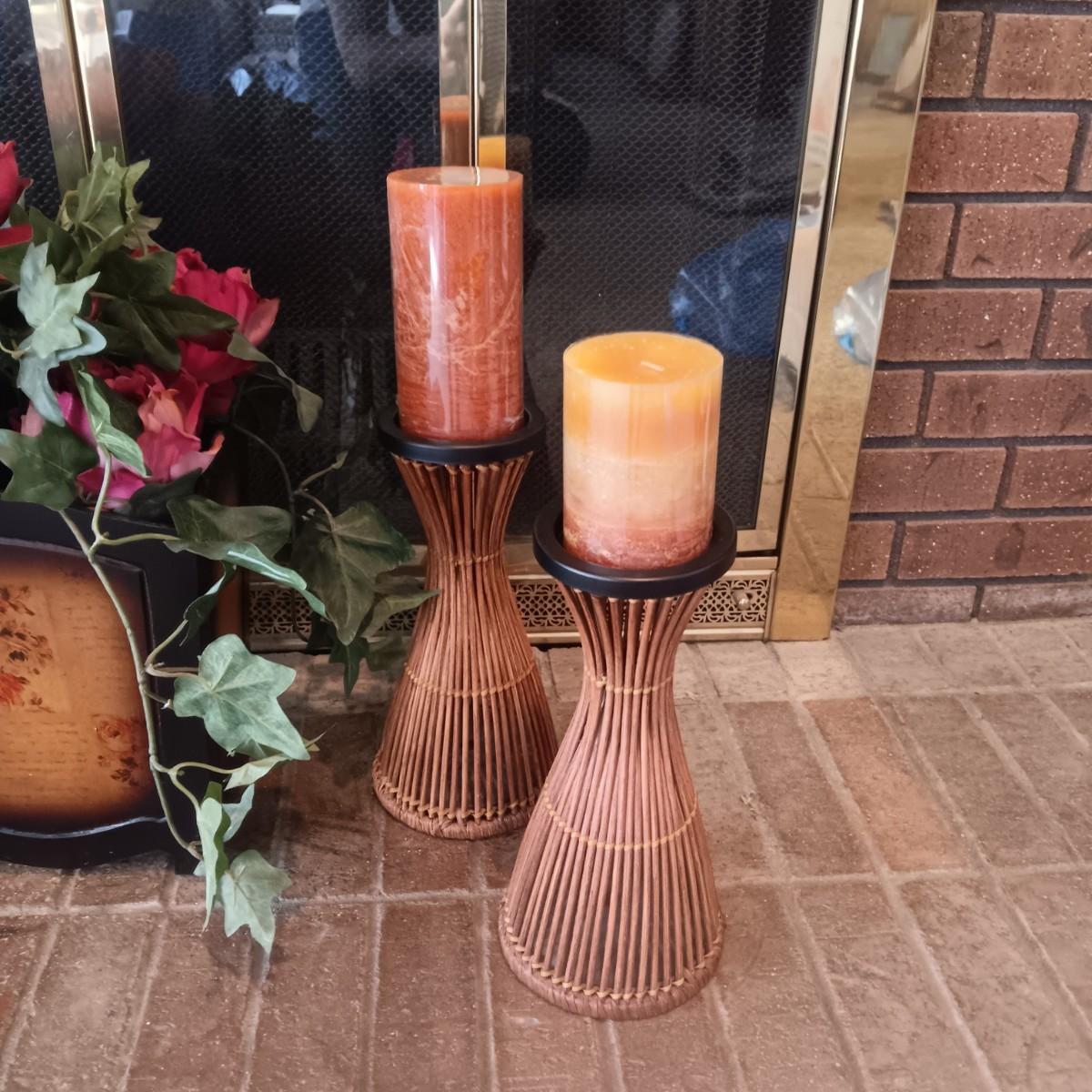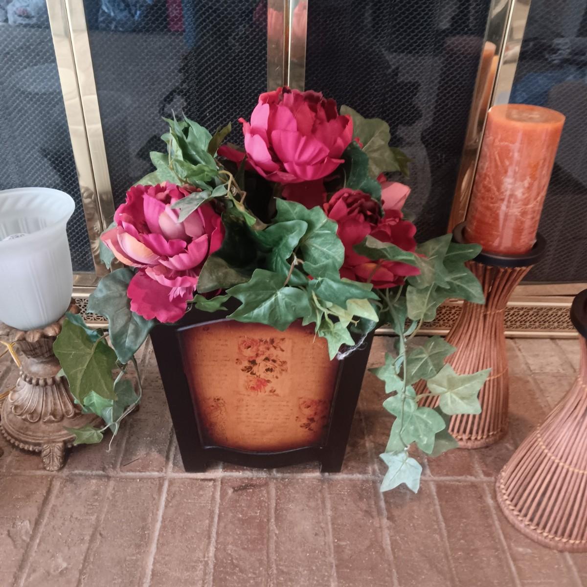 PAIR OF SHORT TABLE LAMPS, CANDLES AND HOLDERS PLUS FAUX FLOWERS IN A WOODEN BOX