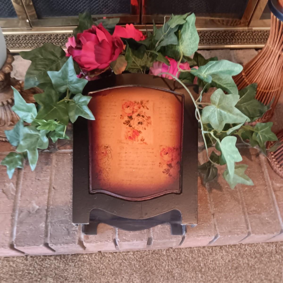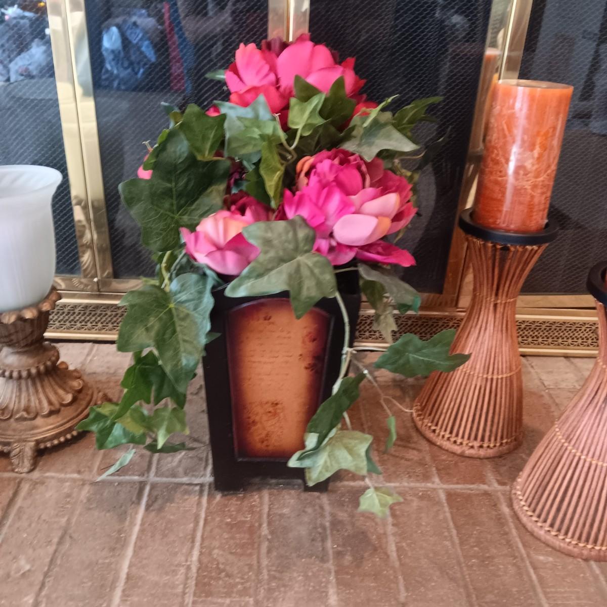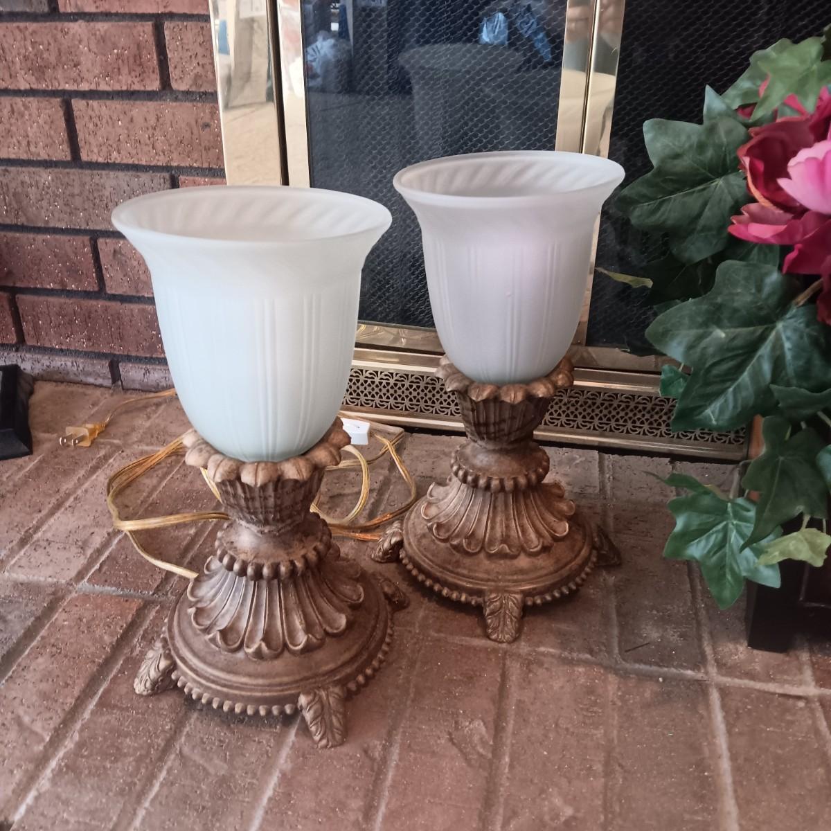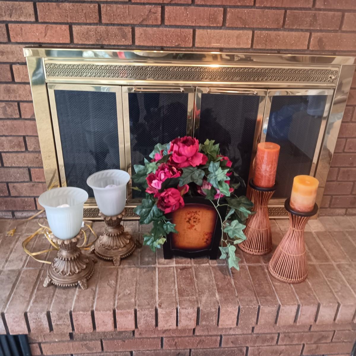 PAIR OF SHORT TABLE LAMPS, CANDLES AND HOLDERS PLUS FAUX FLOWERS IN A WOODEN BOX