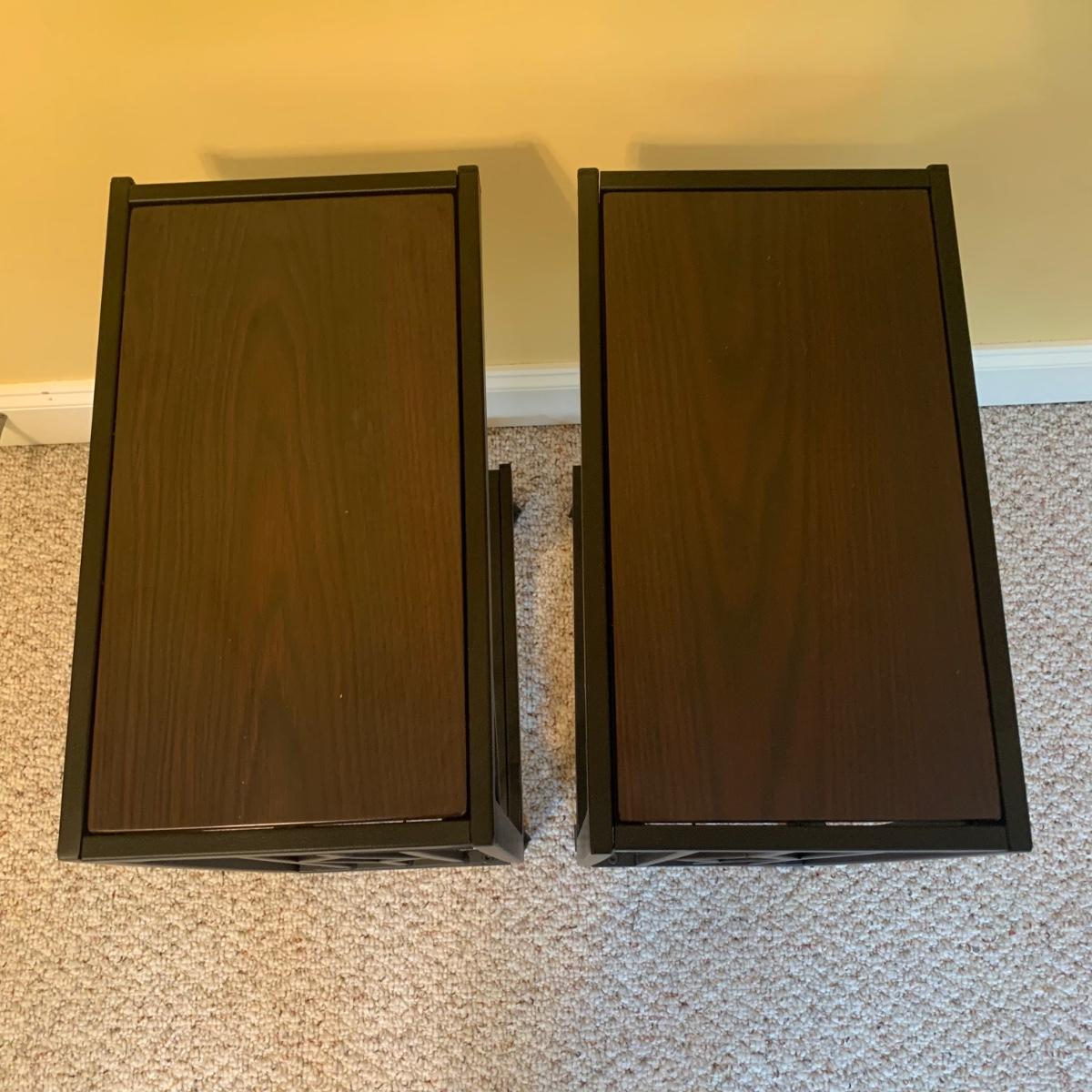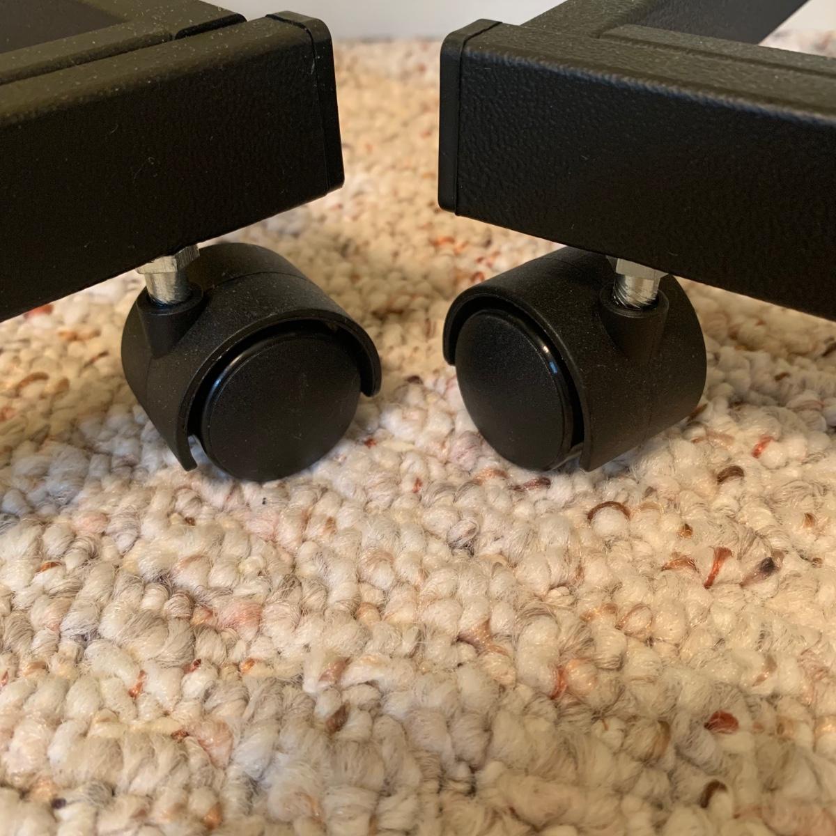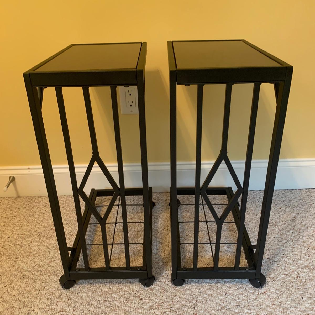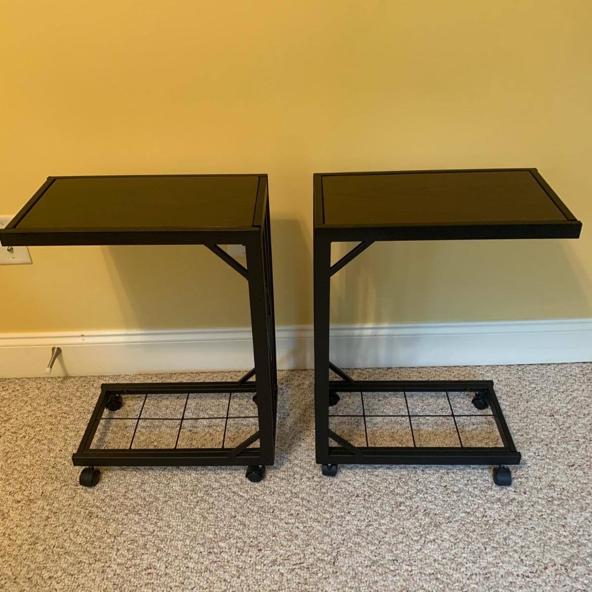 Two small side tables made of wood and metal. Each table has four casters and measures, 16” x 9” x 23”H. Local pickup only.
