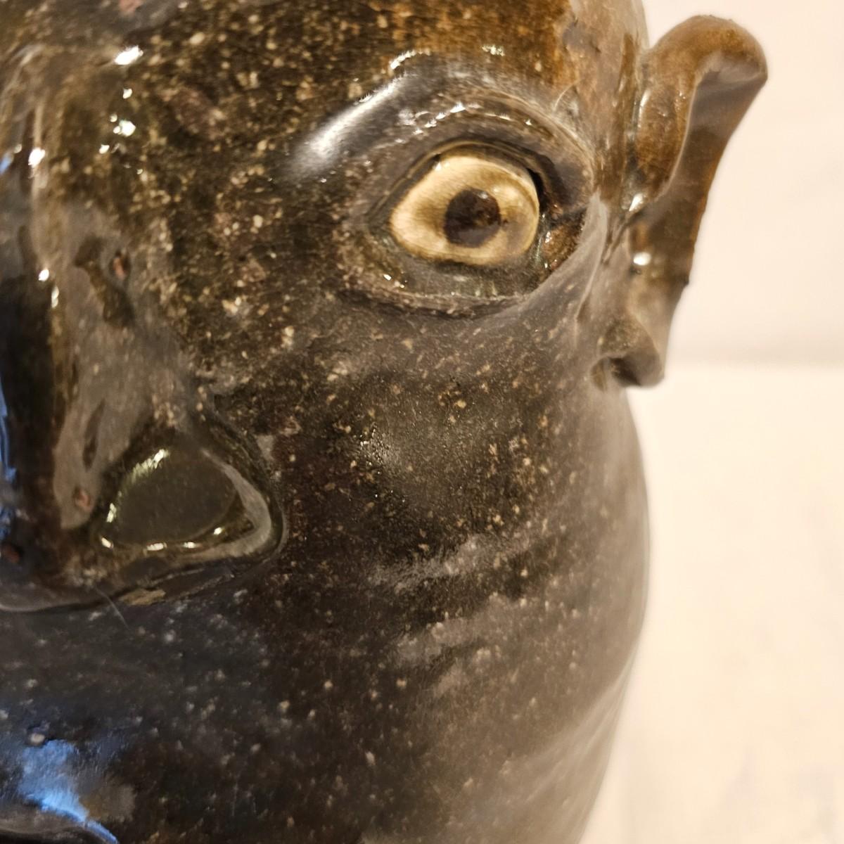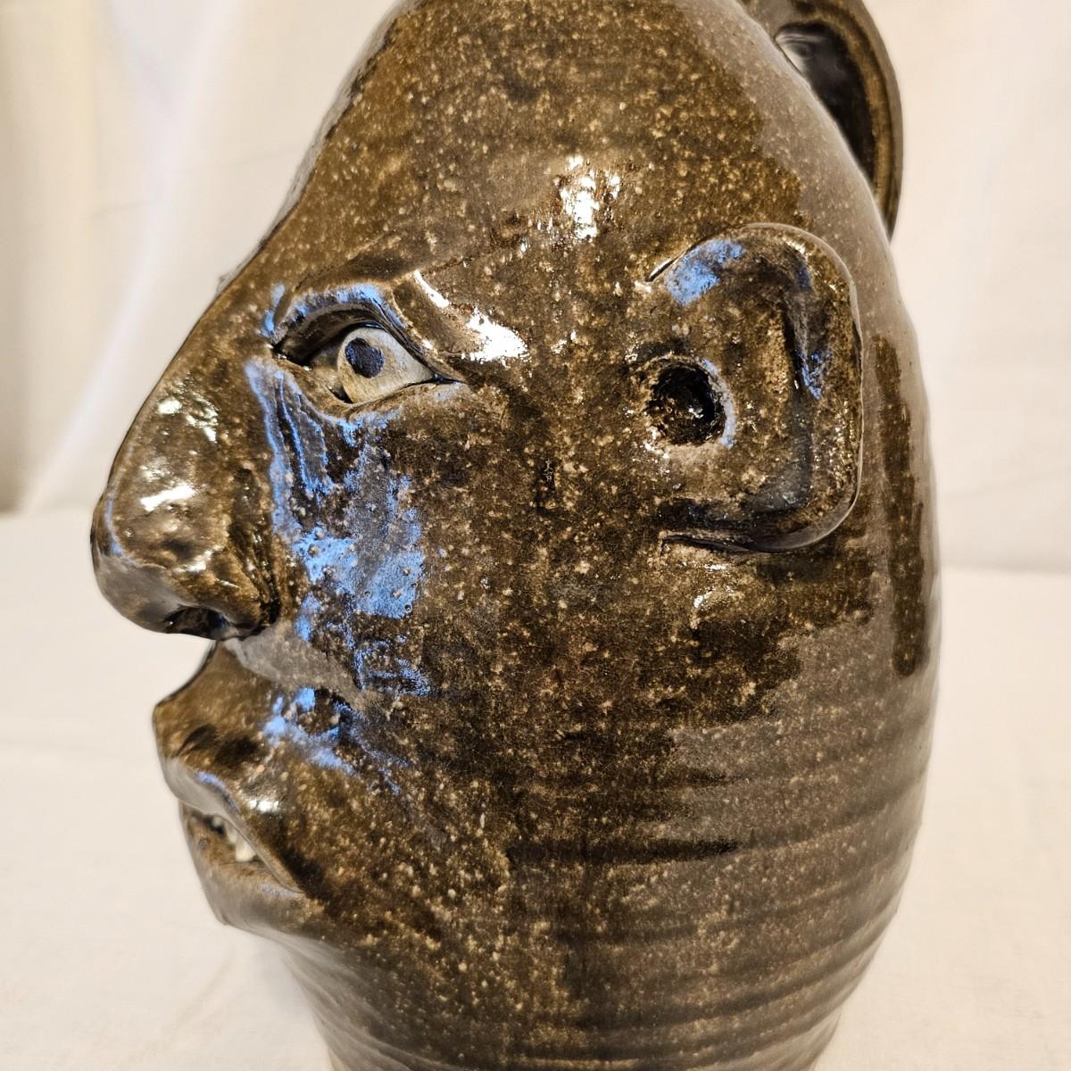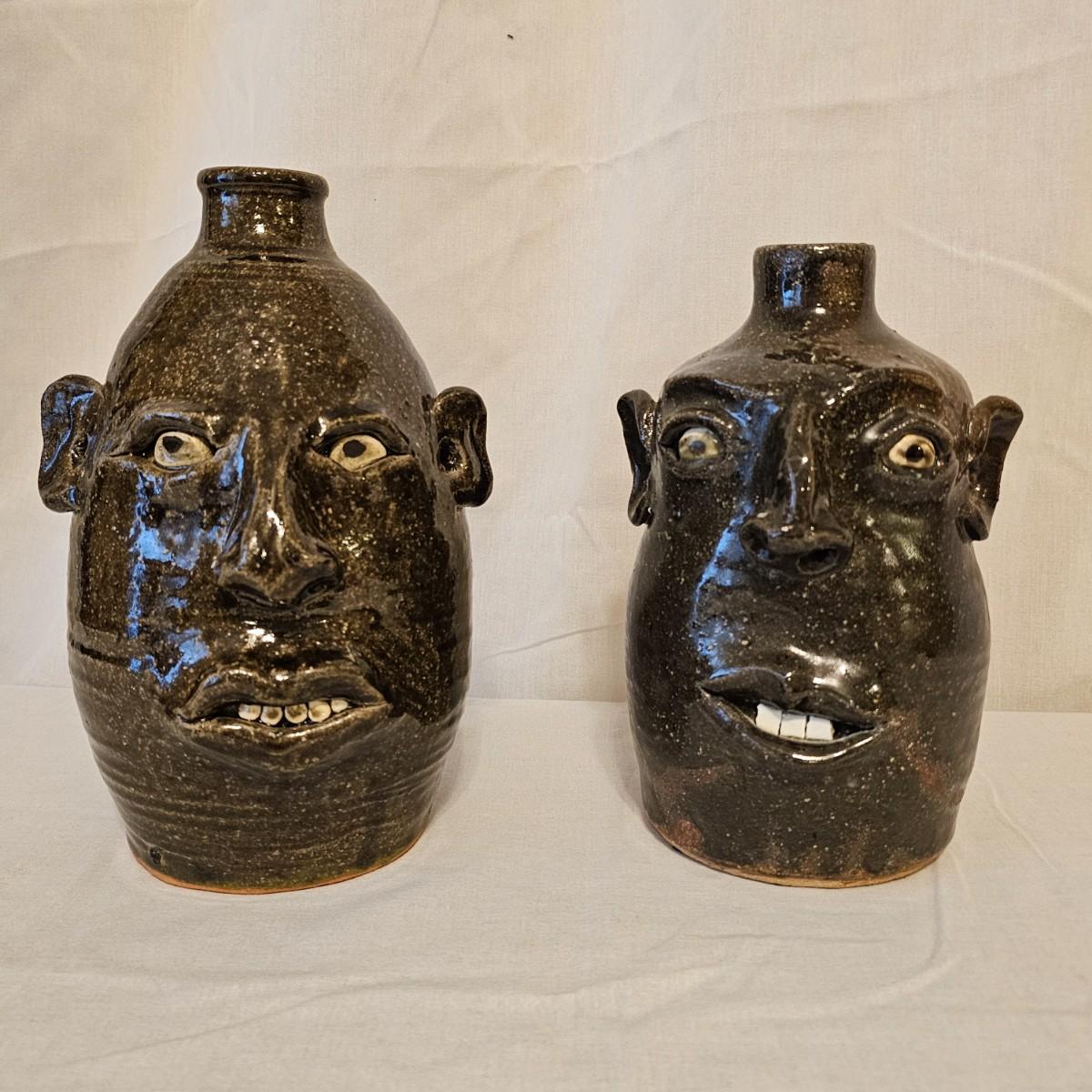Two iconic face jugs representing the African slaves from the American South. Handmade by the Meaders family from Georgia who have been doing this style for years. The eyes and teeth are hand molded and applied using unglazed kaolin clay to give distinction and contrast. Larger item measures 6.5" x 7" x 10.5"H, is signed in base by Anita Meaders. Smaller piece is 5 5" x 6" x 9"H, is signed by David Meaders. See photos for details. Shipping available.