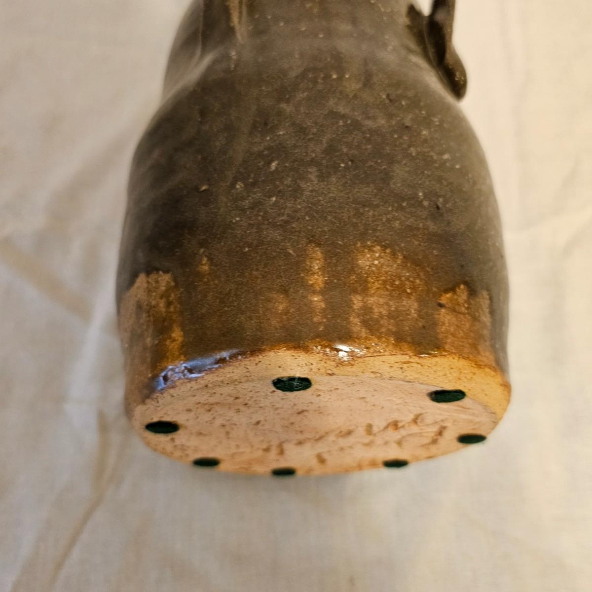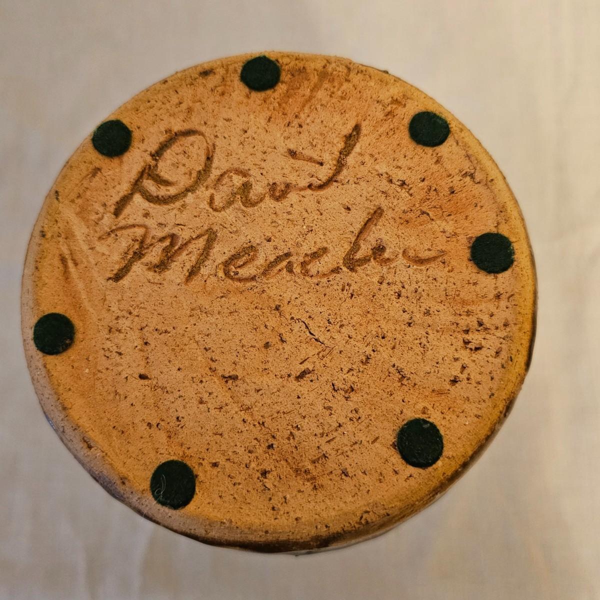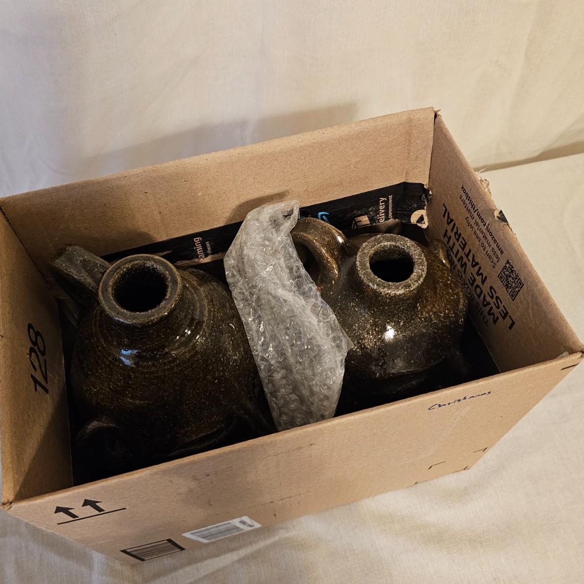 Two iconic face jugs representing the African slaves from the American South. Handmade by the Meaders family from Georgia who have been doing this style for years. The eyes and teeth are hand molded and applied using unglazed kaolin clay to give distinction and contrast. Larger item measures 6.5" x 7" x 10.5"H, is signed in base by Anita Meaders. Smaller piece is 5 5" x 6" x 9"H, is signed by David Meaders. See photos for details. Shipping available.