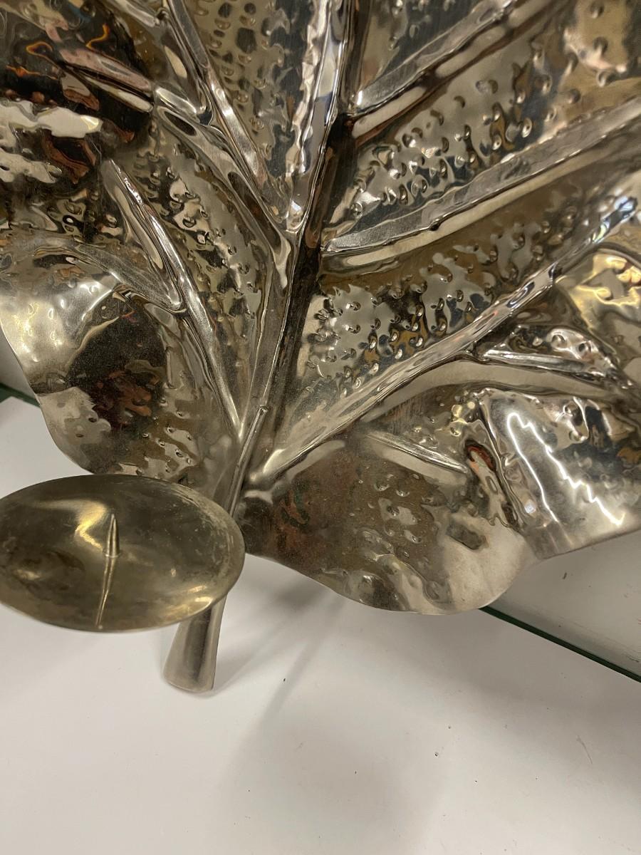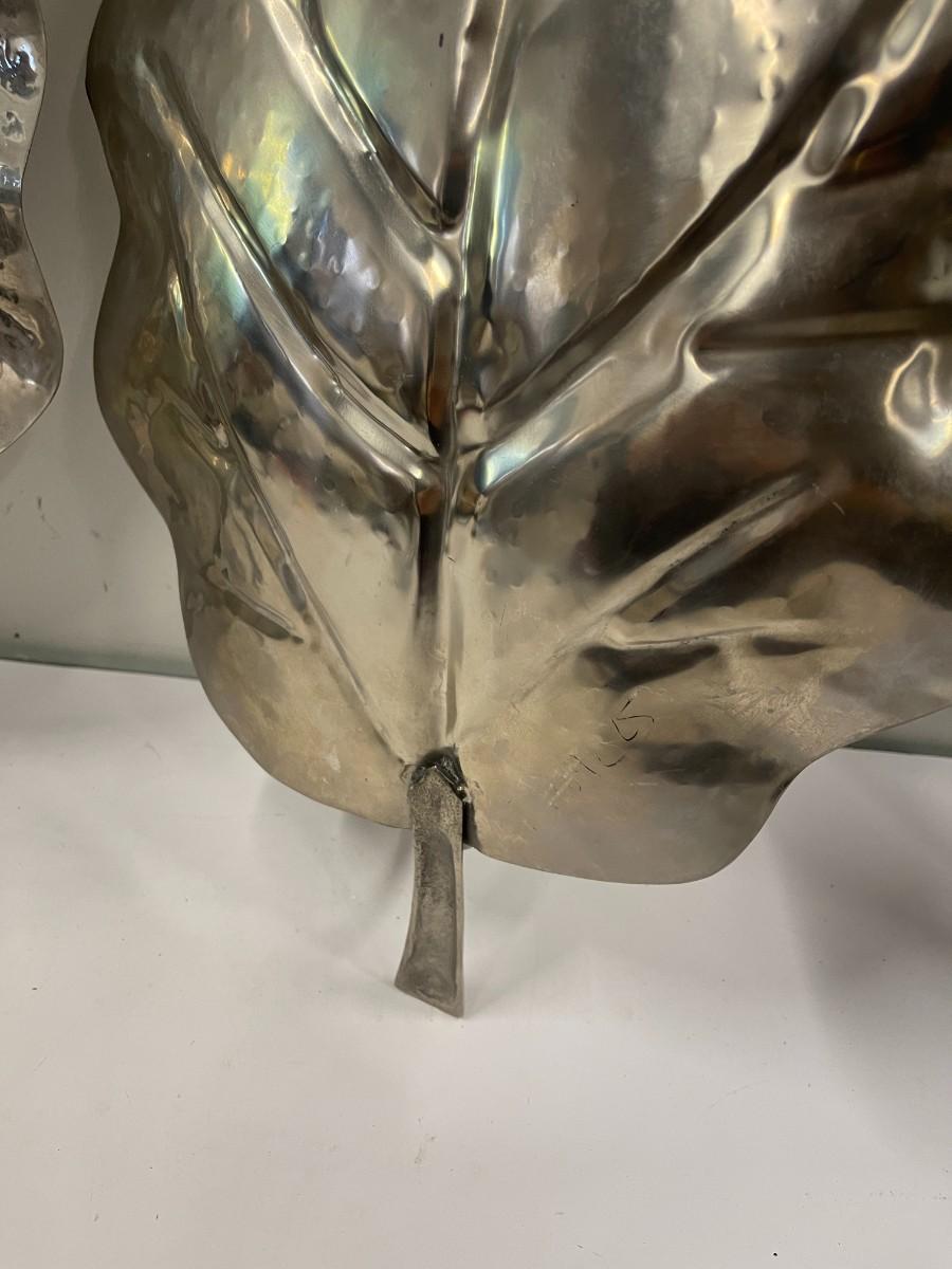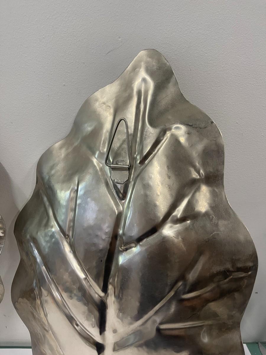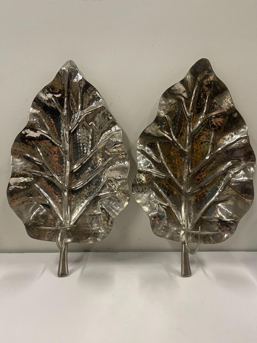 Pair of Silver Colored Hammered Metal Leaf Shaped Wall Sconces. 21 1/2" high x 12" wide.