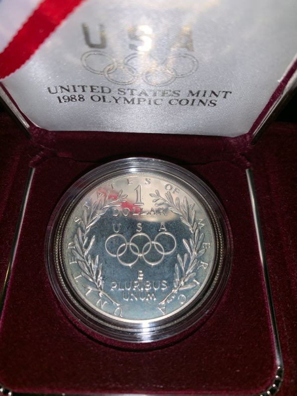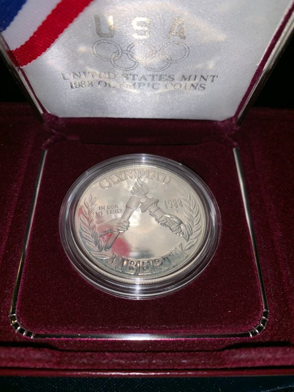 Winning bidder will receive the 1988 proof silver dollar and the two coin proof set pictured. Priority Shipping is available for $9.99 flat fee.