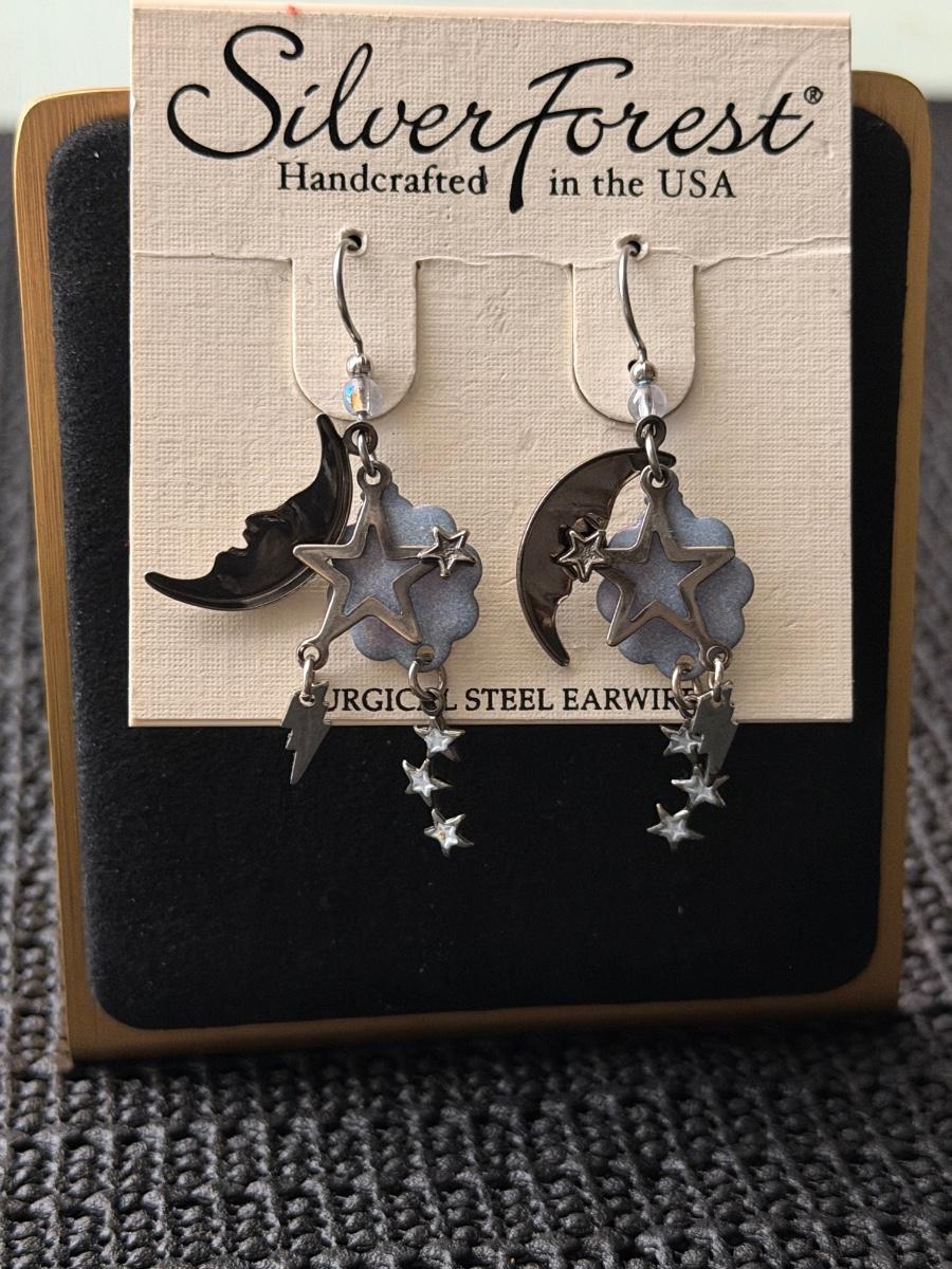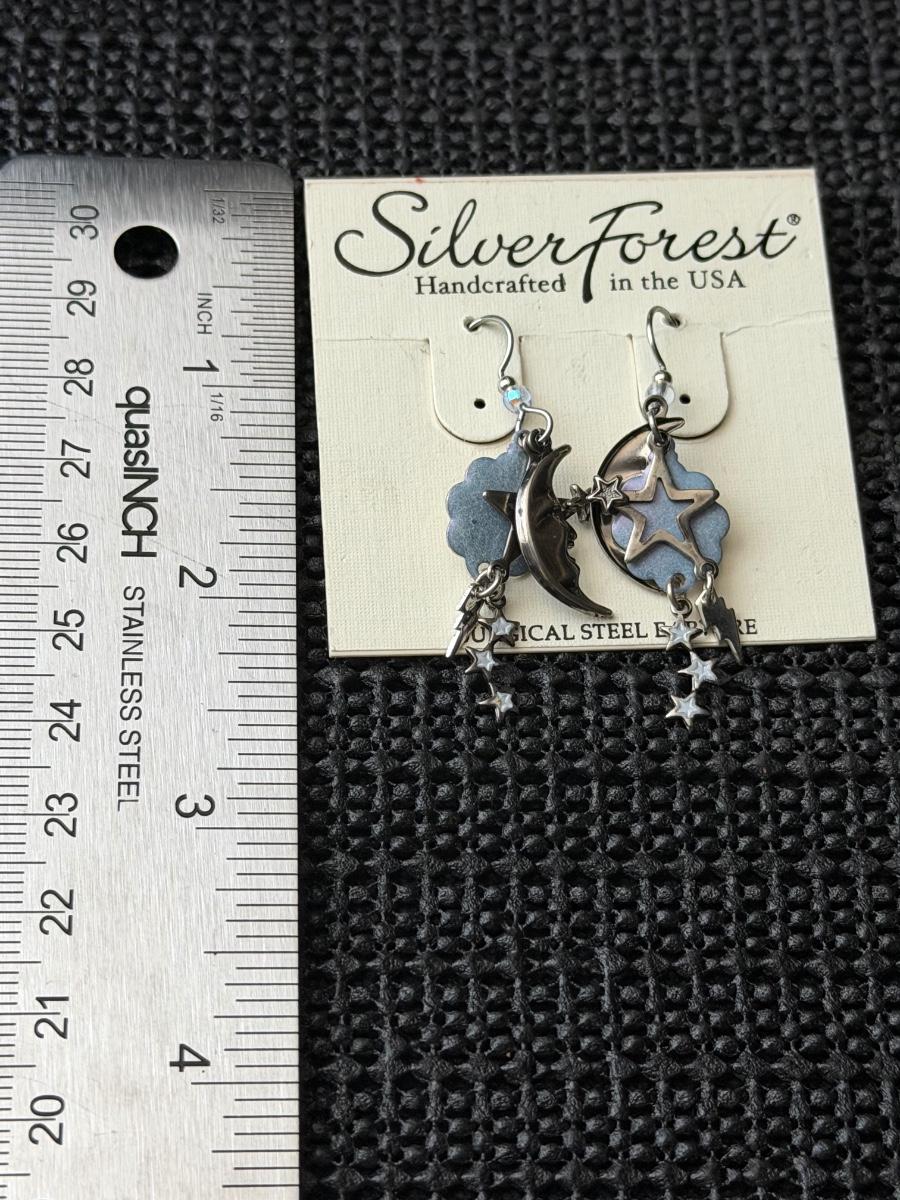 pair of Silver Forest Moon & Star layered linear earrings with a silver-tone finish and blue enamel accents.