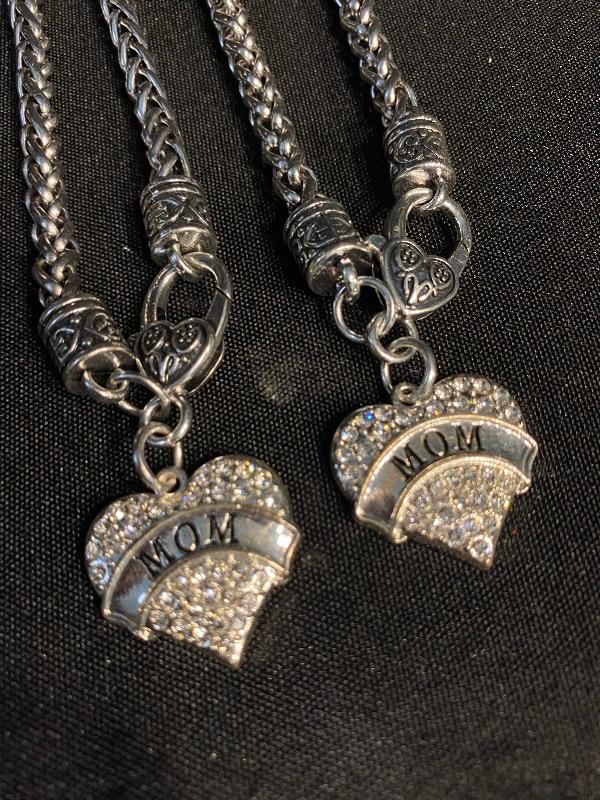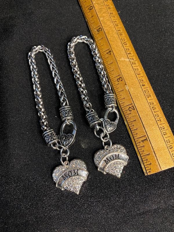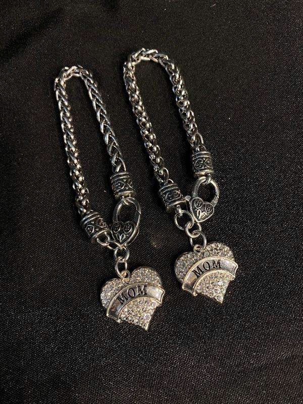 Pair of matching "MOM" charm bracelets. Silvertone. Heart charm is covered in rhinestones on one side.