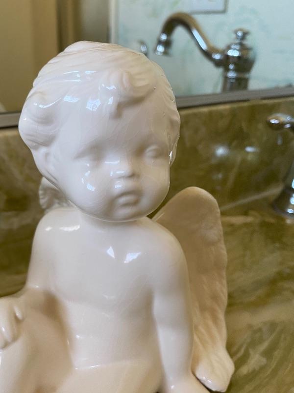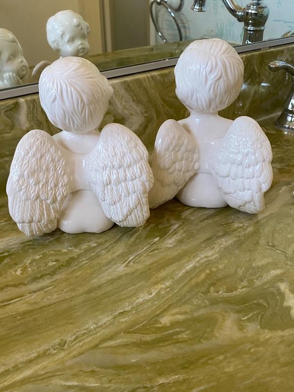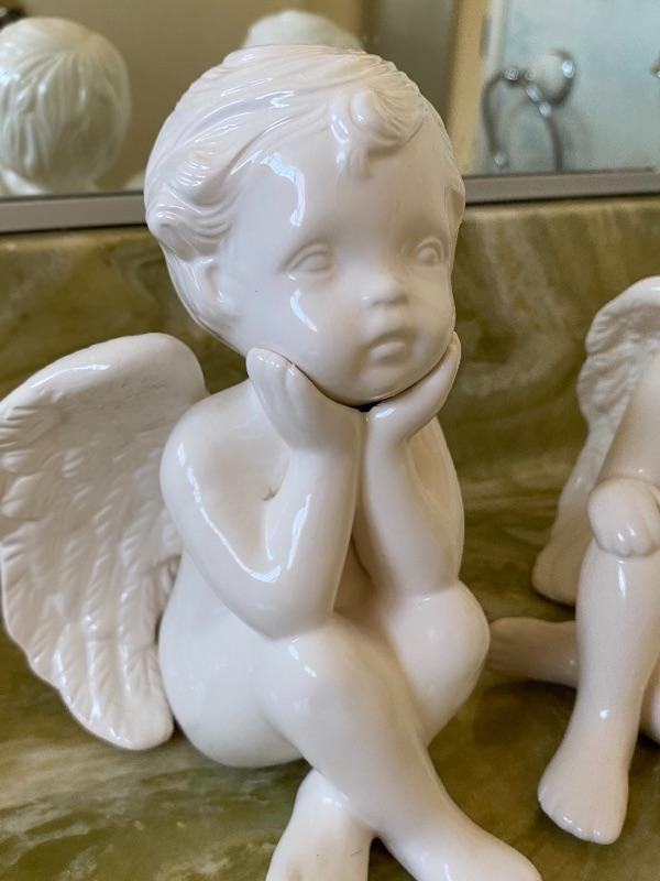 Pair of sitting cherub angels. Each in a different pose. Ceramic. About 6" size.