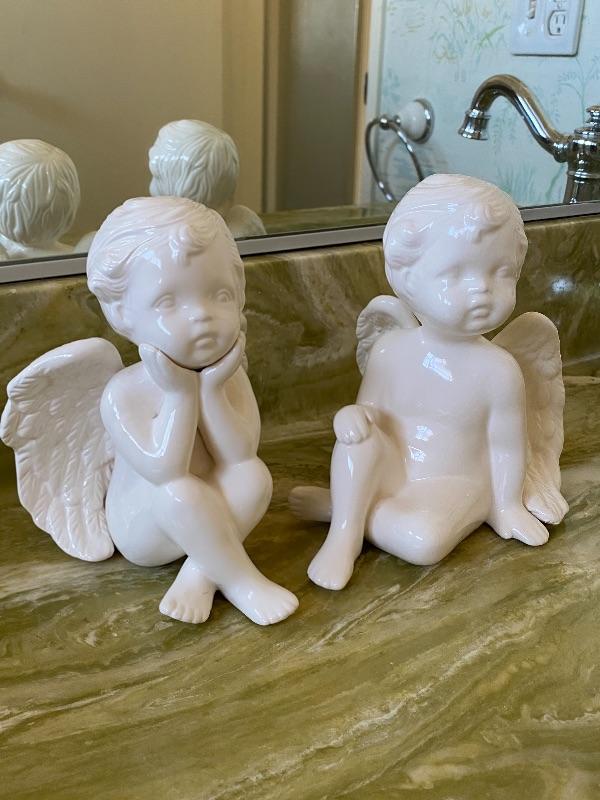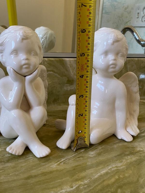 Pair of sitting cherub angels. Each in a different pose. Ceramic. About 6" size.