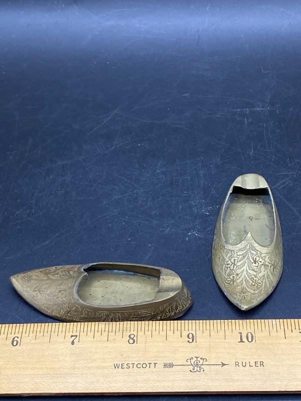 Pair of small brass slipper ash trays. Small, single cigarette use. Display great. About 3" in length.