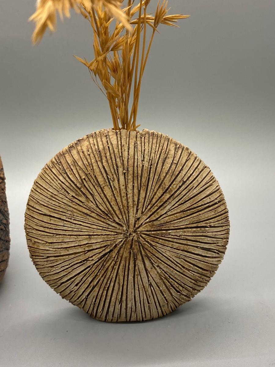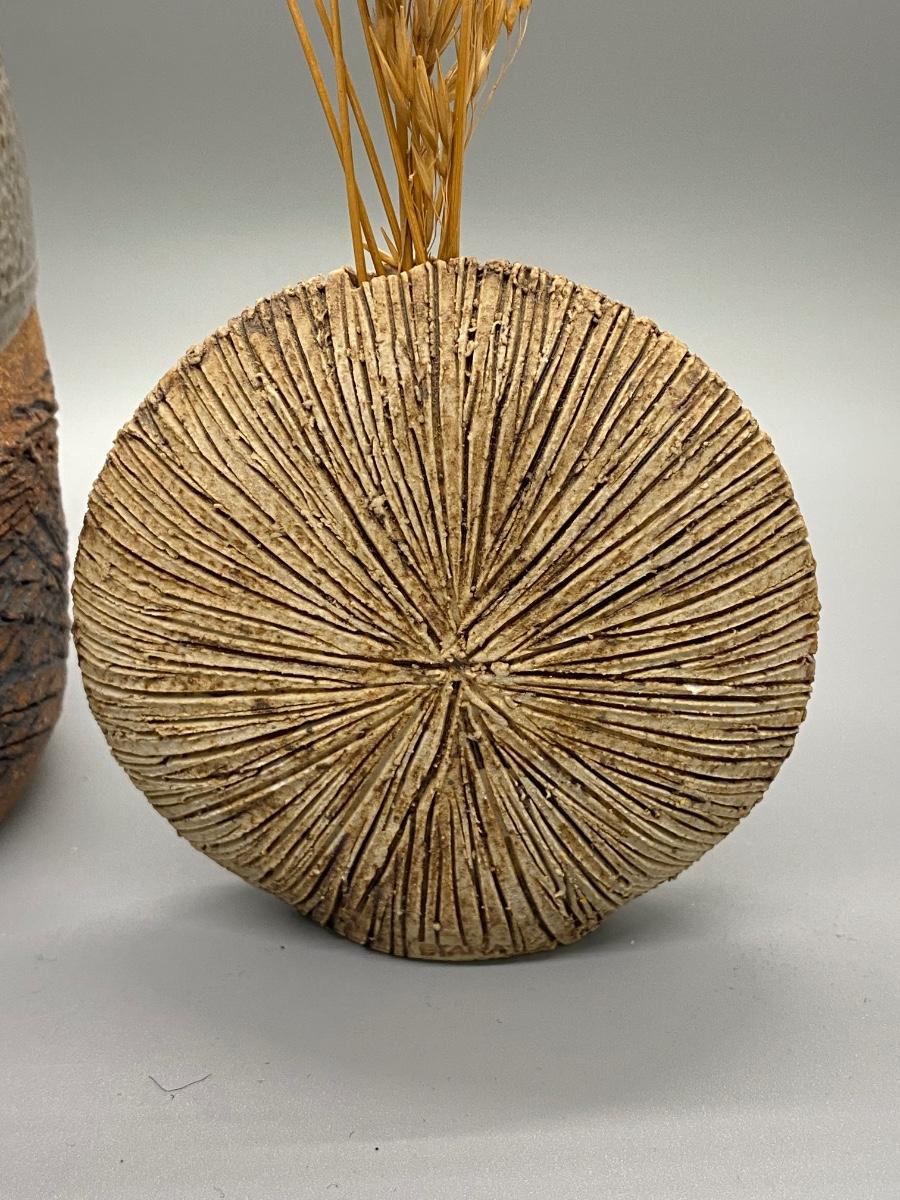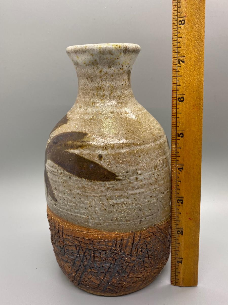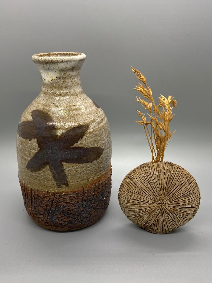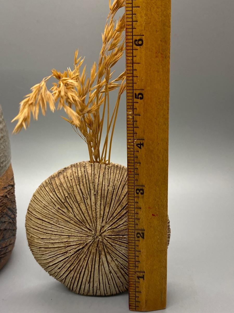 Pair of Small Brown MCM Abstract Home Decor Clay Pottery Vase Vessel & Faux Plant