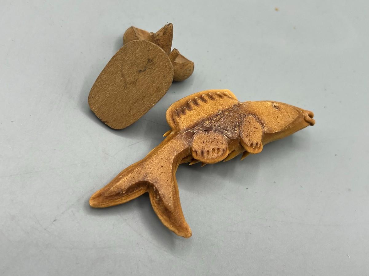 Pair of Small Carved Woodcraft Animals Mouse & Fish, there is some wear to the mouse and the fish has little to no wear. Check pictures for more details and for sizing.