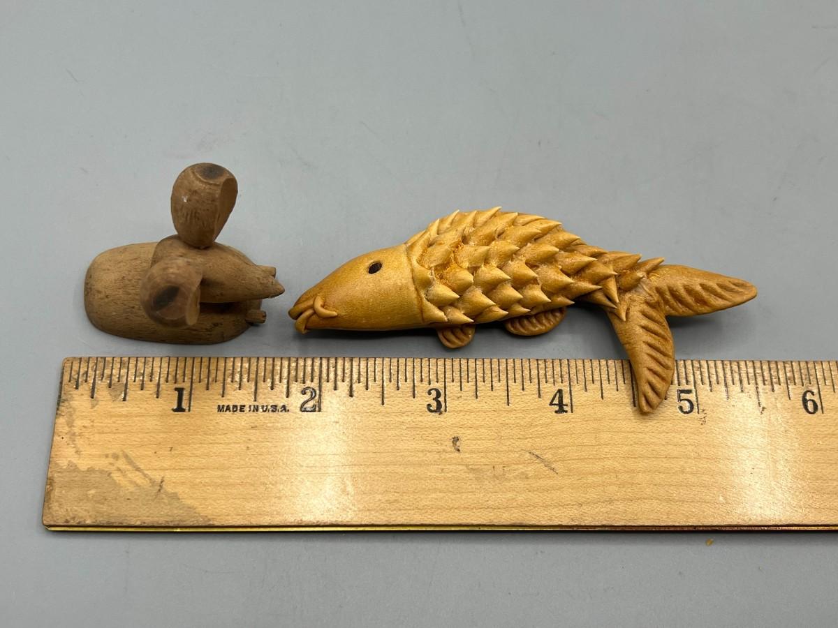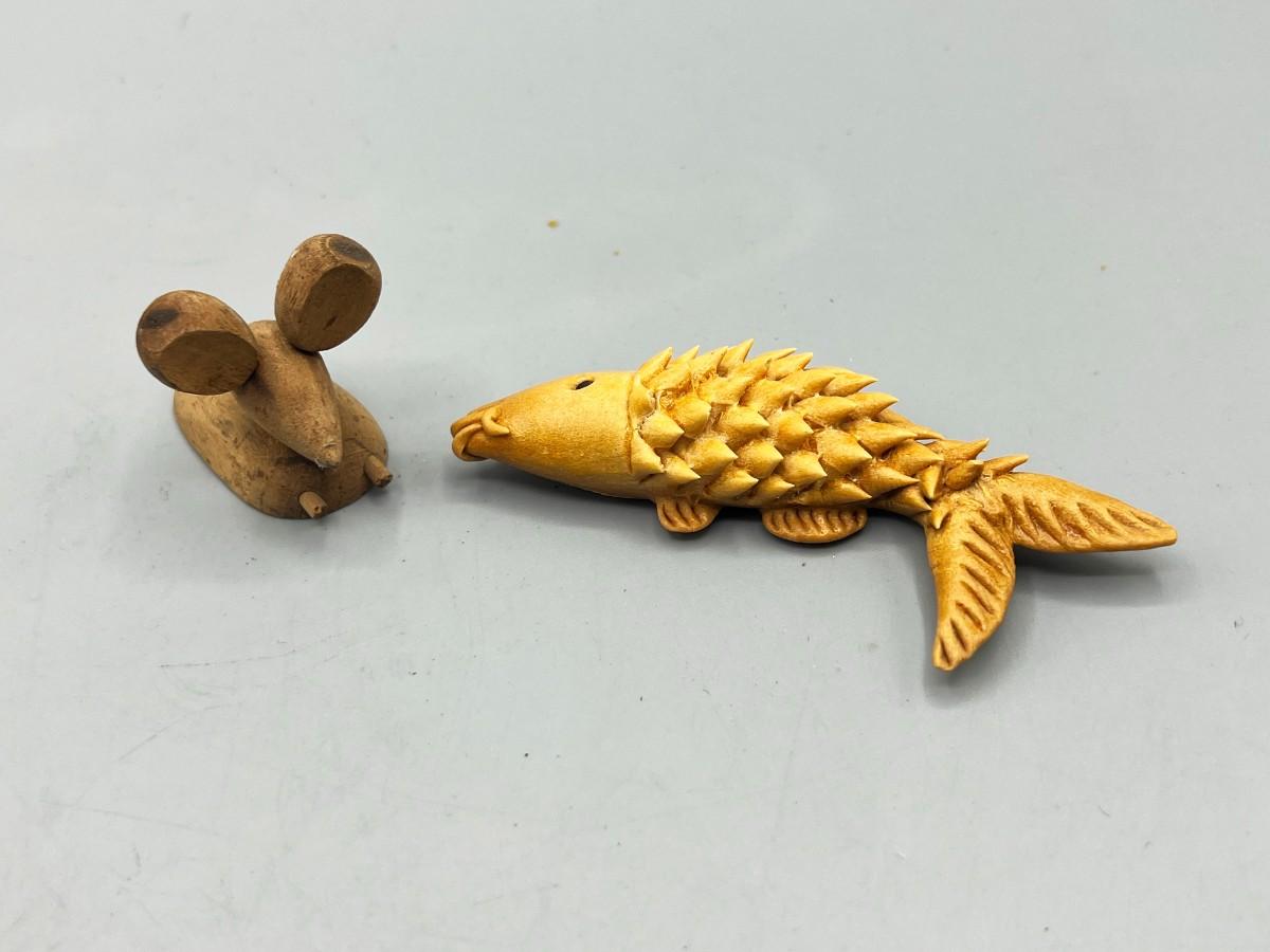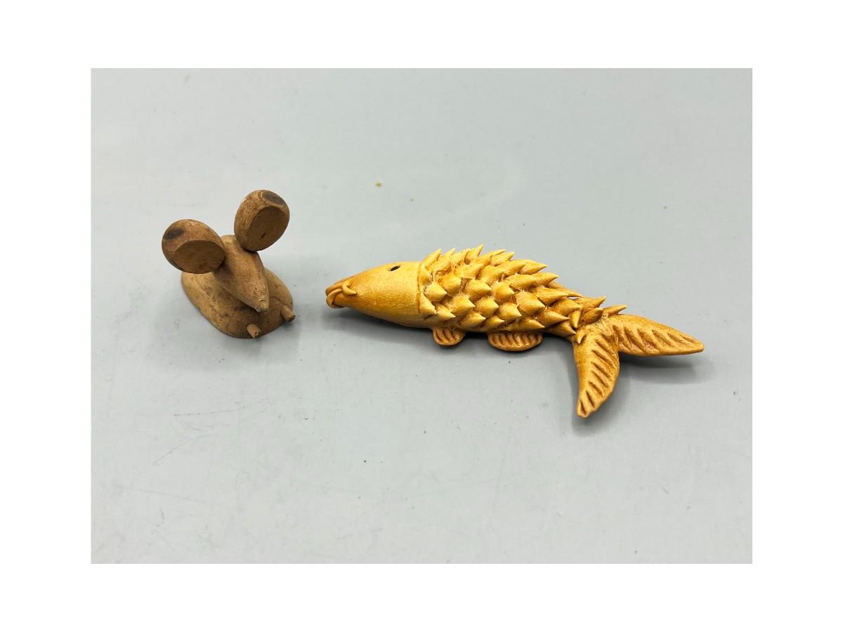 Pair of Small Carved Woodcraft Animals Mouse & Fish