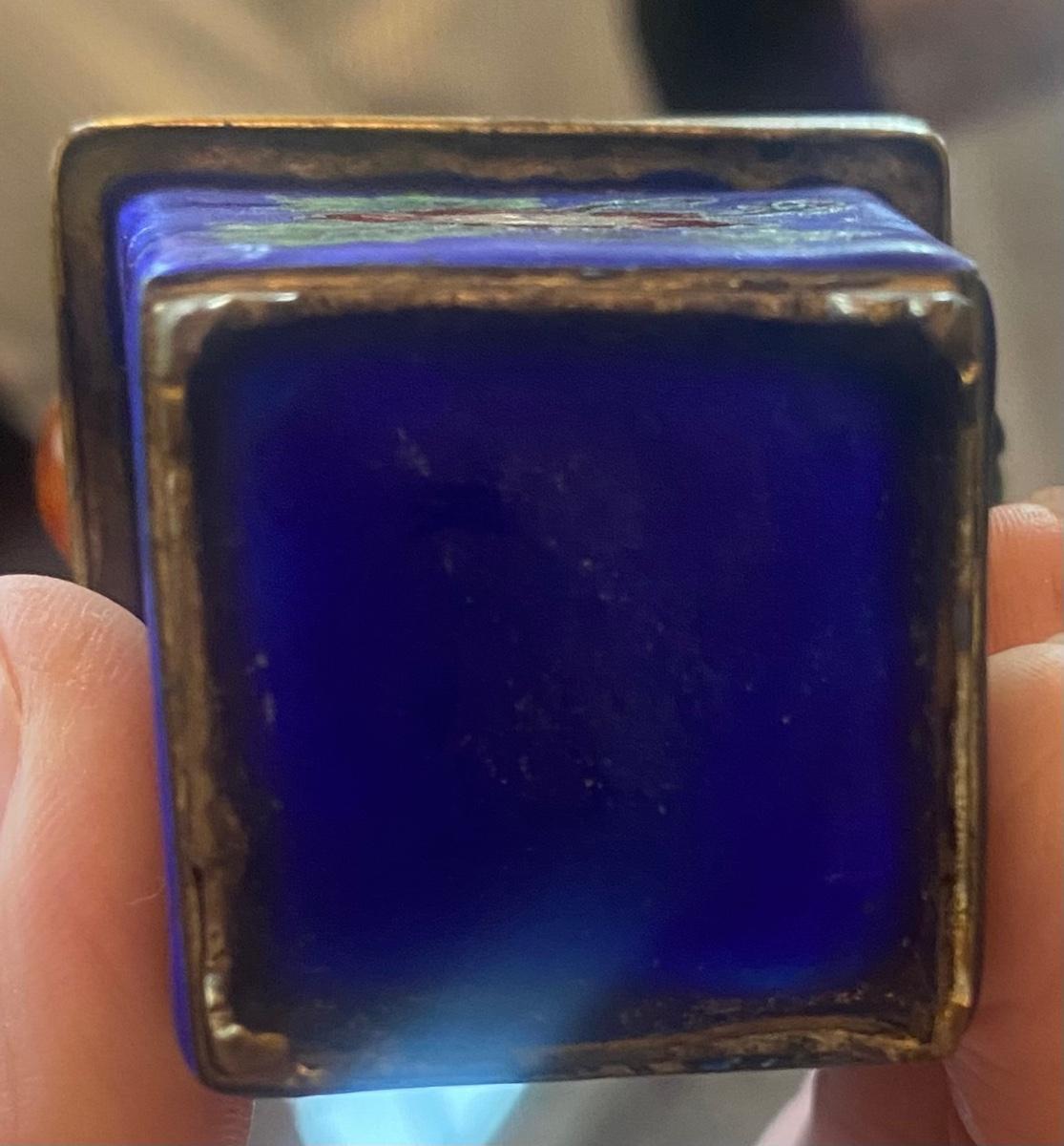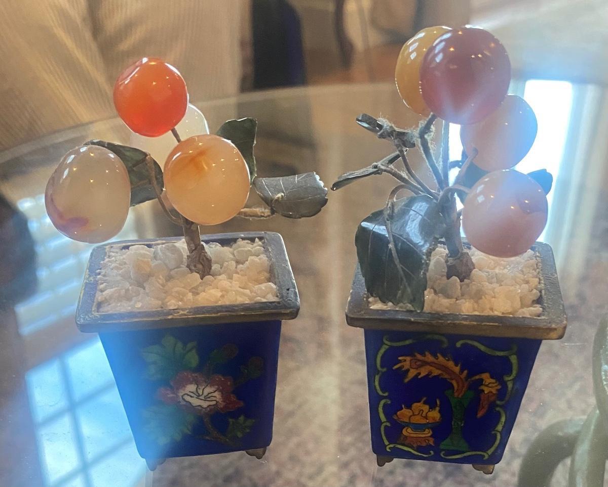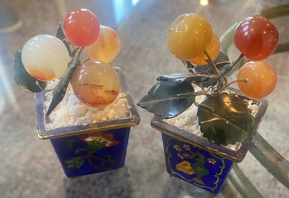 Pair of Small Cloisonné Pots with Stone Flowers & jade leaves