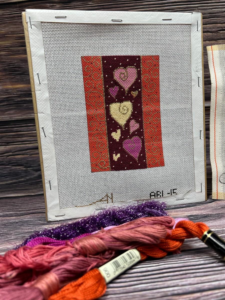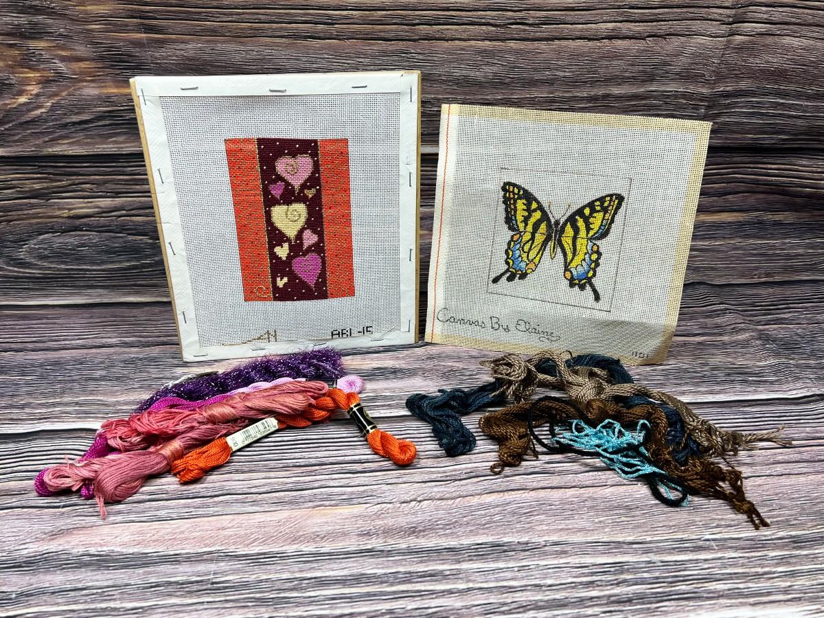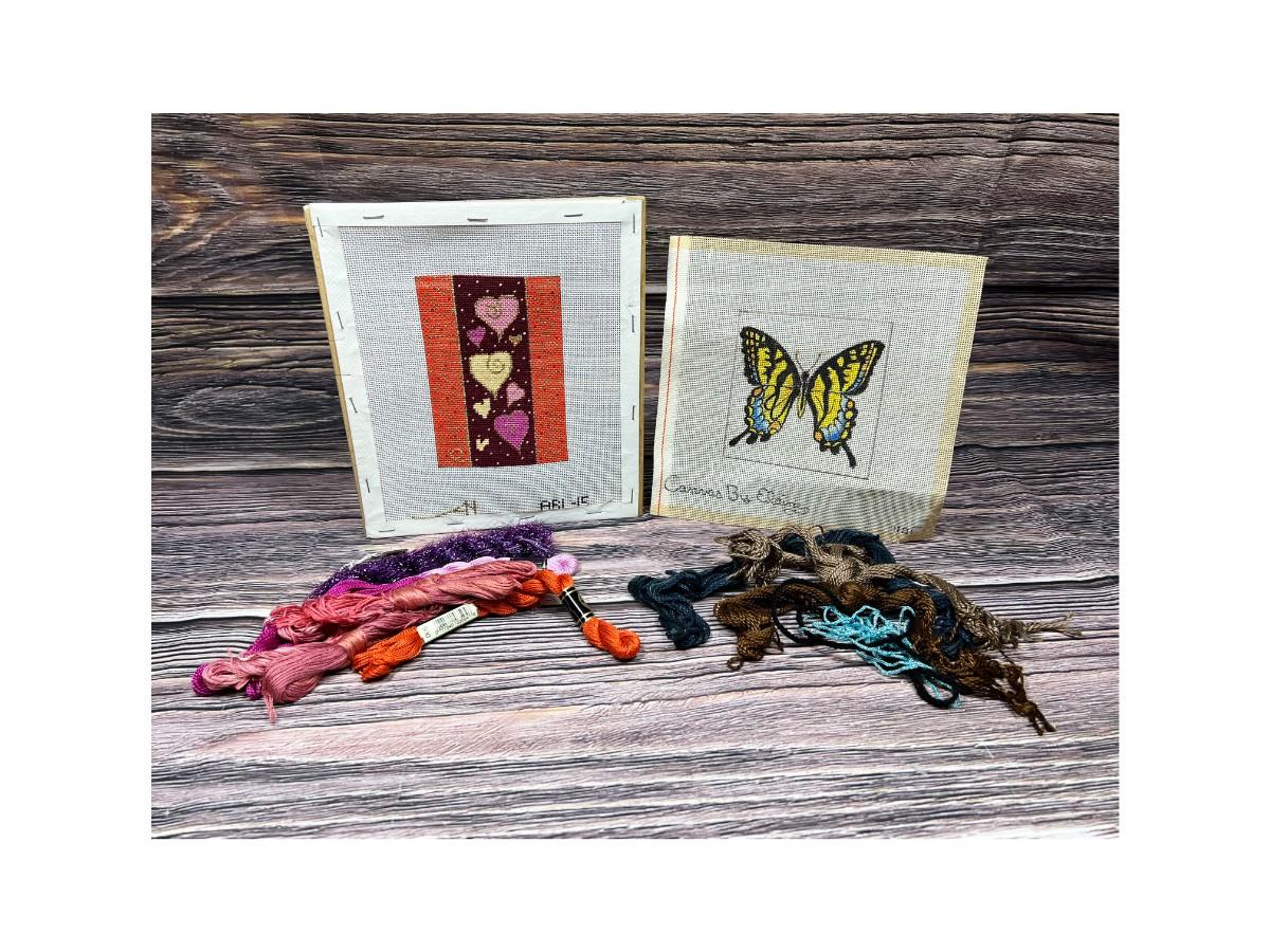 Pair of Small Colorful Needlepoint Design Canvases Cute Hearts & Butterfly with Crafting Yarn