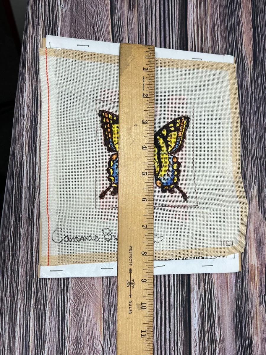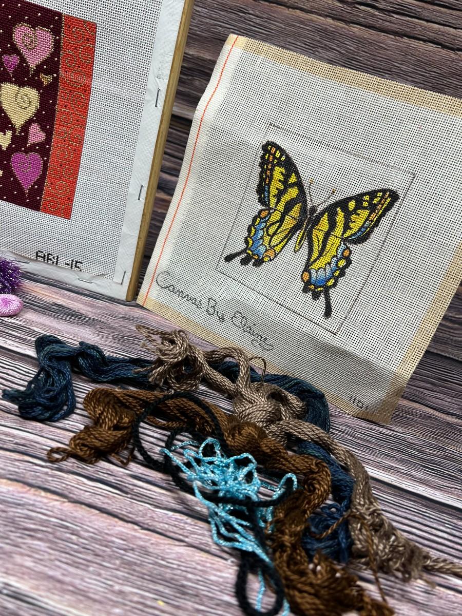 Pair of Small Colorful Needlepoint Designs Cute Hearts & Butterfly with Crafting Yarn, there is no significant damage to the canvases and is in good useable condition. Check pictures for more details and for sizing.