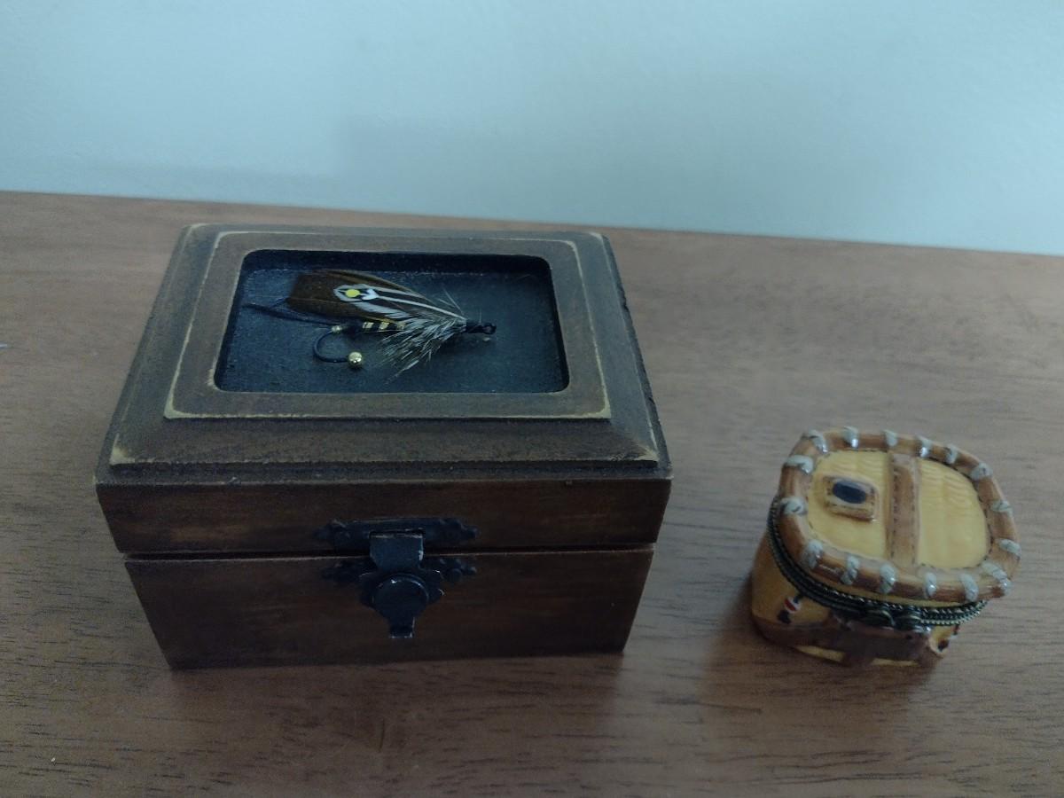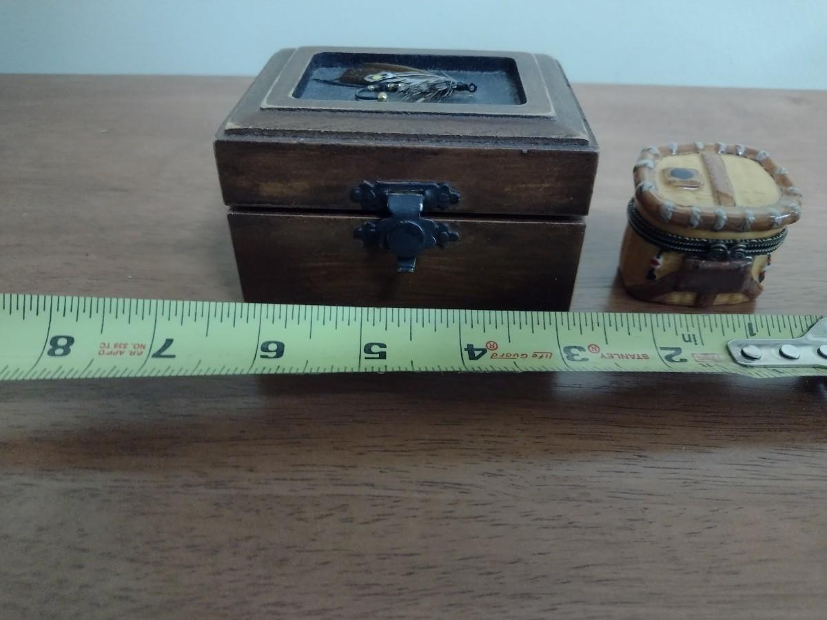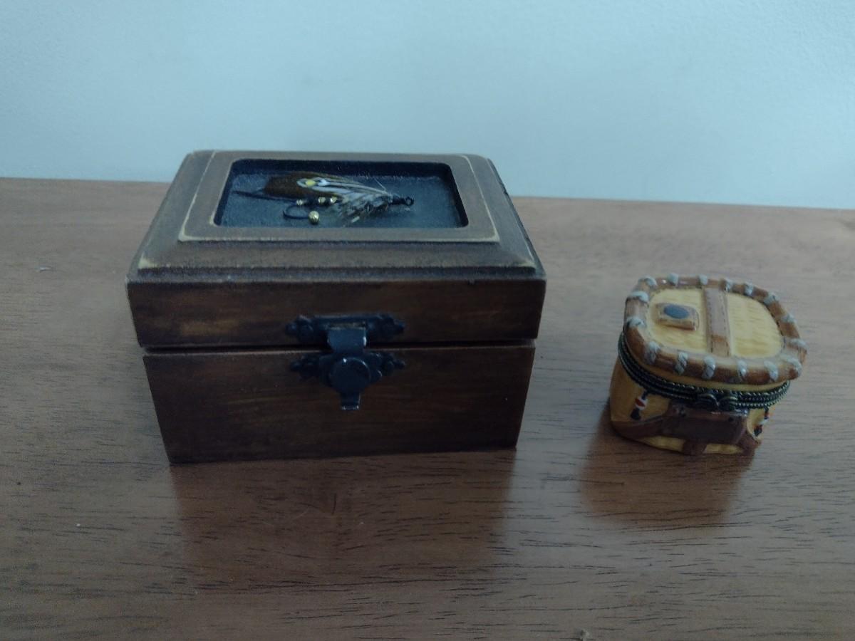 Pair of Small Flyfishing Trinket Boxes Wood Fly and Ceramic Creel with Trout