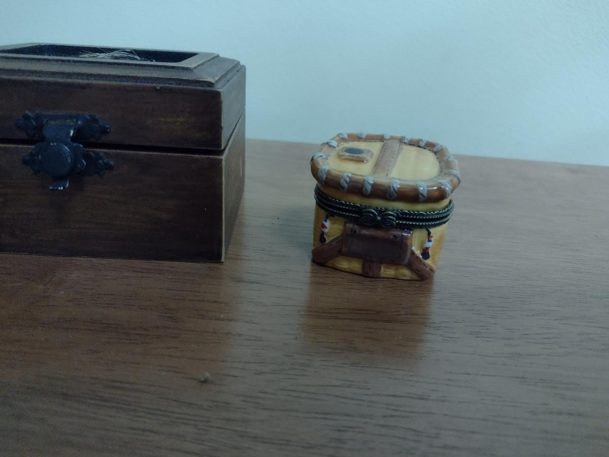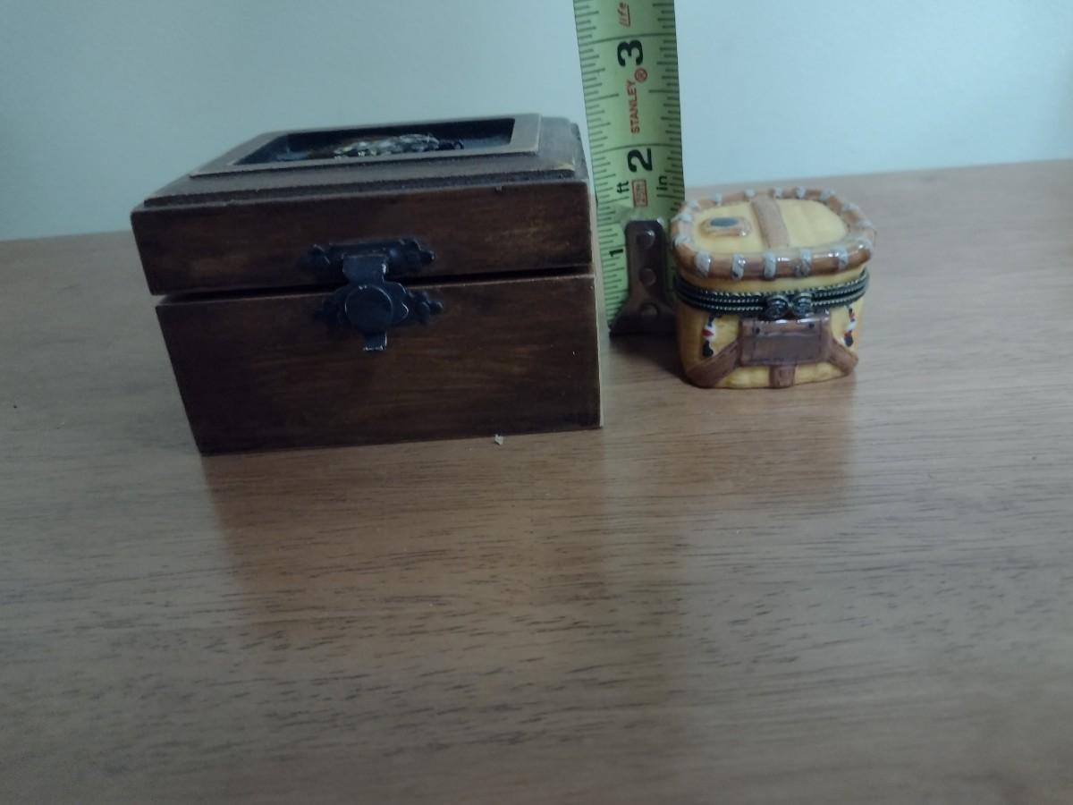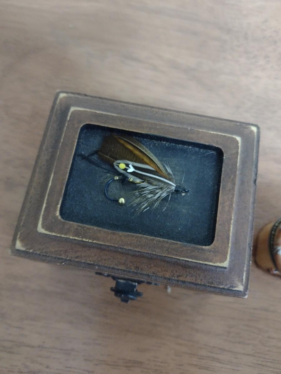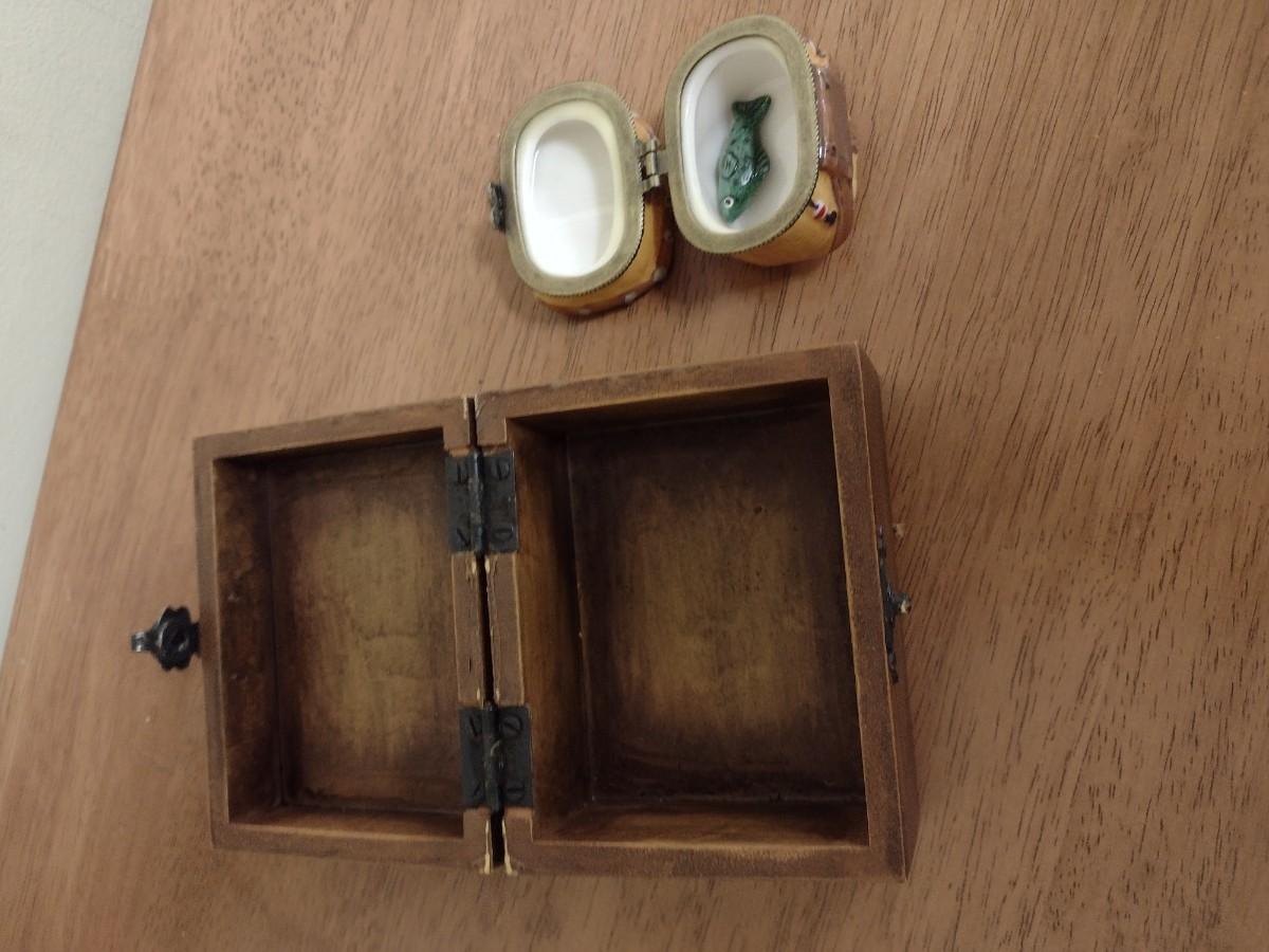 Pair of Small Flyfishing Trinket Boxes Wood Fly and Ceramic Creel with Trout
