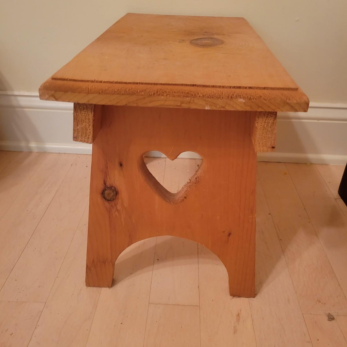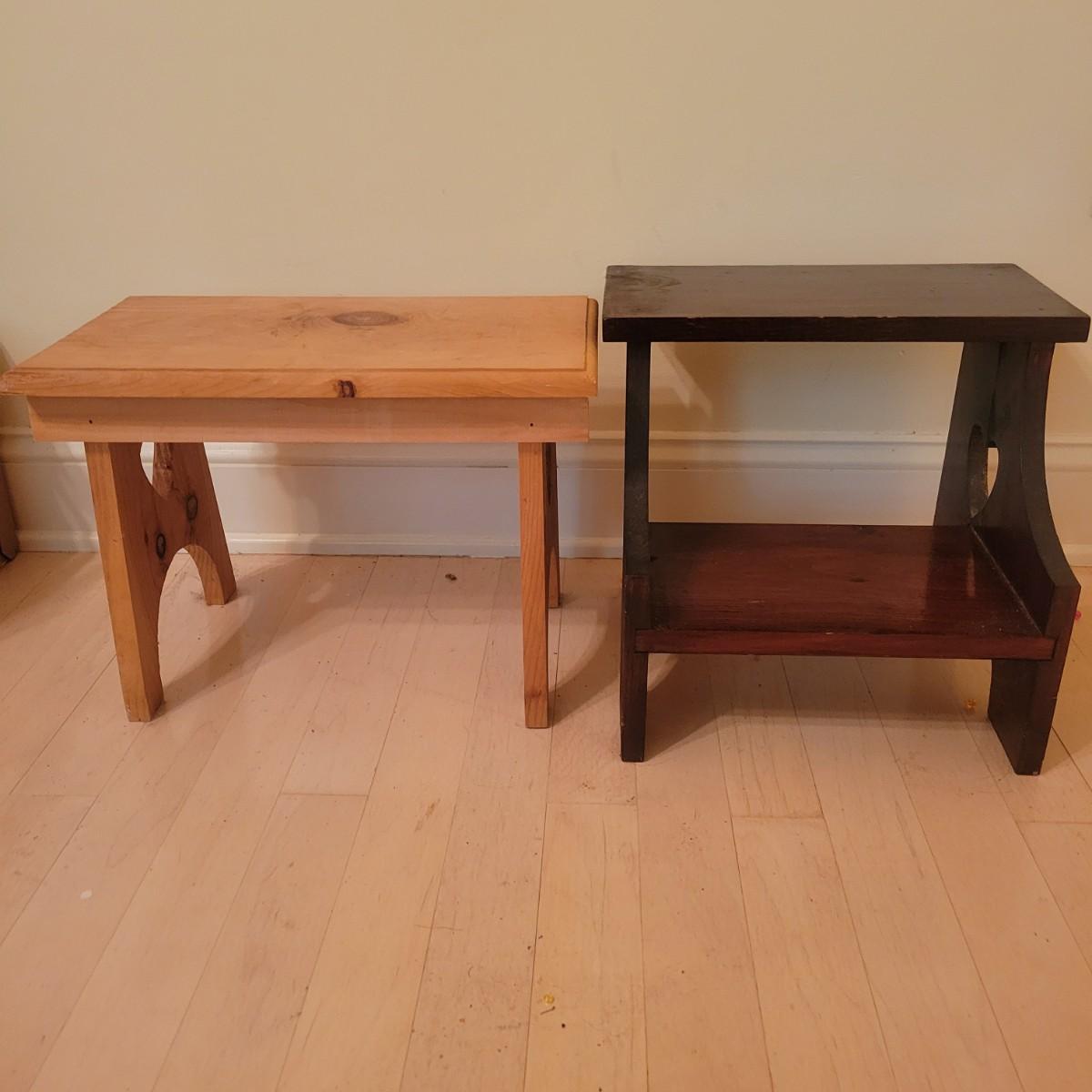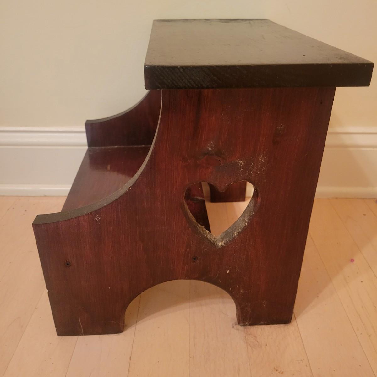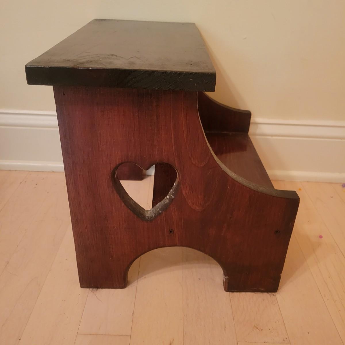 A pair of solid wood footstools in good condition with some minor blemishes. One footstool is unfinished with a small heart on each side. It is a little dirty, but could be easily cleaned and stained. Also included is a two step footstool that has a dark stain and a small heart on each side. This footstool measures approximately 14" x 11.5" x 12.5" Local pickup only