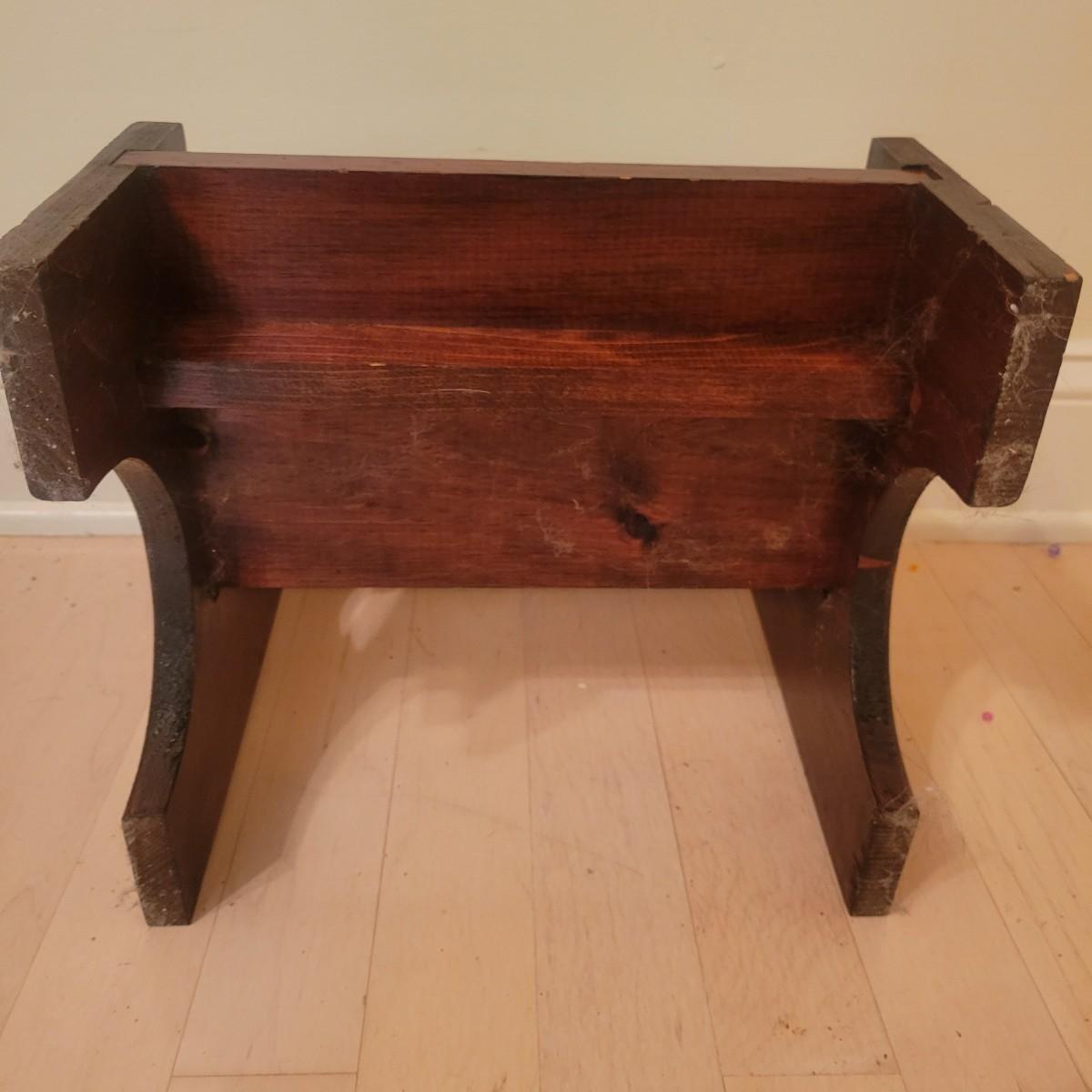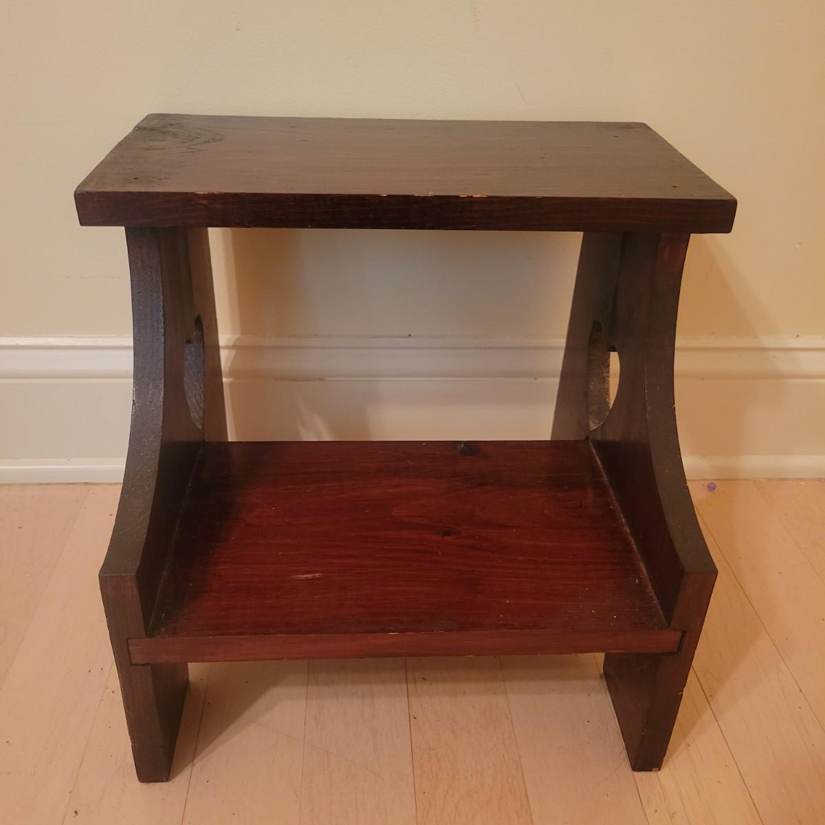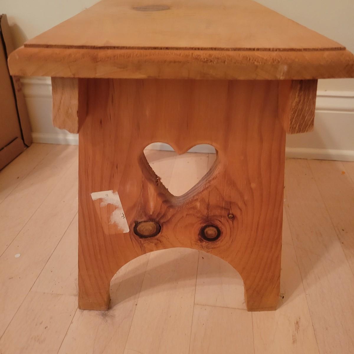 A pair of solid wood footstools in good condition with some minor blemishes. One footstool is unfinished with a small heart on each side. It is a little dirty, but could be easily cleaned and stained. Also included is a two step footstool that has a dark stain and a small heart on each side. This footstool measures approximately 14" x 11.5" x 12.5" Local pickup only
