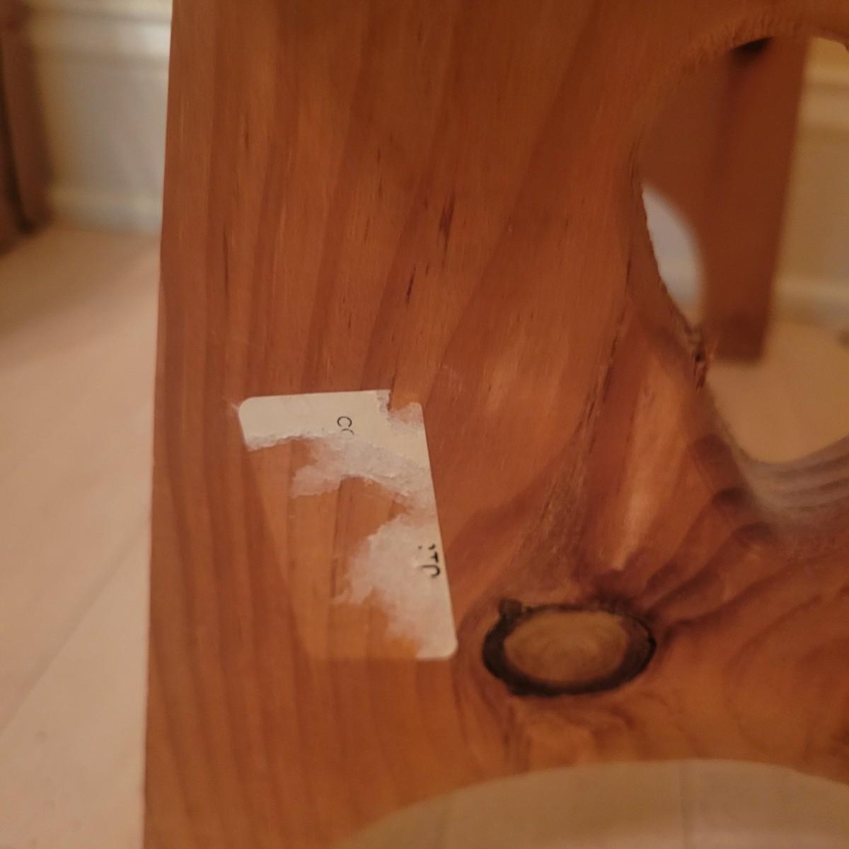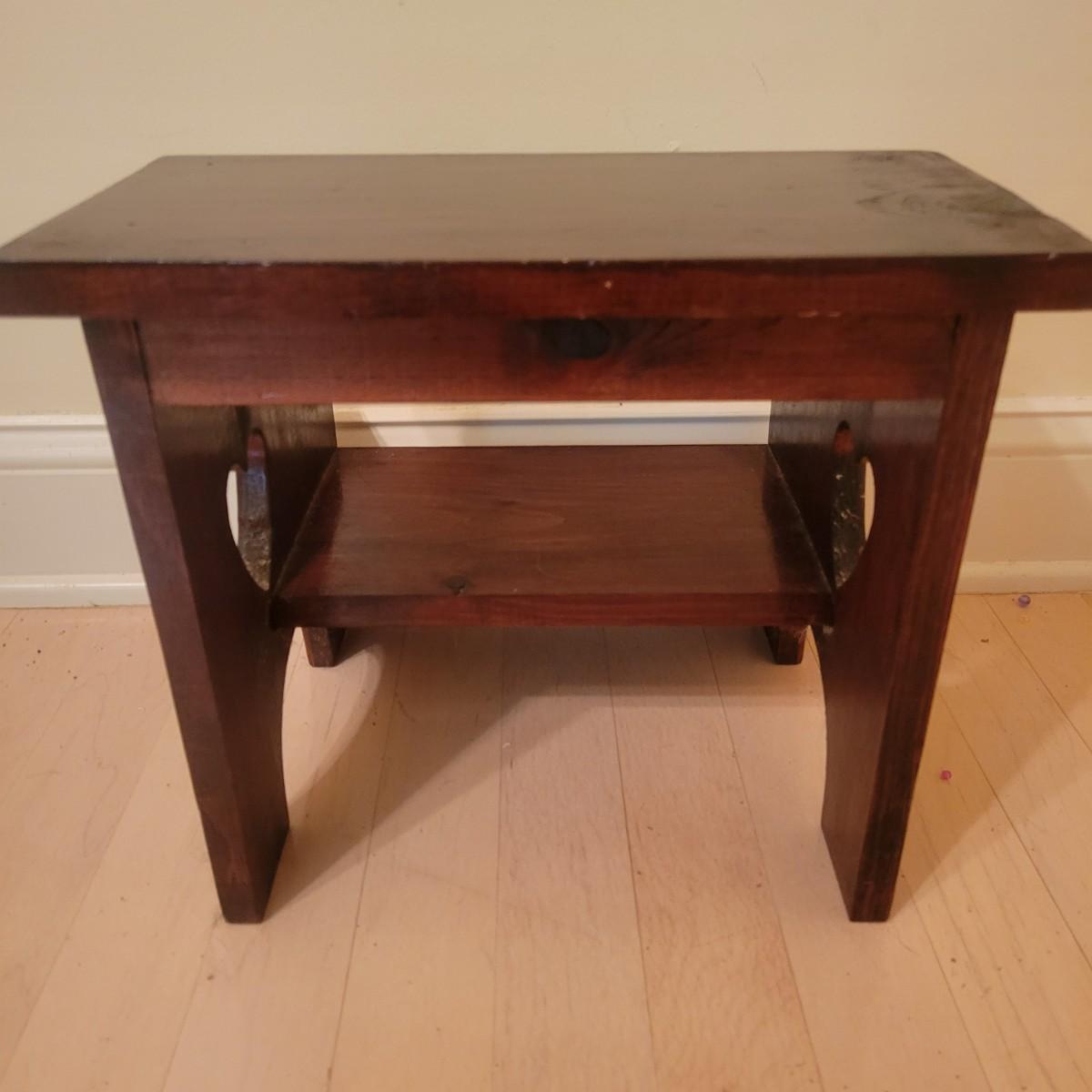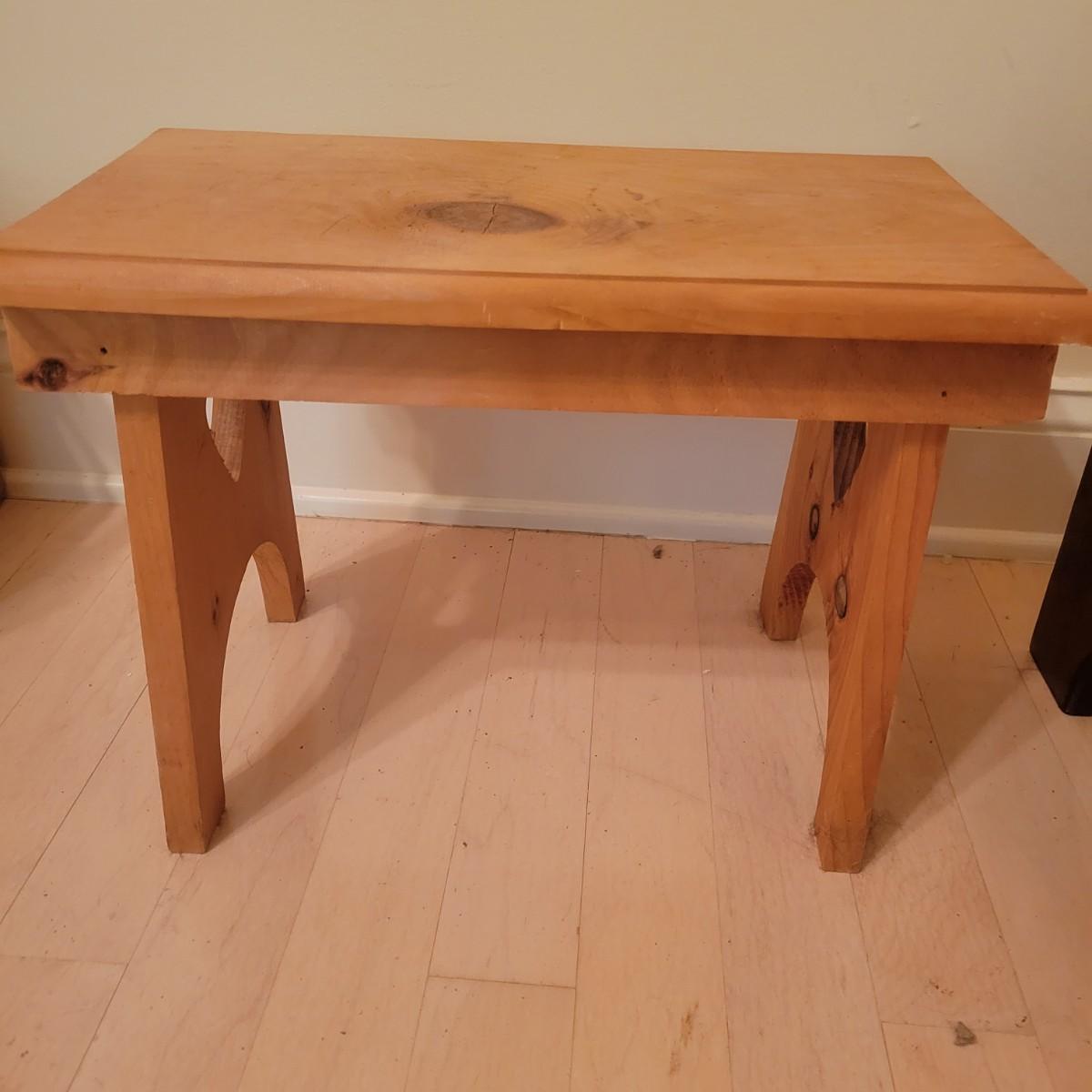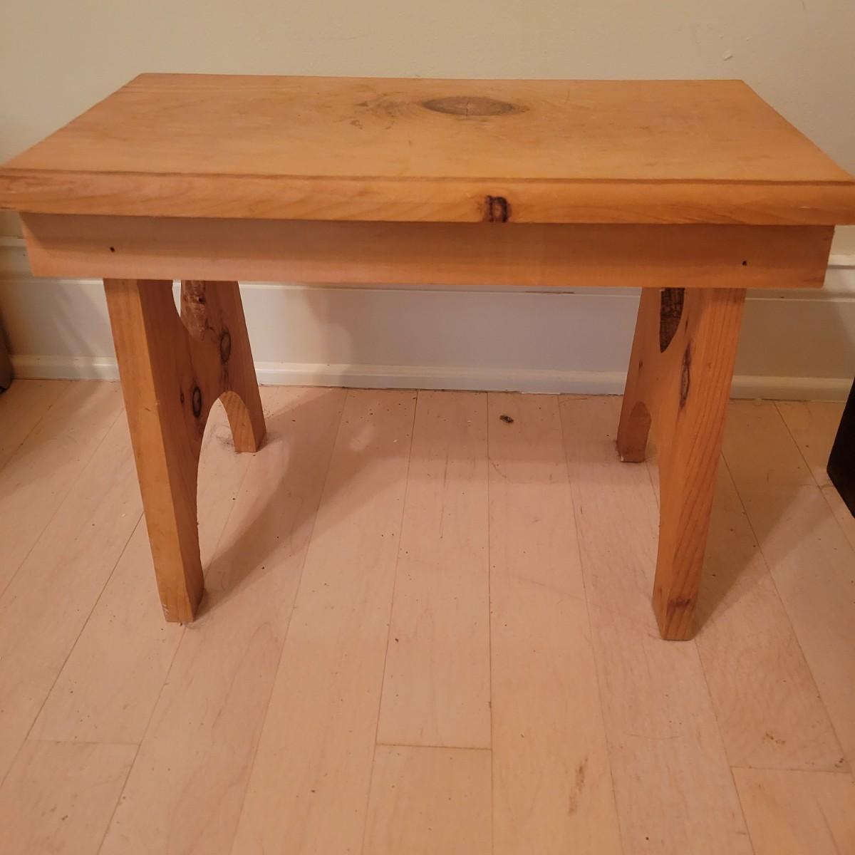 A pair of solid wood footstools in good condition with some minor blemishes. One footstool is unfinished with a small heart on each side. It is a little dirty, but could be easily cleaned and stained. Also included is a two step footstool that has a dark stain and a small heart on each side. This footstool measures approximately 14" x 11.5" x 12.5" Local pickup only
