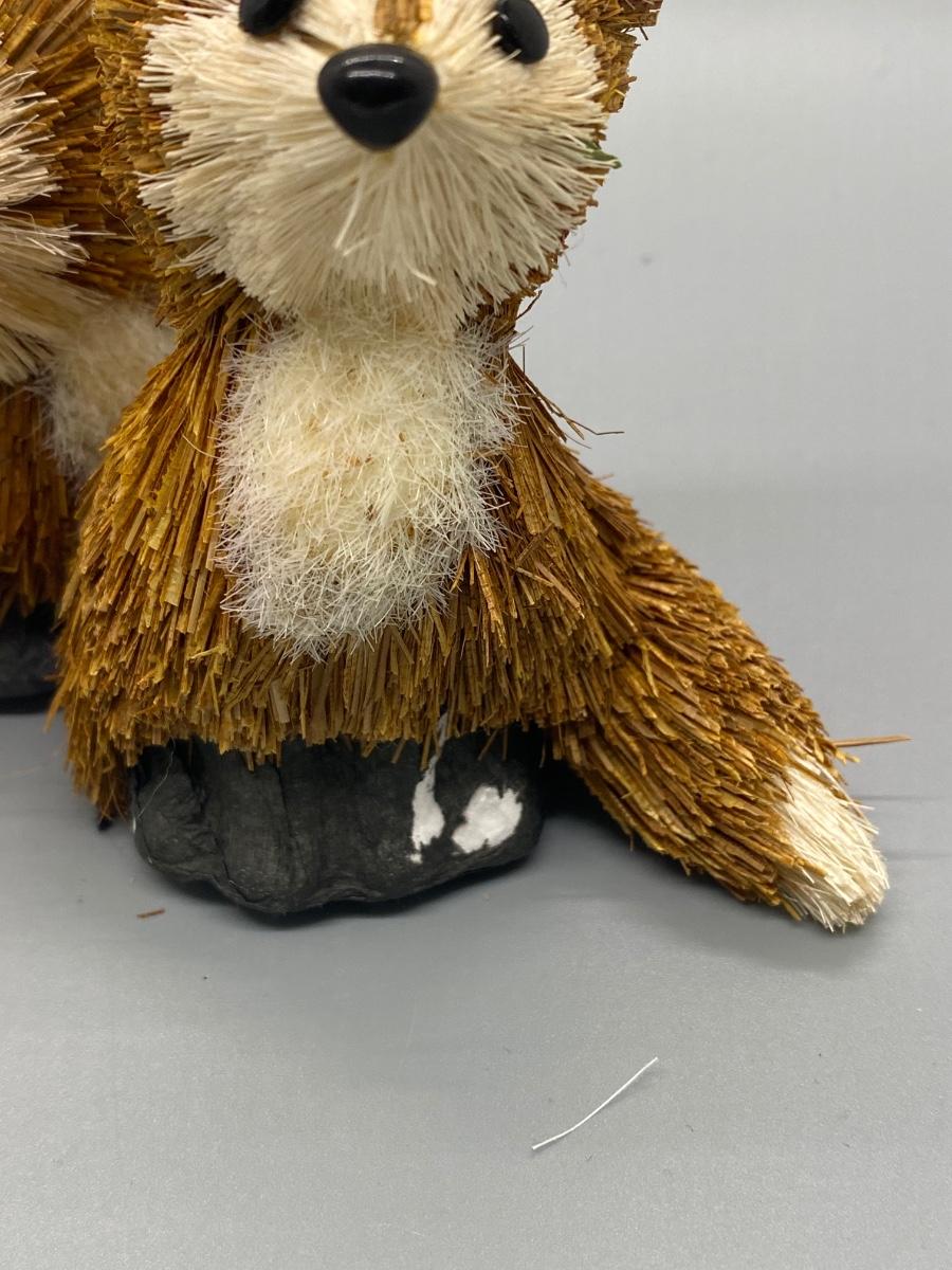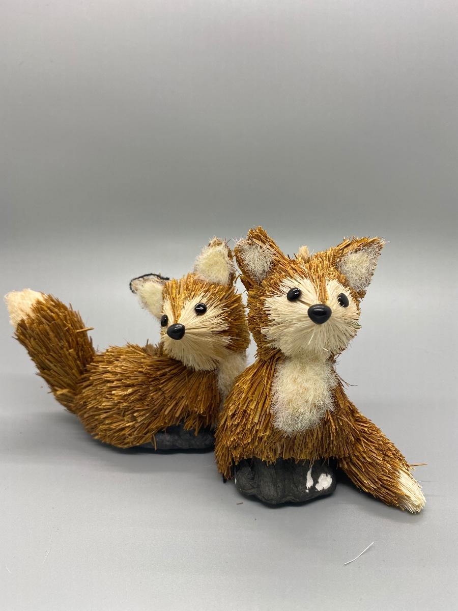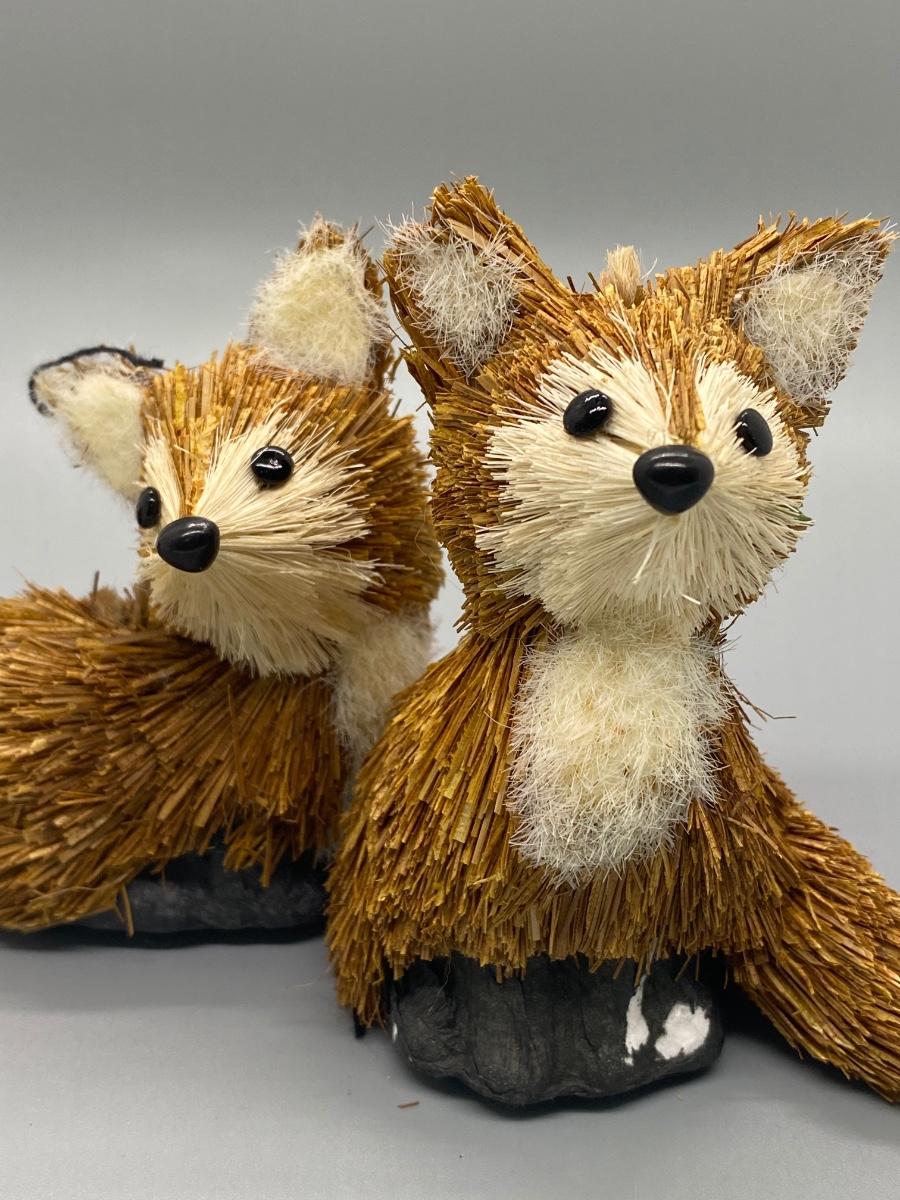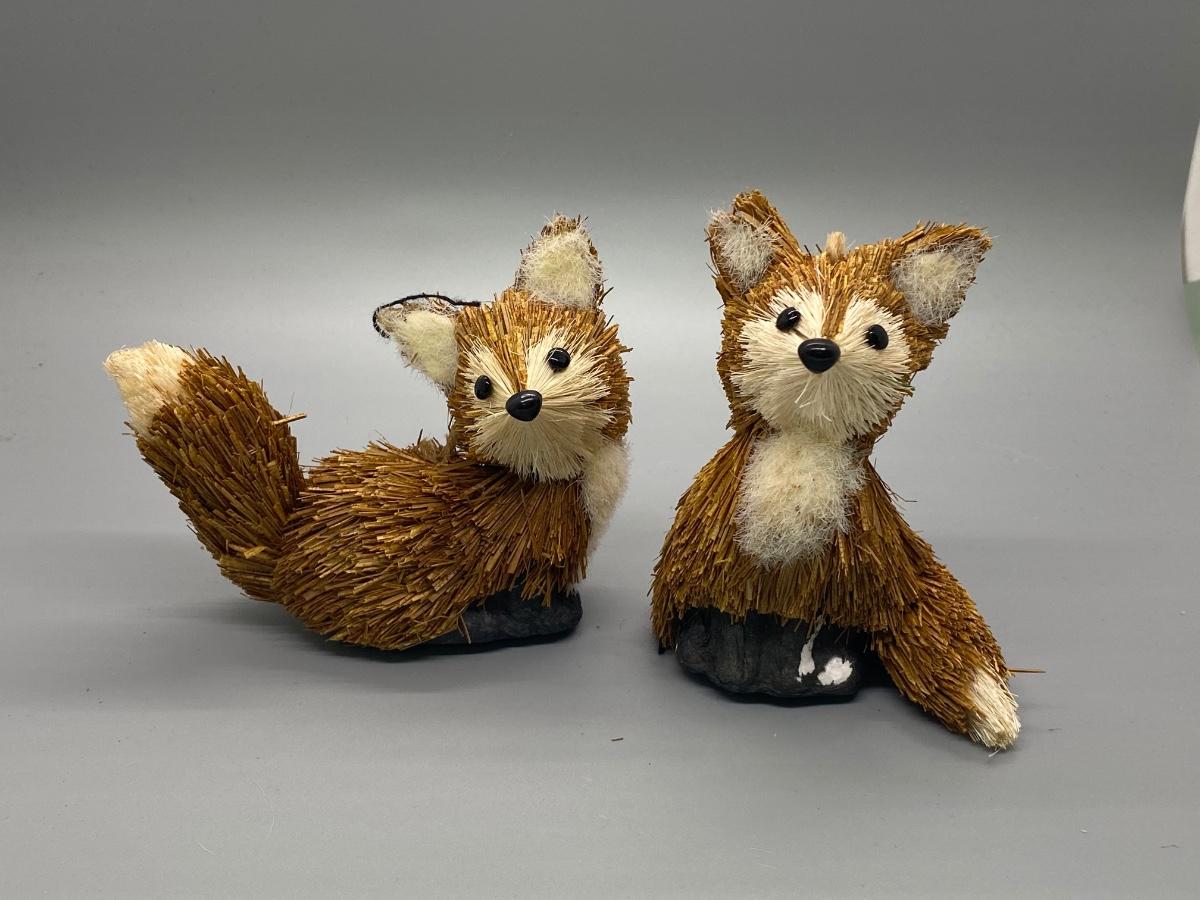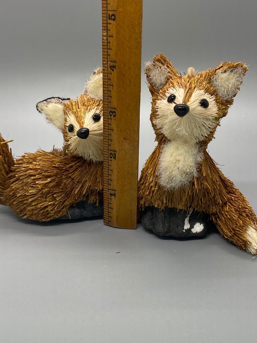 Pair of small fox figurine animals. Made of foam covered in natural materials like twigs/sticks. Lightweight. A little bit of damage on the feet of one, easy to repaint to fix. Great for seasonal decor, rustic decor, or for craft projects.