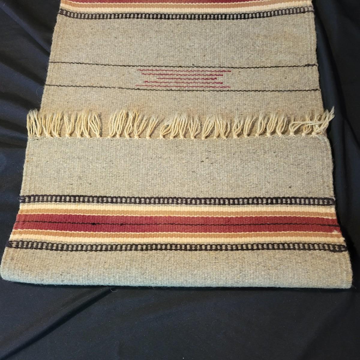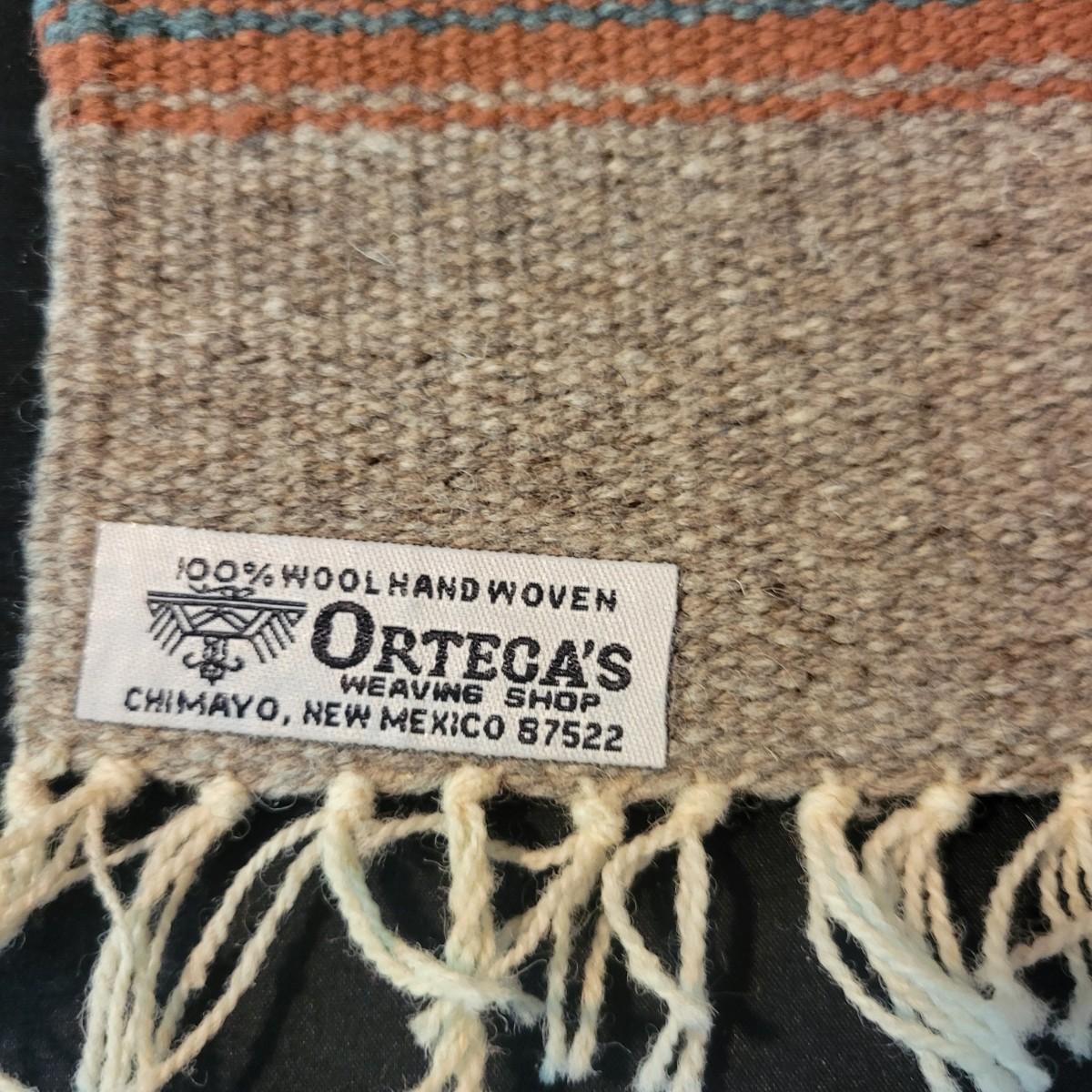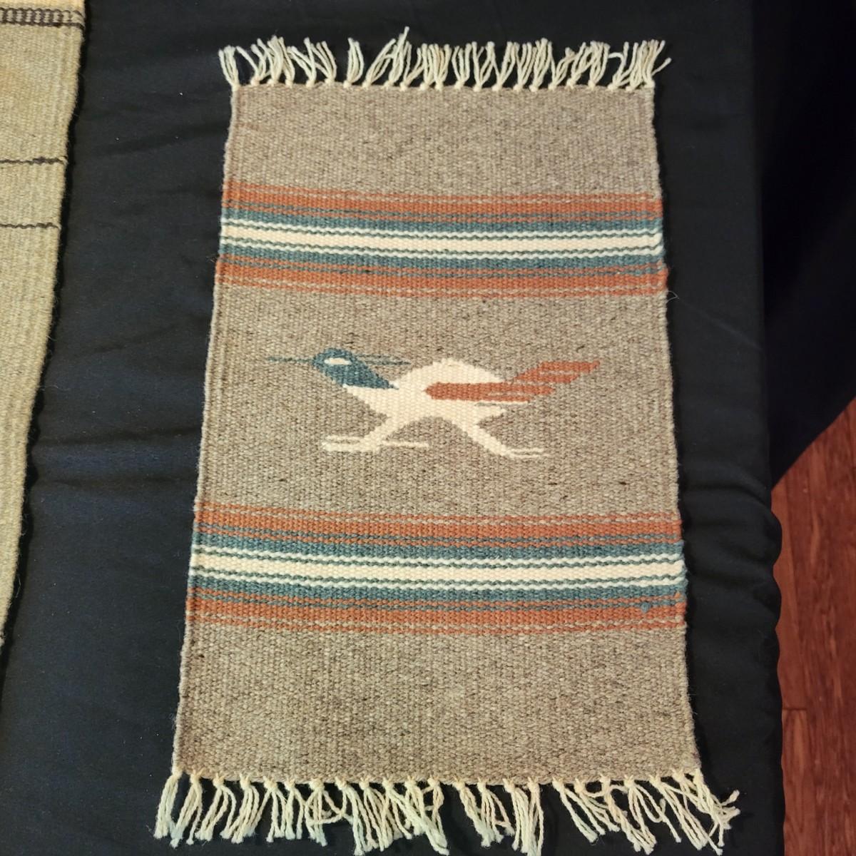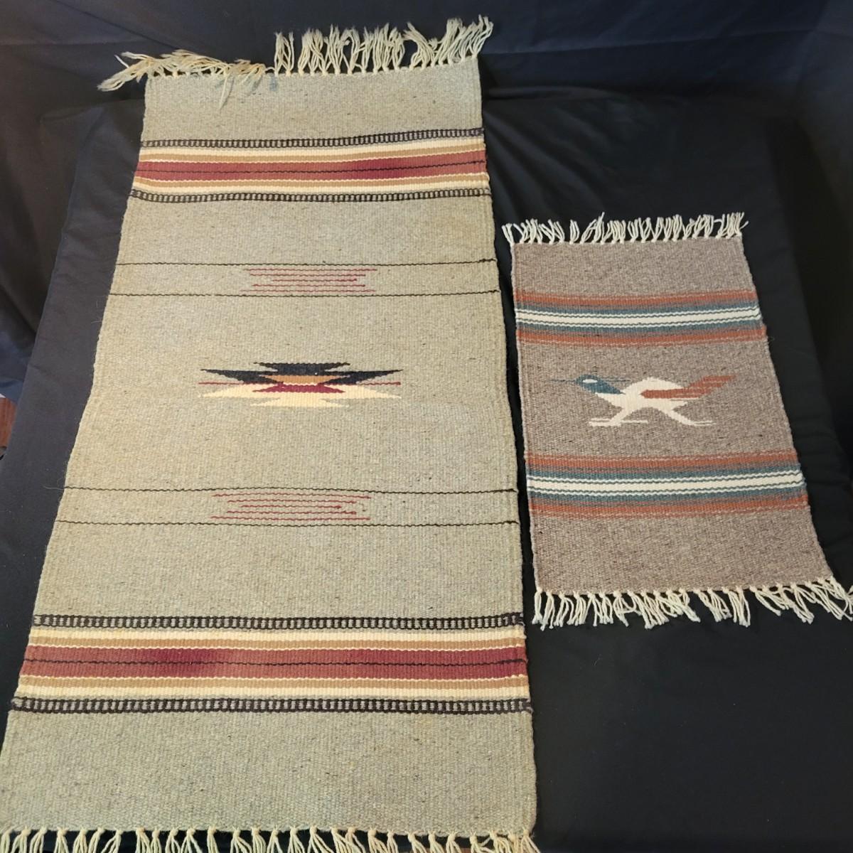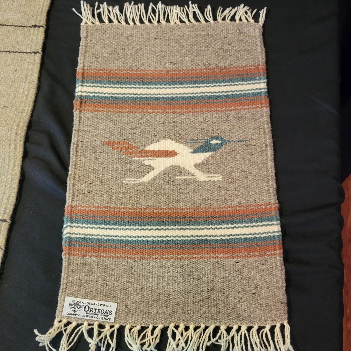 A pair of hand woven wool rugs in a style similar to Navajo rugs. The smaller piece was crafted by Ortega's Weaving Shop in Chimayo, NM. The other rug has a similar feel and style, but has no identifying label. It measures approximately 33.5" x 16". Shipping available