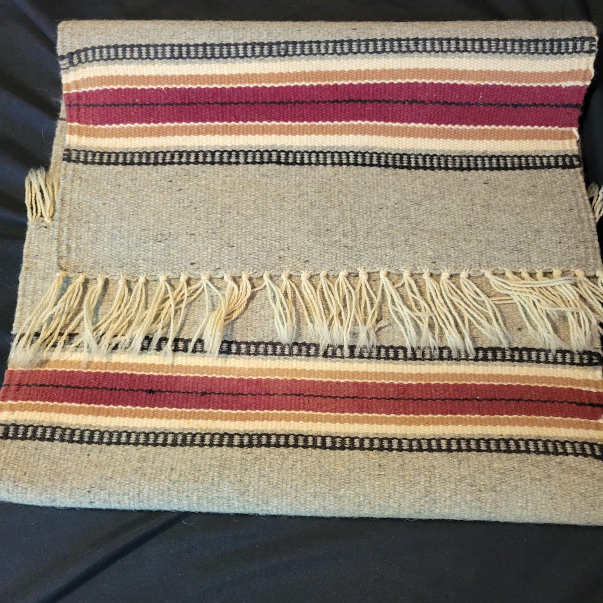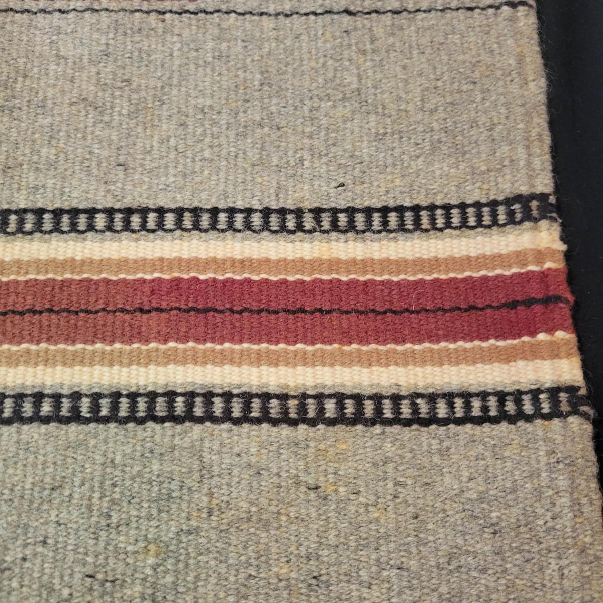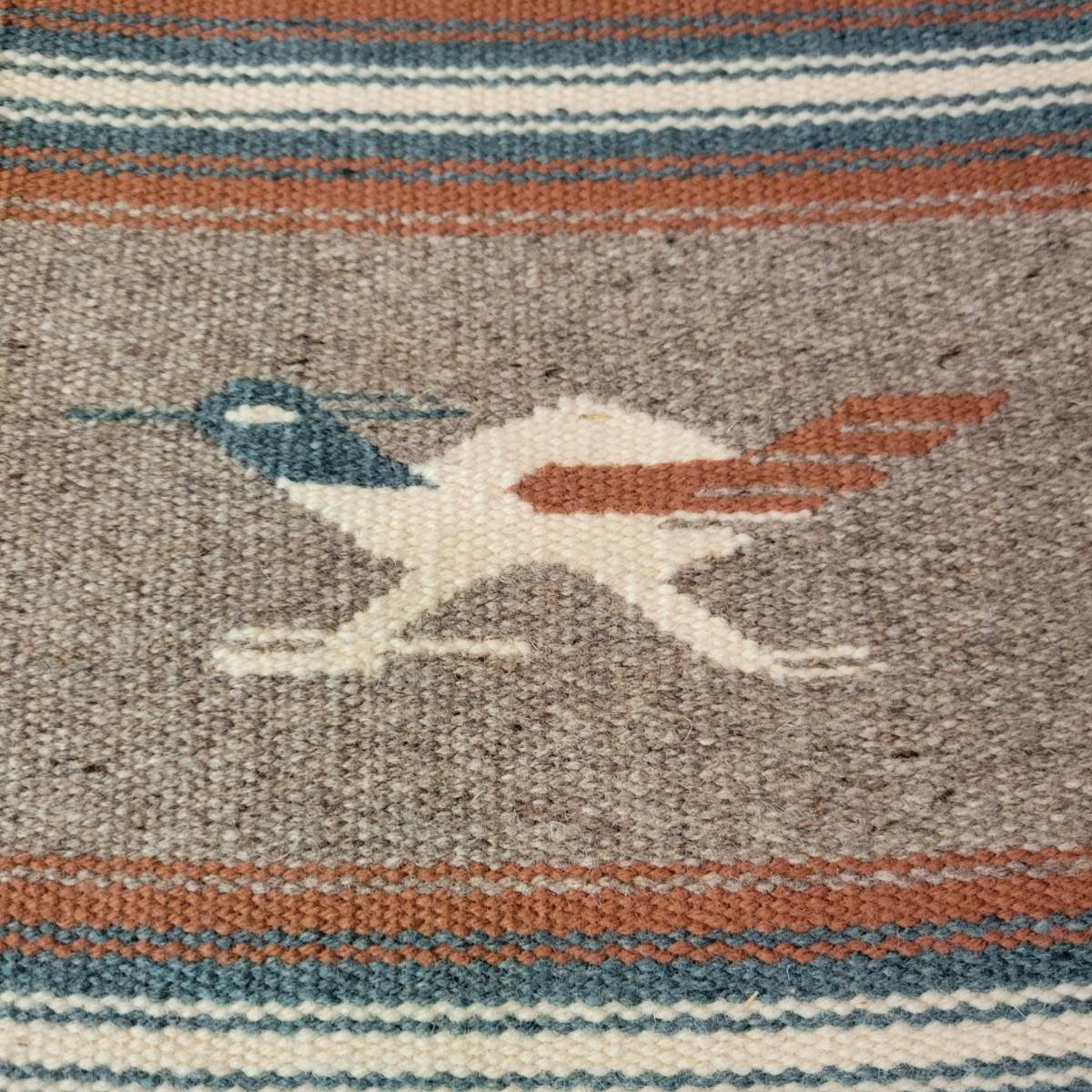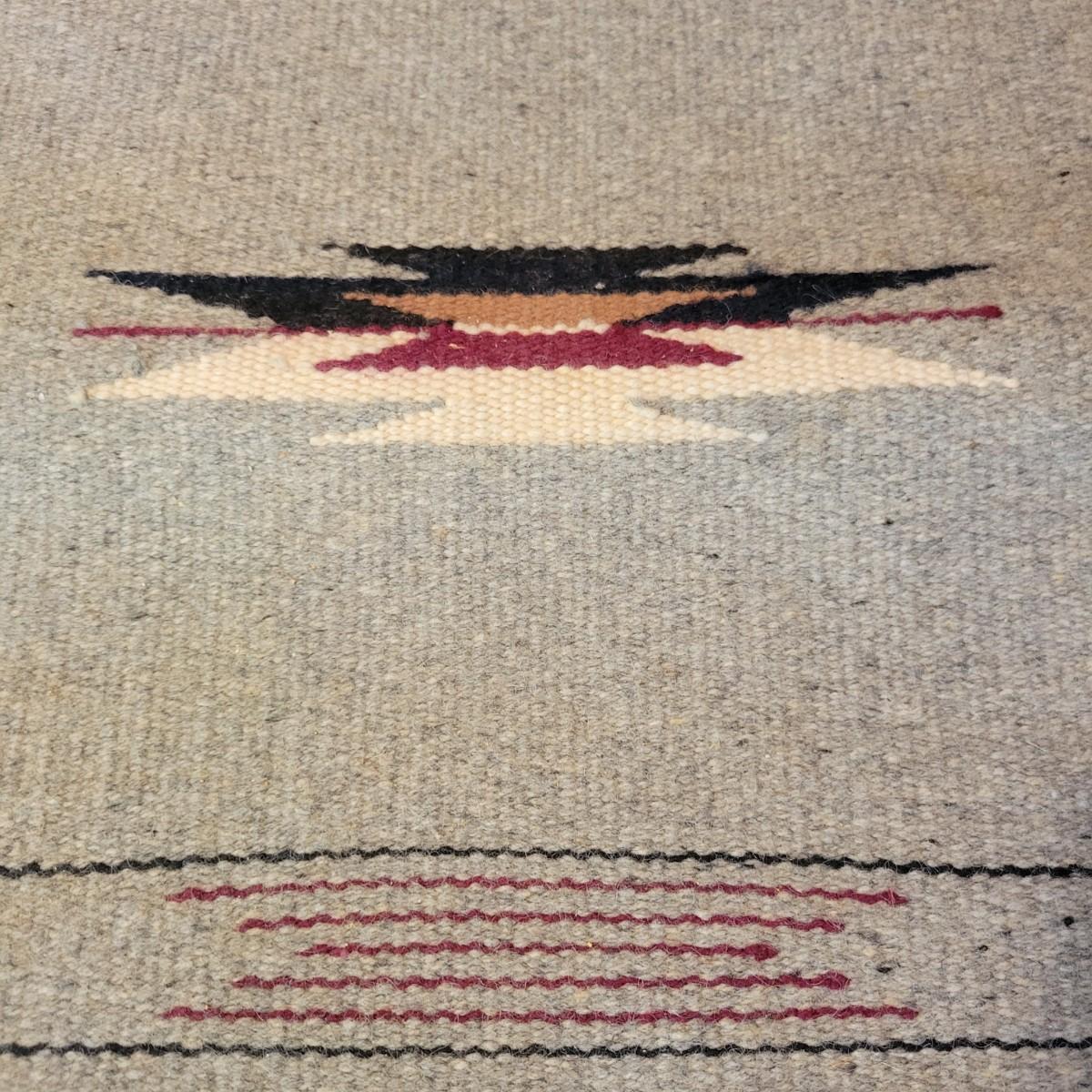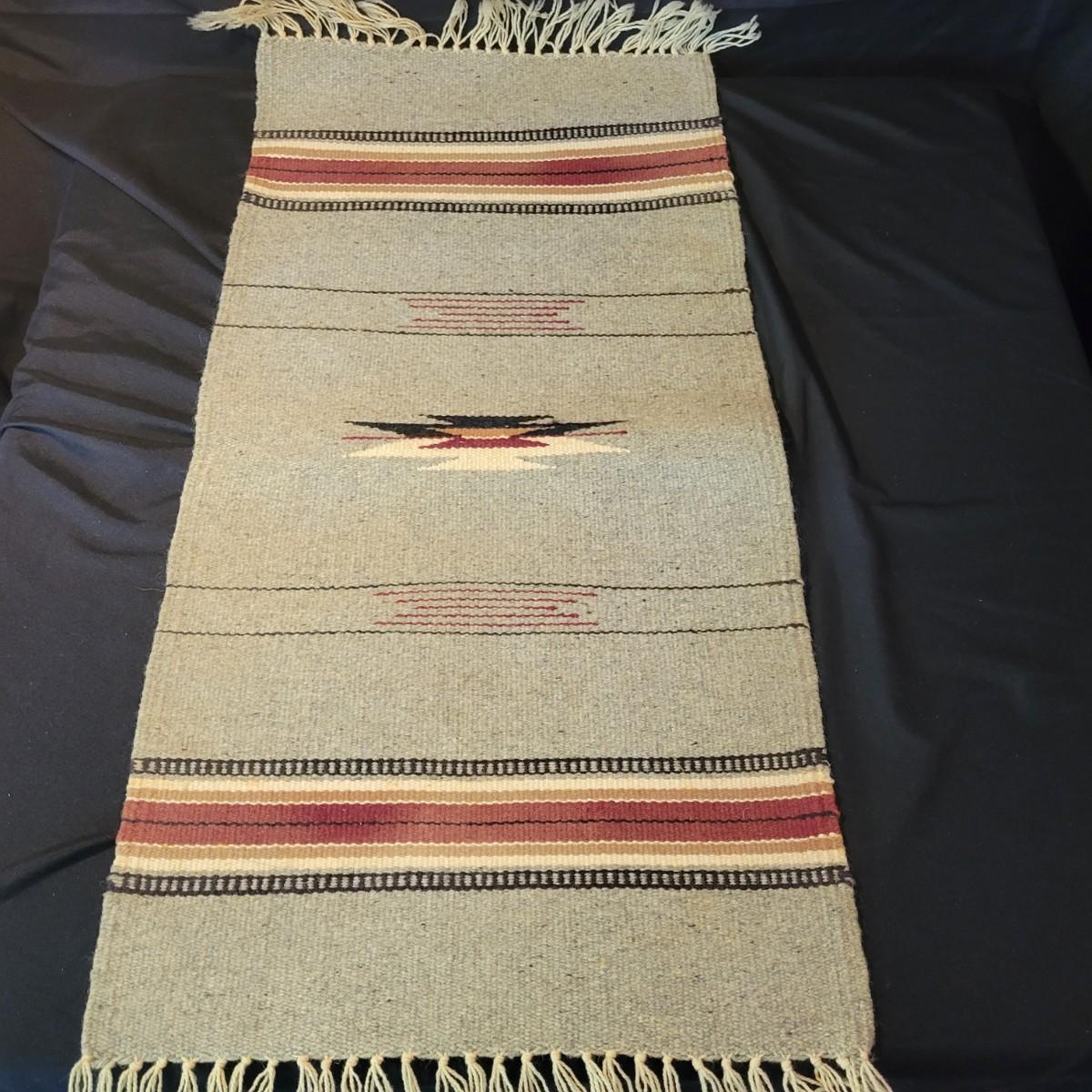 A pair of hand woven wool rugs in a style similar to Navajo rugs. The smaller piece was crafted by Ortega's Weaving Shop in Chimayo, NM. The other rug has a similar feel and style, but has no identifying label. It measures approximately 33.5" x 16". Shipping available