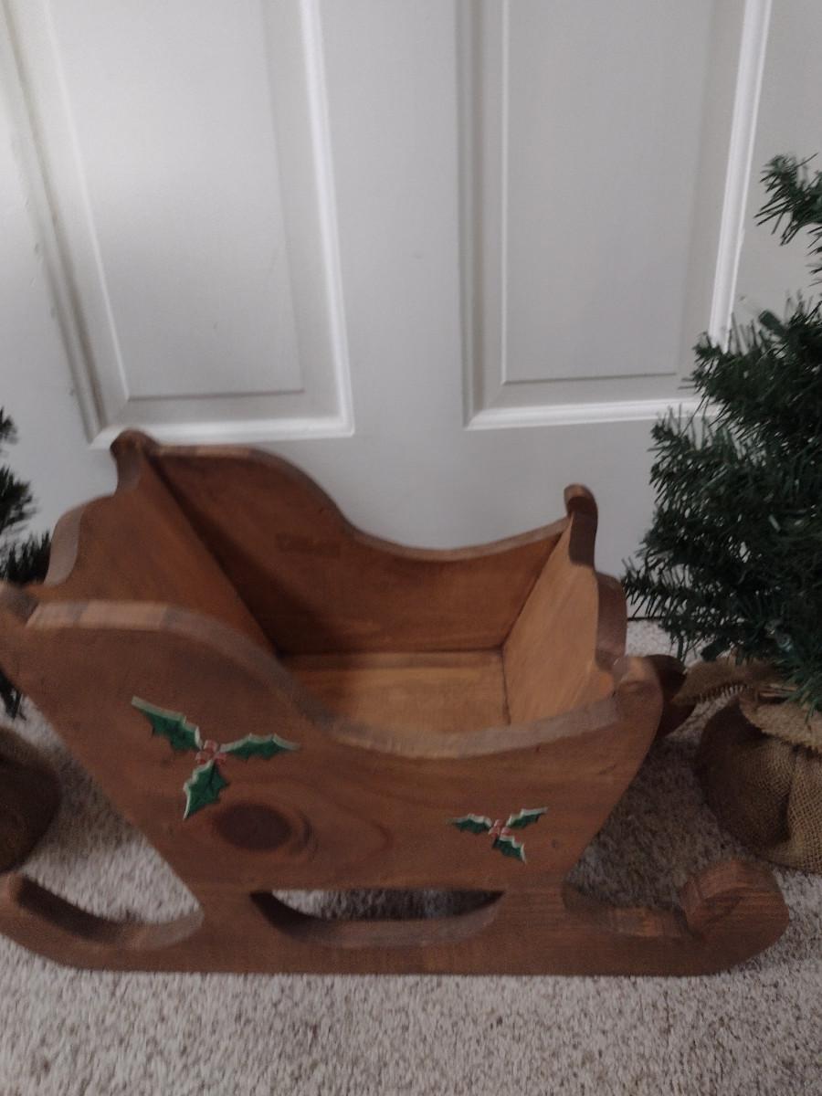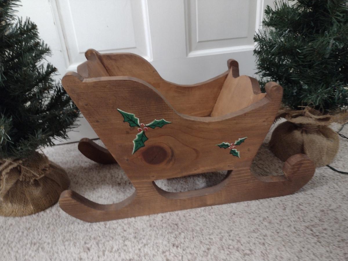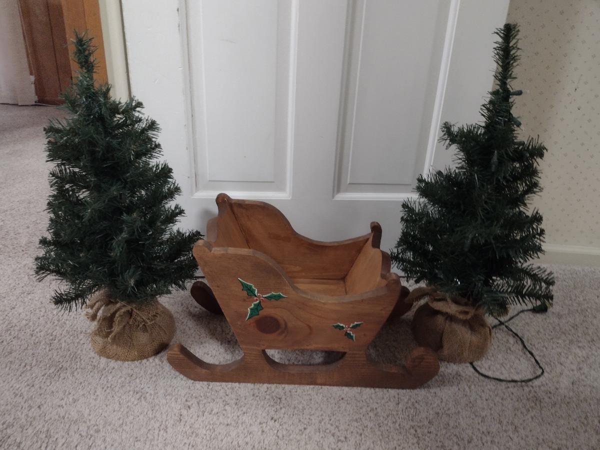 Pair of Small Lighted Trees and Wooden Sleigh. Lights on trees are untested.