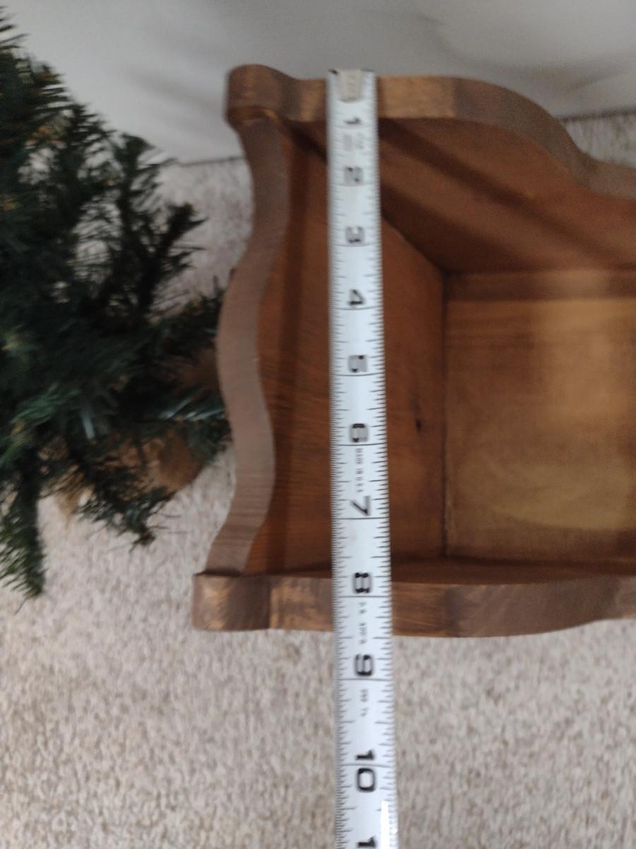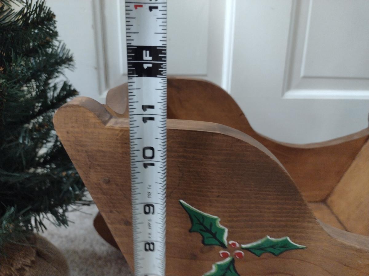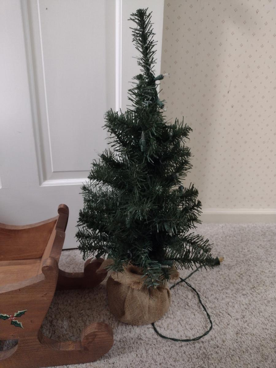 Pair of Small Lighted Trees and Wooden Sleigh. Lights on trees are untested.
