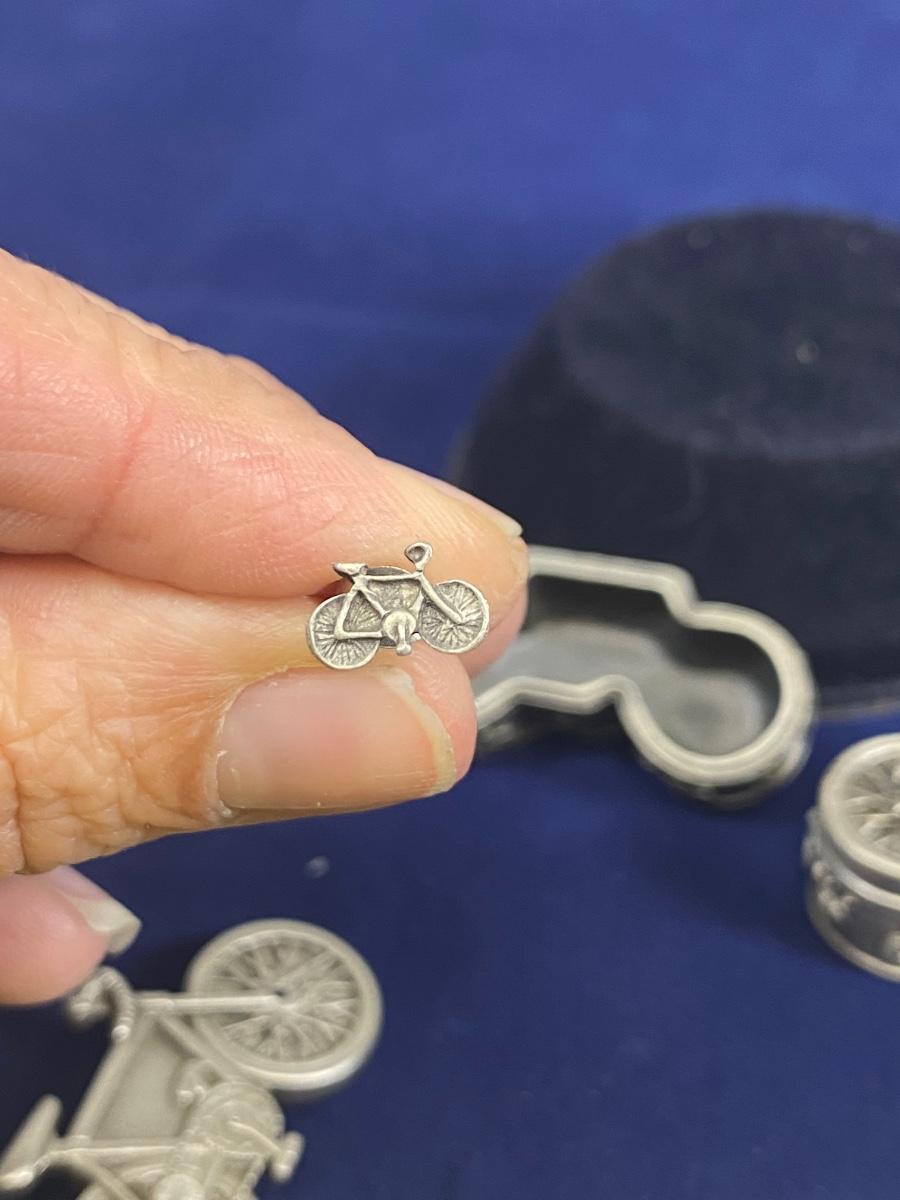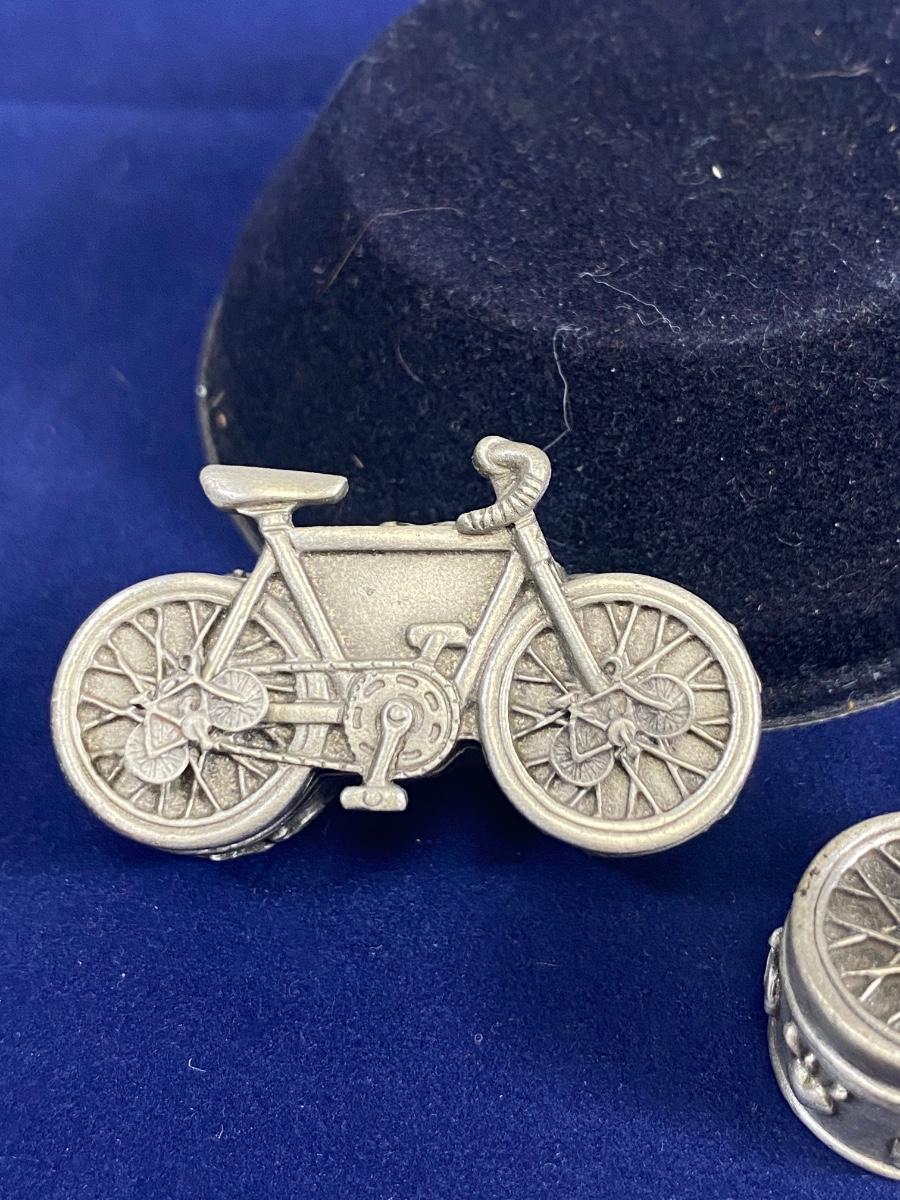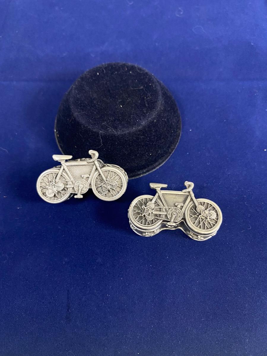 Pair of Small Pewter Bicycle Trinket Boxes with Bike Stud Earrings. Good condition.