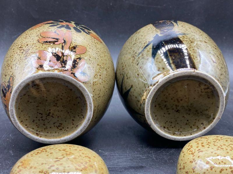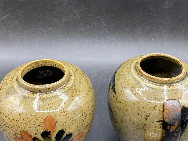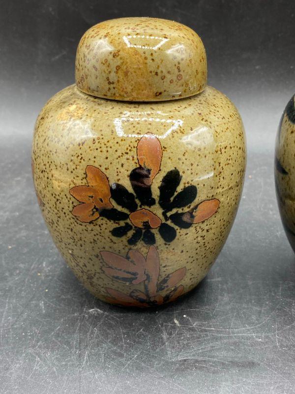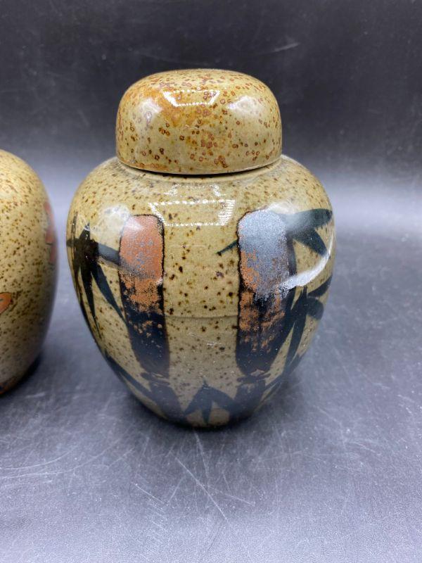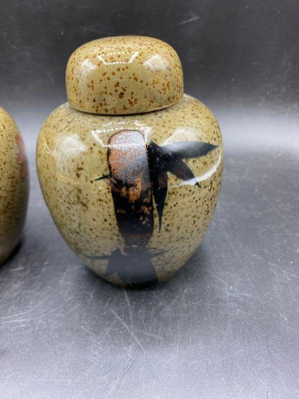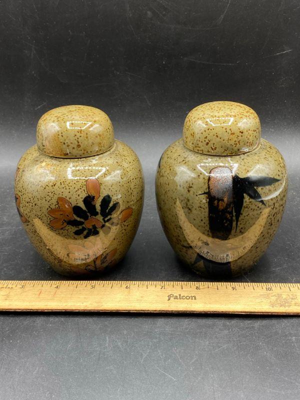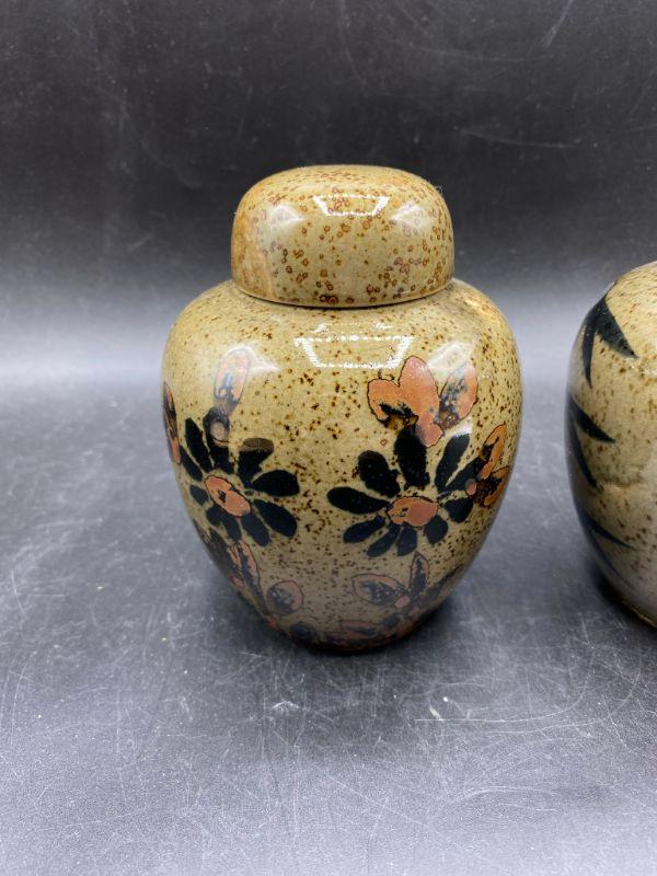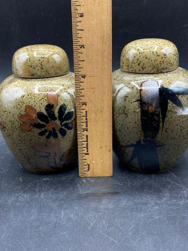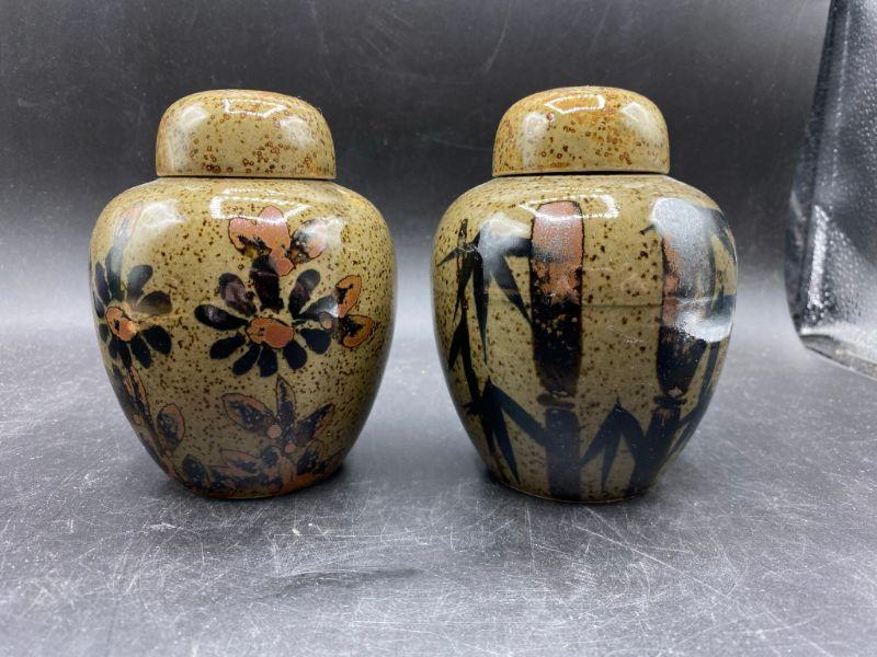 Pair of small ginger jars. Speckled pottery. One has flowers on it, the other has bamboo. Both display nicely. About 5" tall.