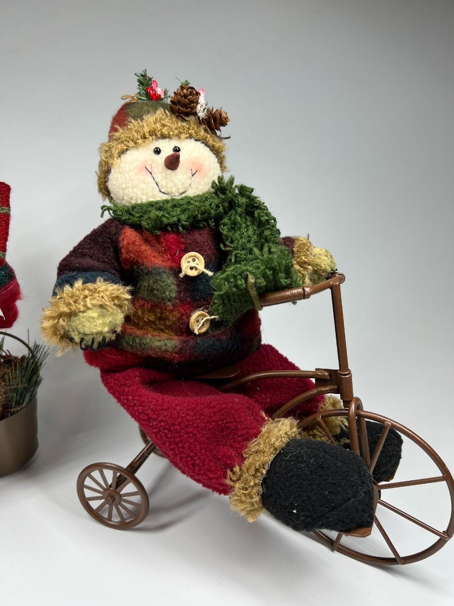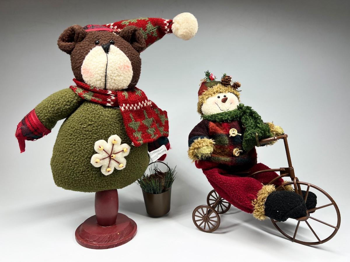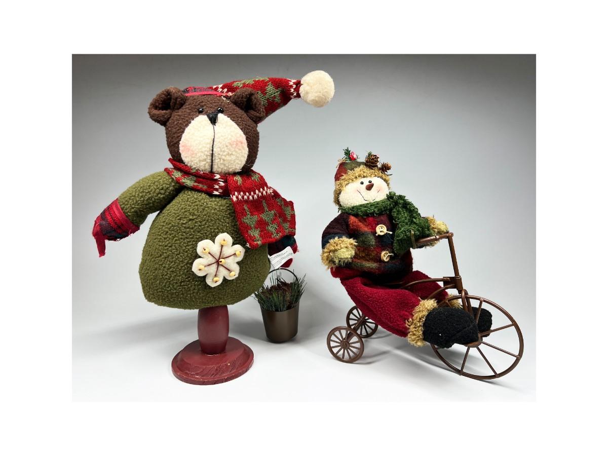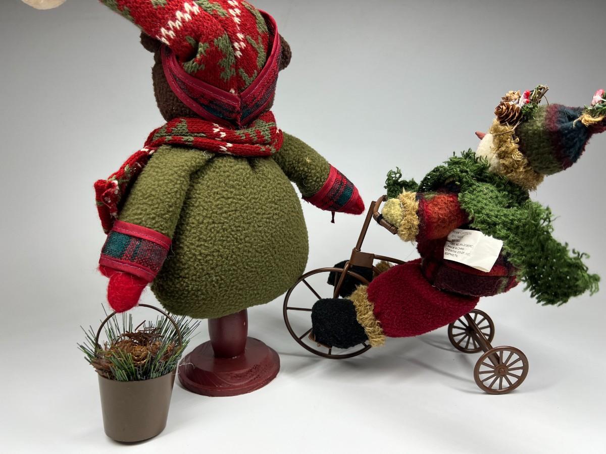 Pair of Soft Felt Christmas Holiday Decor Rustic Bear & Tricycle Riding Snowman