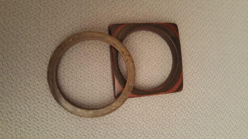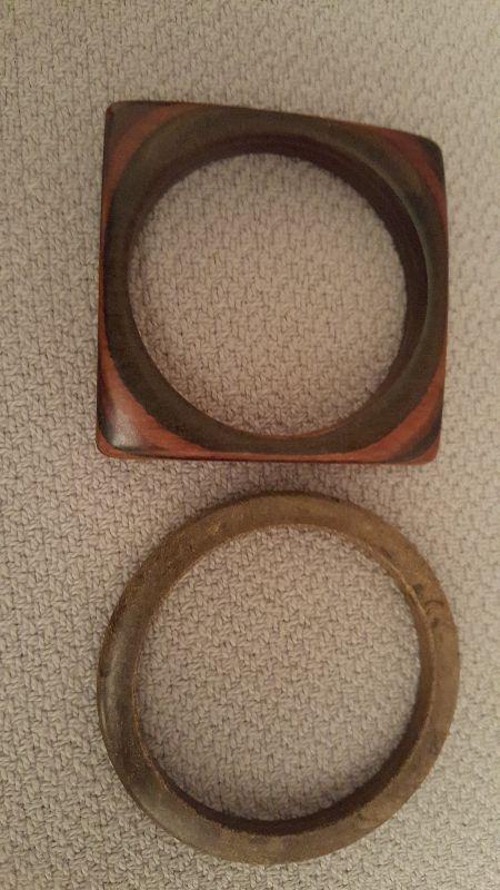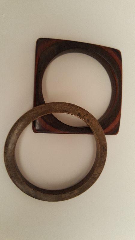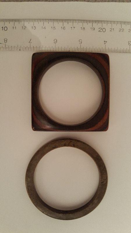 This auction lot is for a Pair of Solid Bracelets. One is sturdy plastic and the other is made from solid wood. Quite sheek and ready for some wrist bangling. The square bracelet measures about 3-inches square - see photos. Donated by Kay Whitlock.