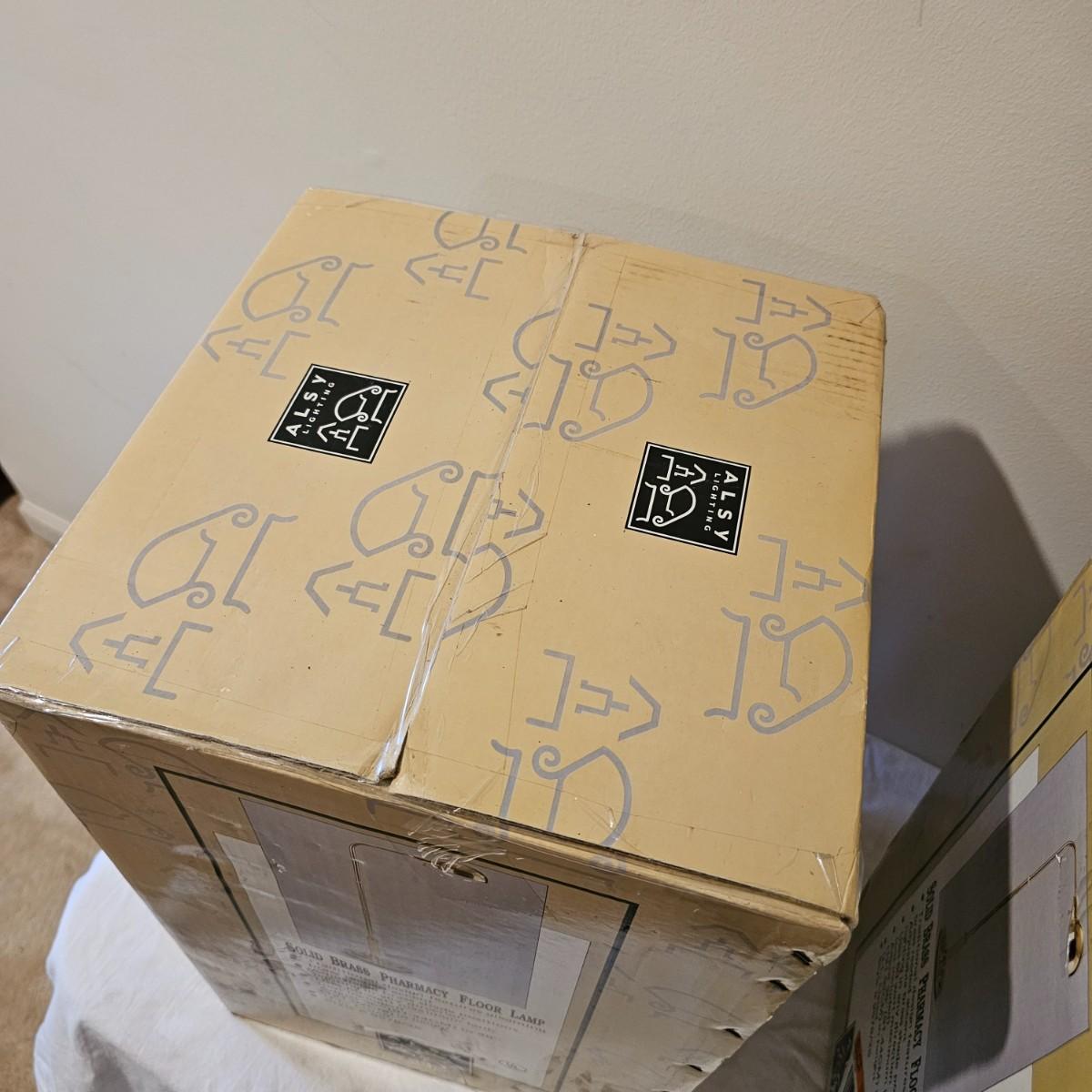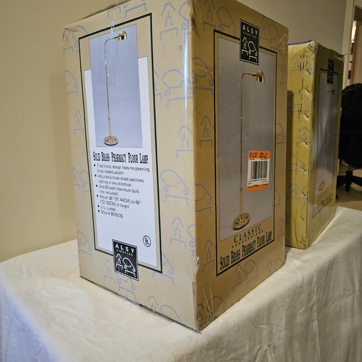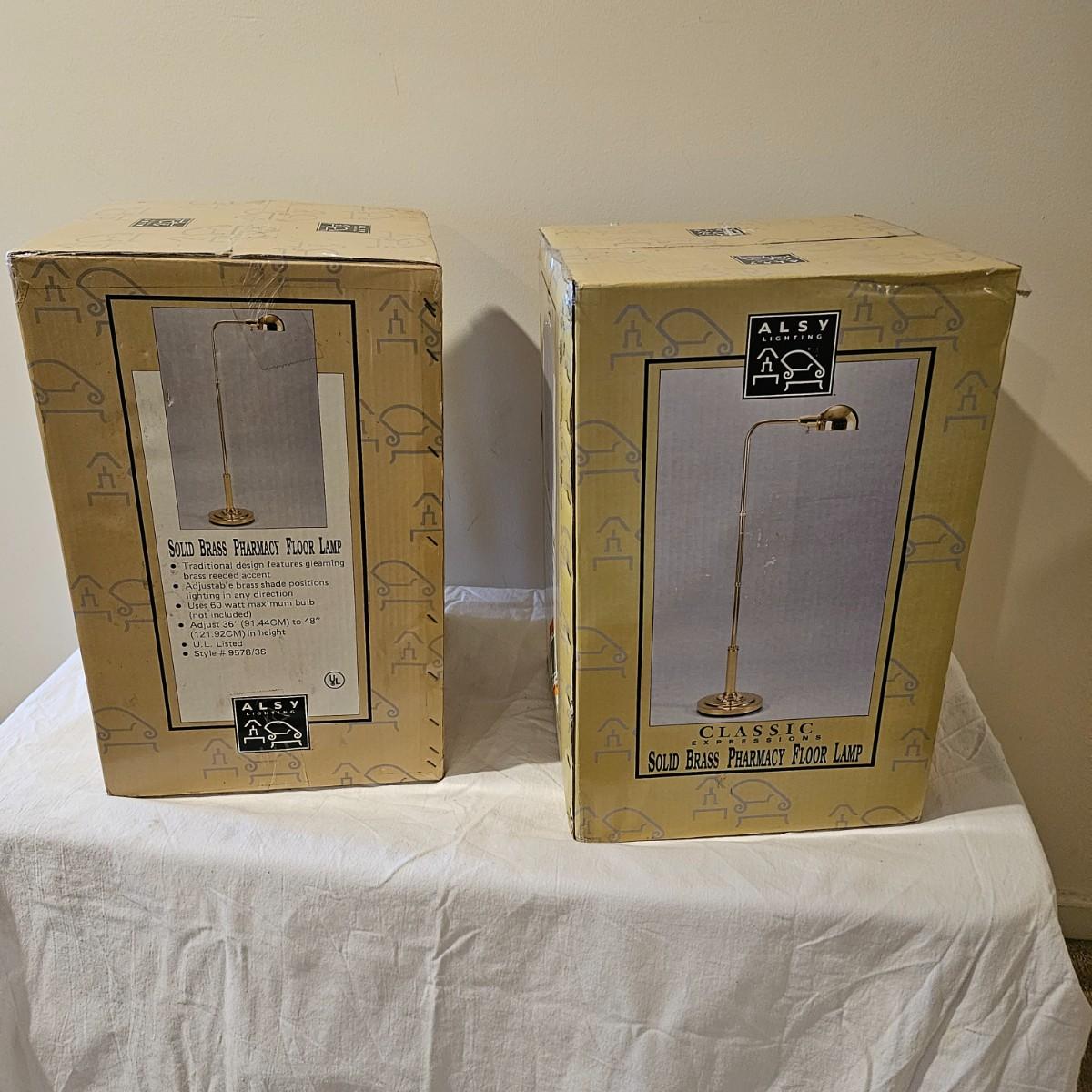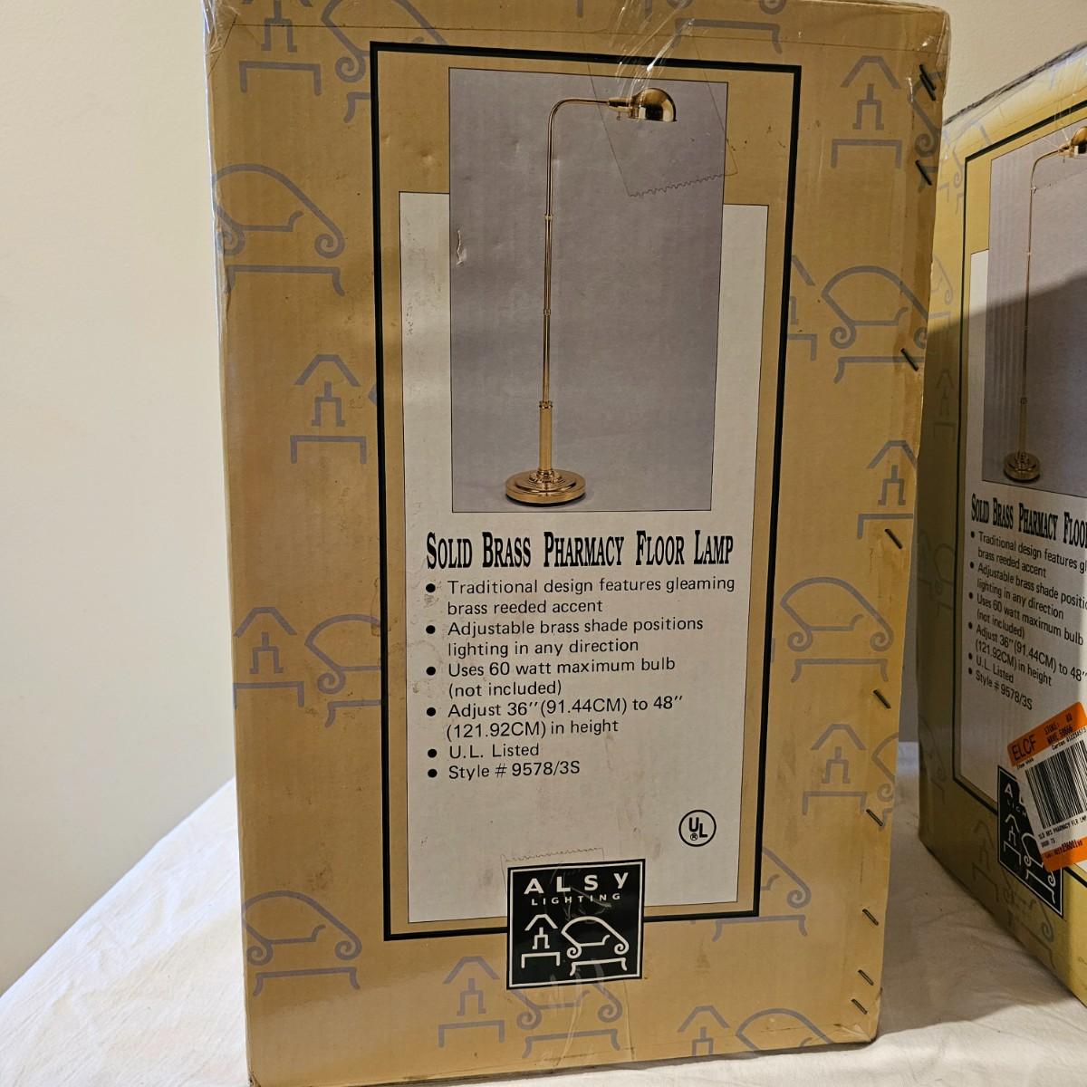 New in the box pair of floor lamps, solid brass pharmacy style. By Alsy lighting, these items have not been tested but are in sealed boxes. Adjustable height from 36" to 48". See photos for details. Shipping available.
