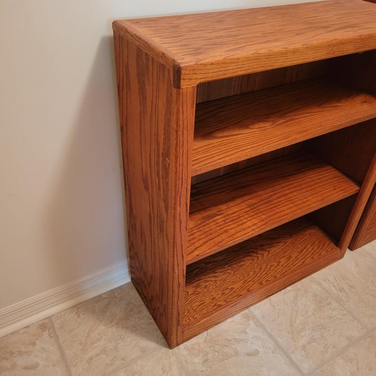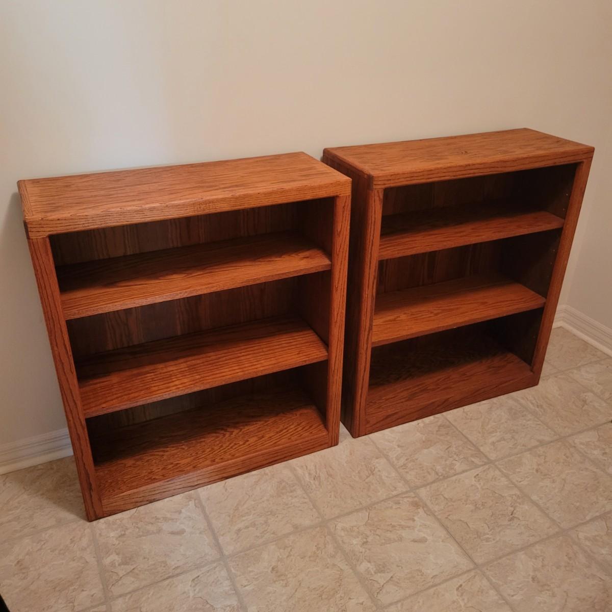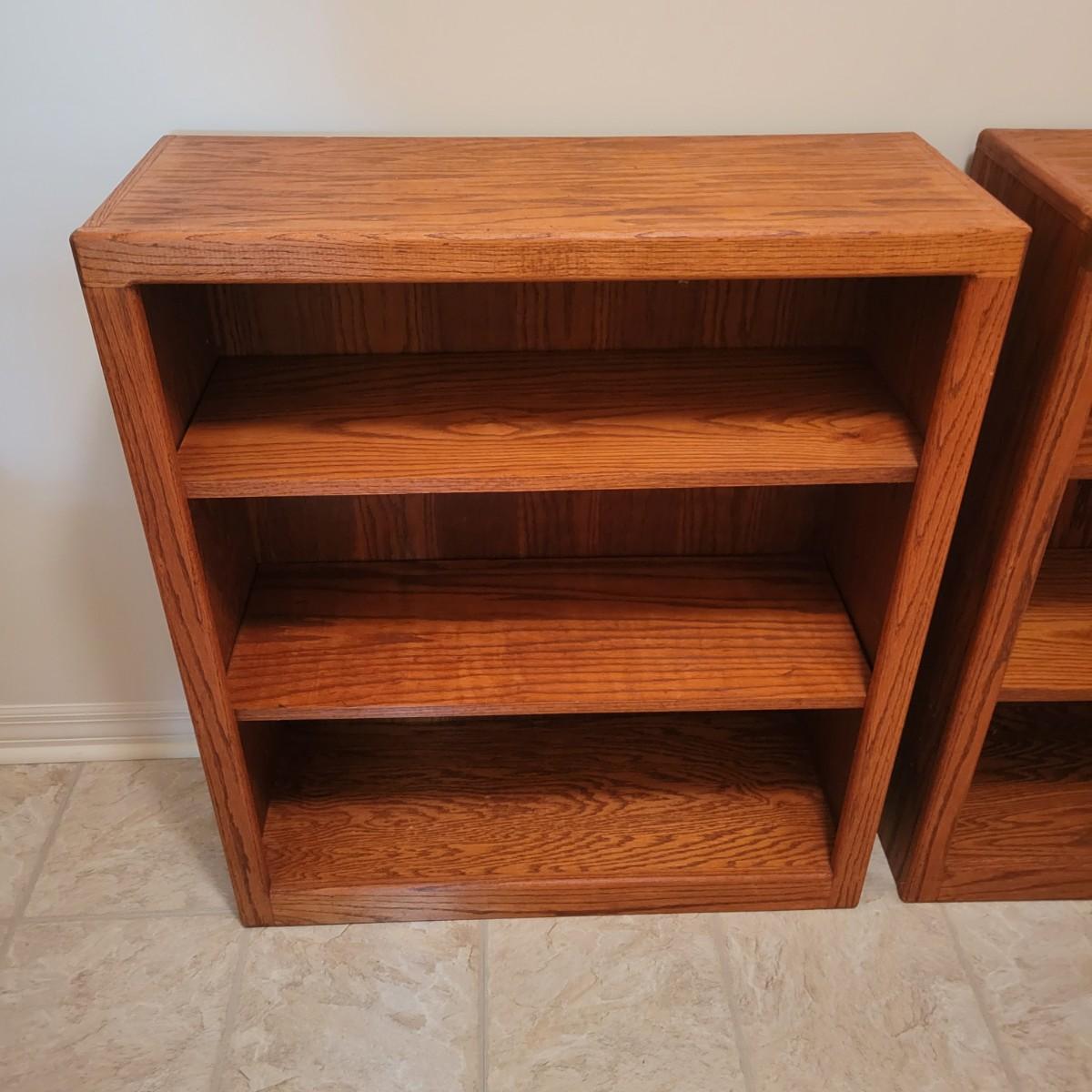 A pair of solid oak bookshelves that have two adjustable shelfs each. They measure approximately 32" x 12" x 36"H. Local pickup only. Winning bidder must bring assistance to help move and load this item due to its weight and/or size. Located in lower level of home. One flight of stairs.