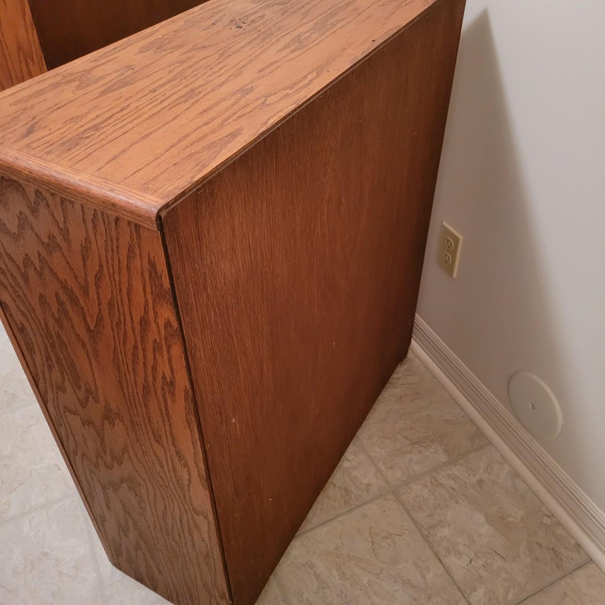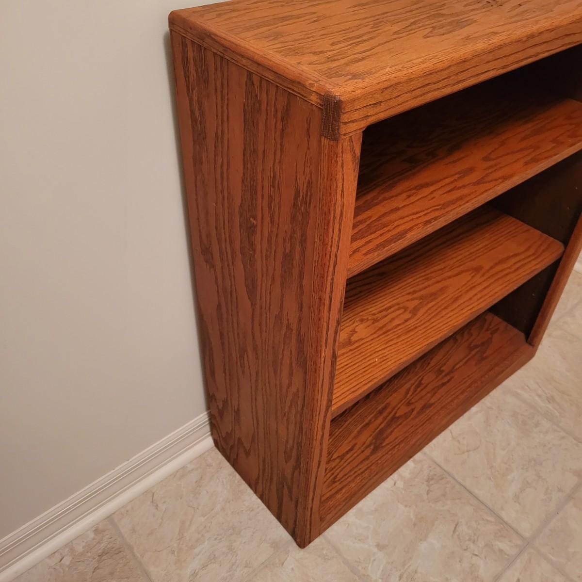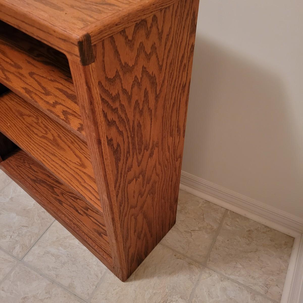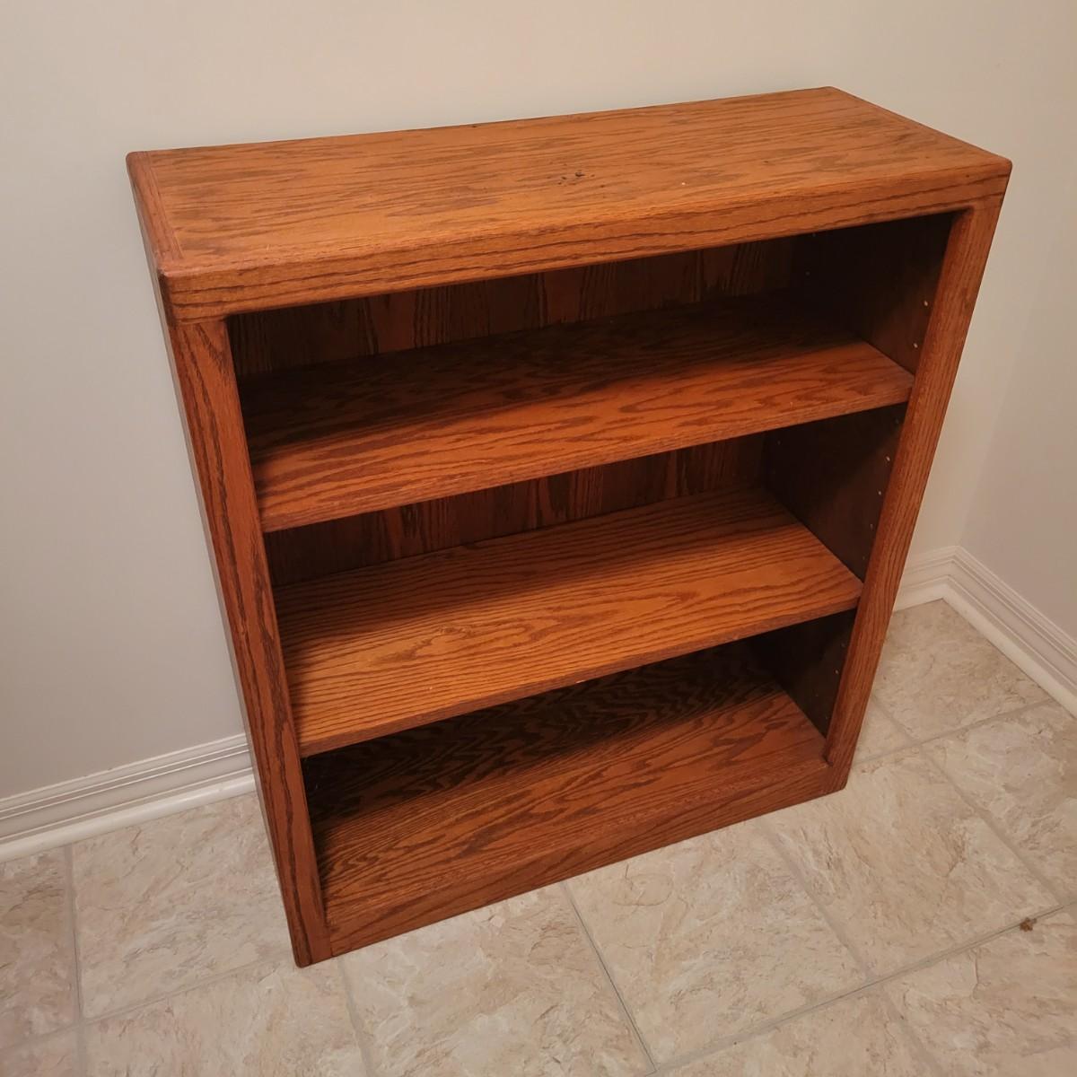 A pair of solid oak bookshelves that have two adjustable shelfs each. They measure approximately 32" x 12" x 36"H. Local pickup only. Winning bidder must bring assistance to help move and load this item due to its weight and/or size. Located in lower level of home. One flight of stairs.