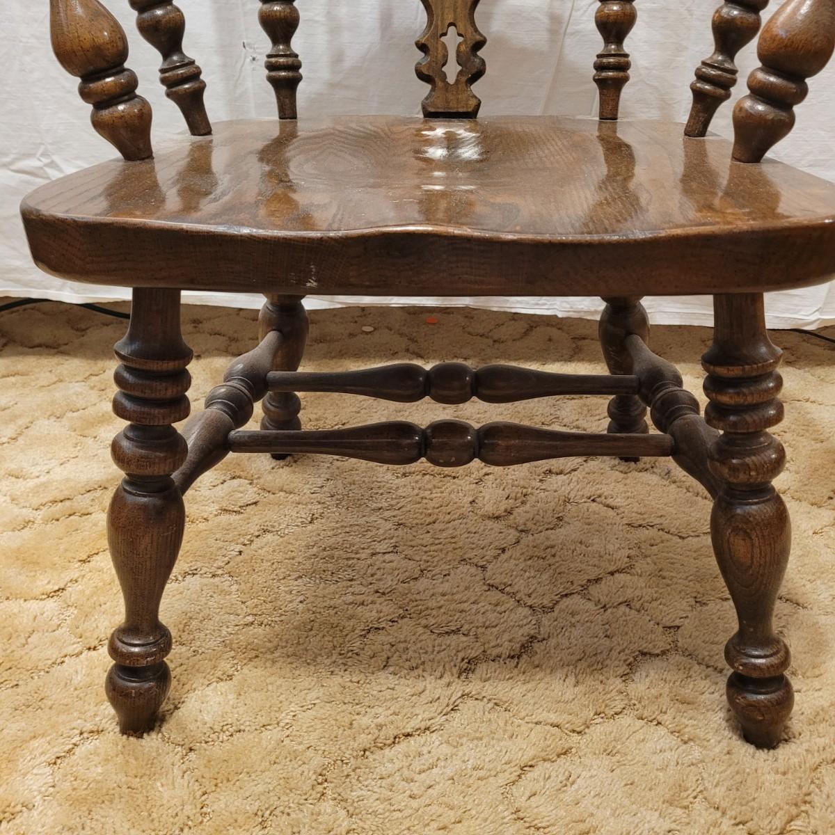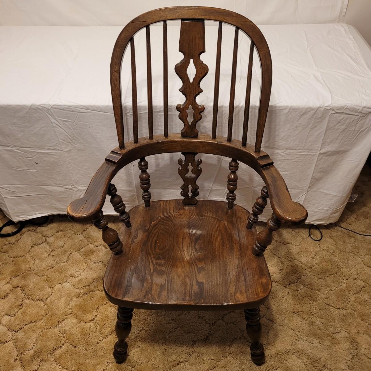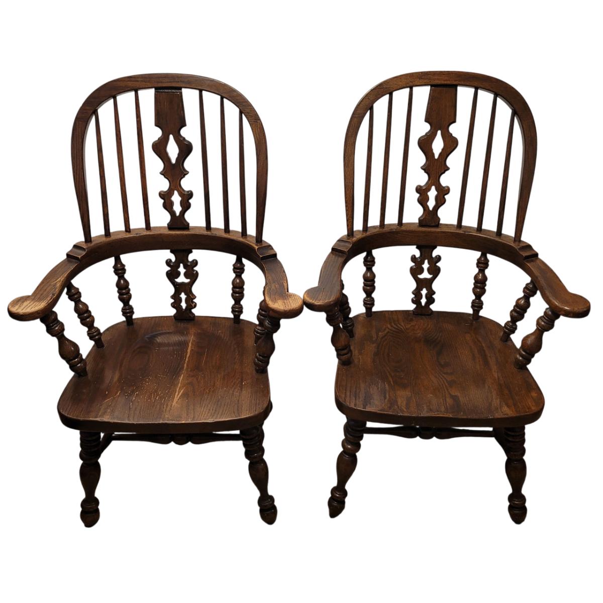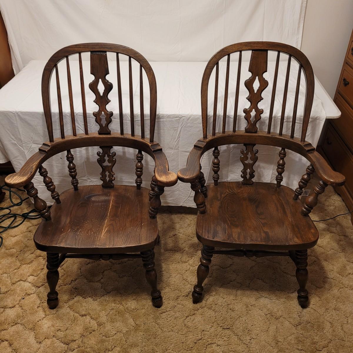 This lot includes a pair of matching solid wood armchairs. The armchairs are very solid and sturdy. They feature ornate carved wood pillars and arms. Individually, the chairs measure 27" x 21" x 42"H with a seat height of 17".